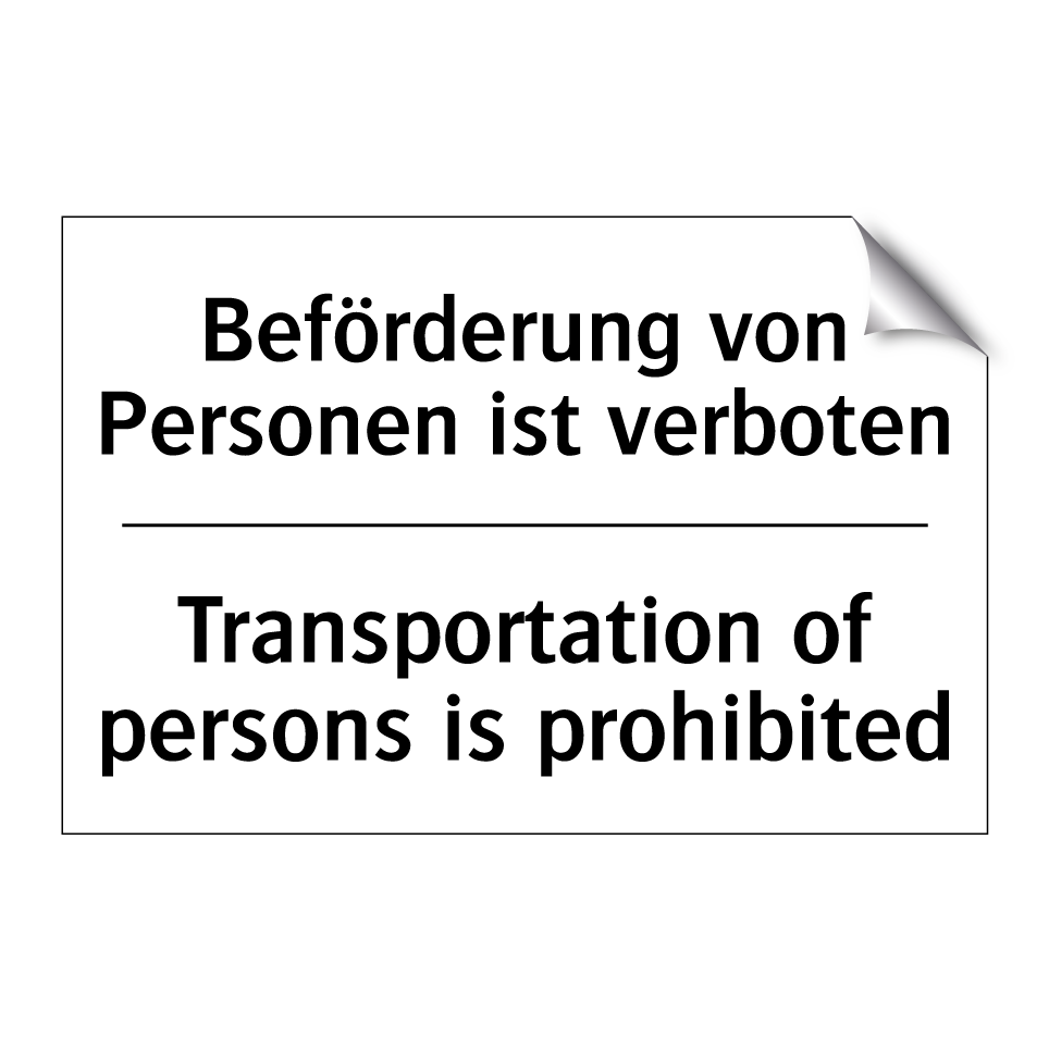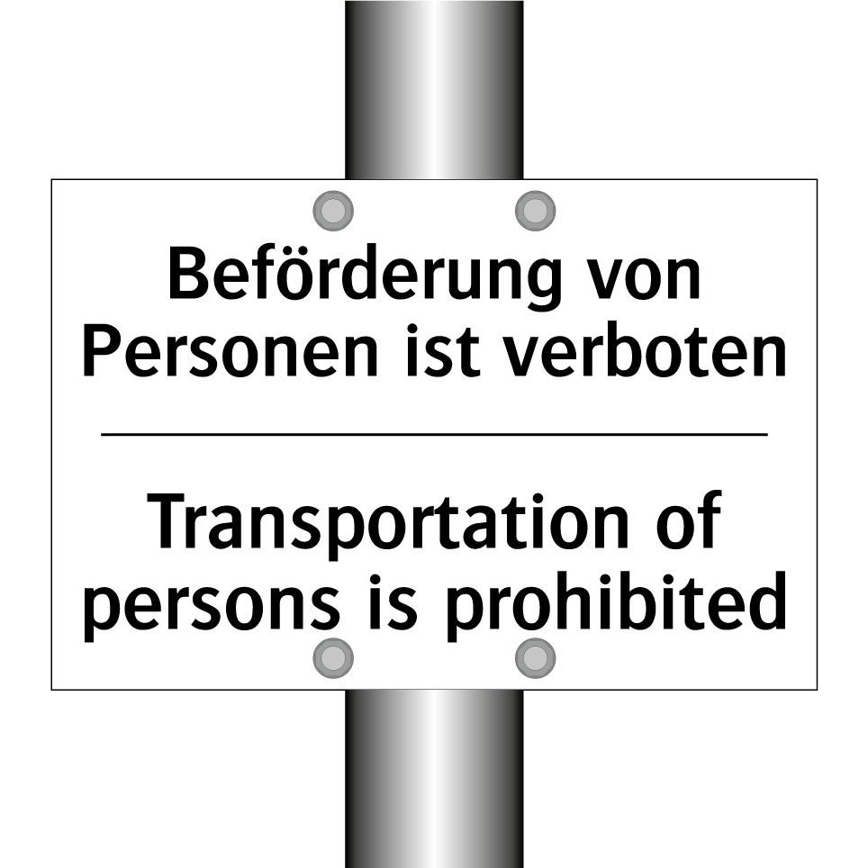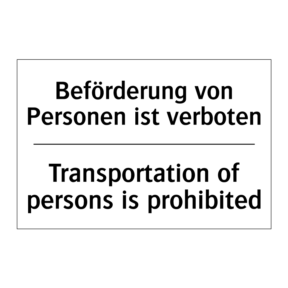 Zweisprachiges Verbotsschild mit deutschem Text Beförderung von Personen ist verboten und englischem Text Transportation of persons is prohibited