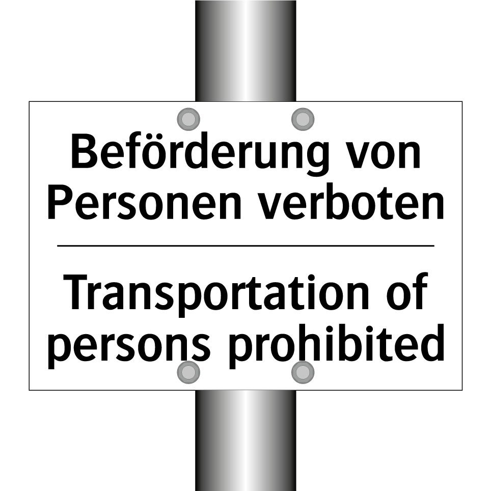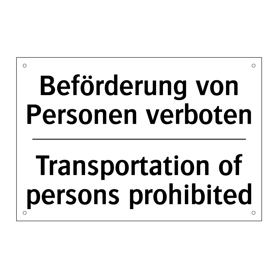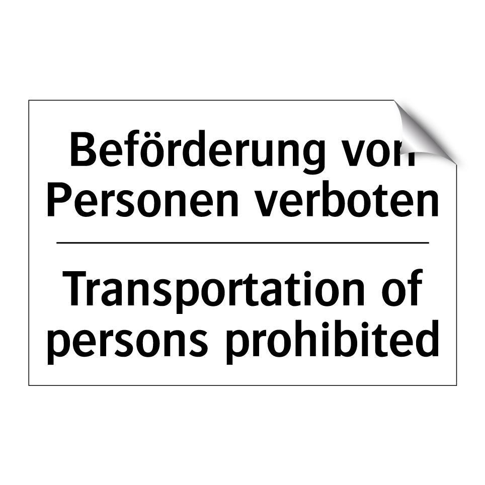 Zweisprachiges Verbotsschild mit deutschem Text Beförderung von Personen verboten und englischem Text Transportation of persons prohibited