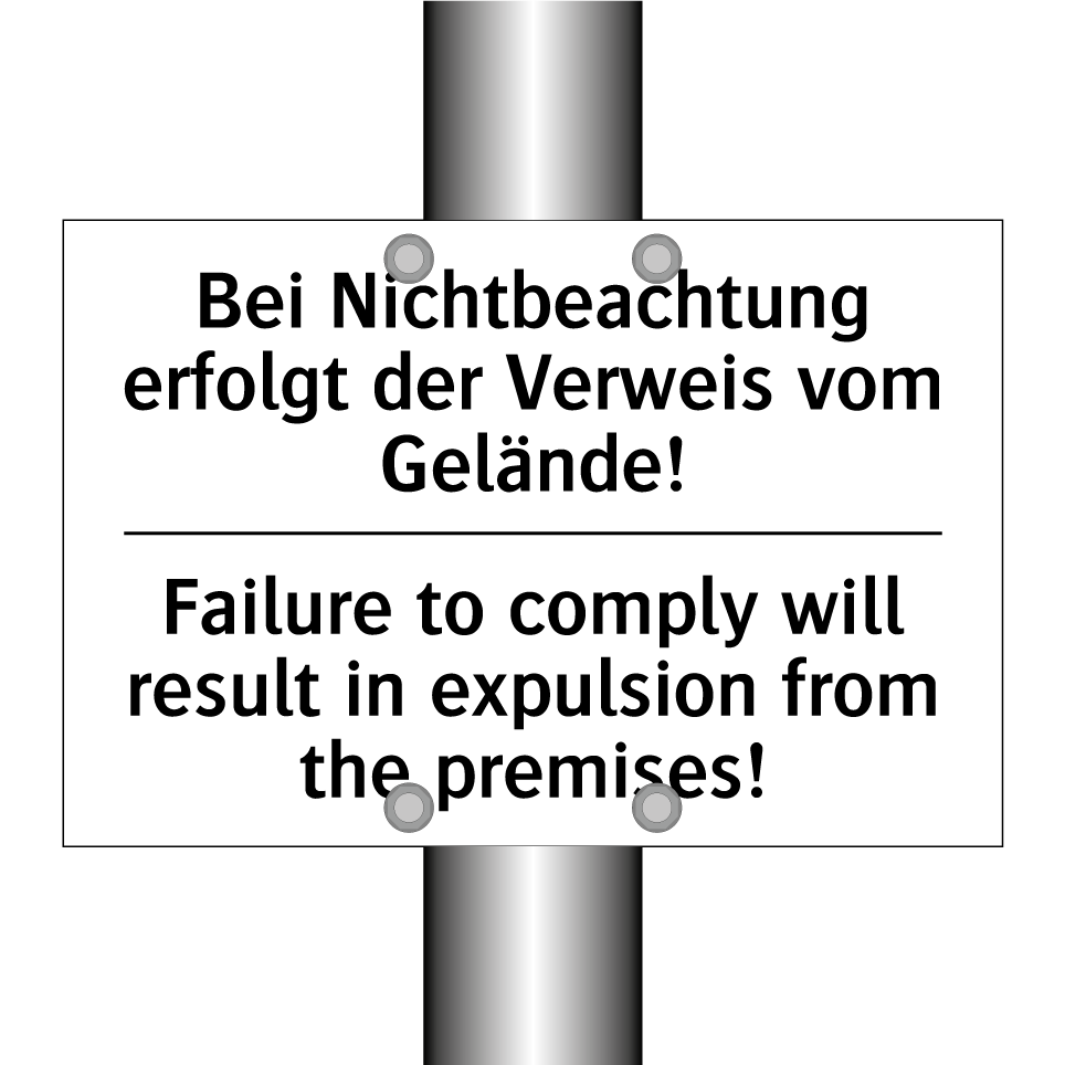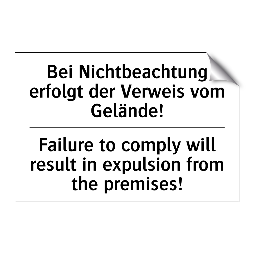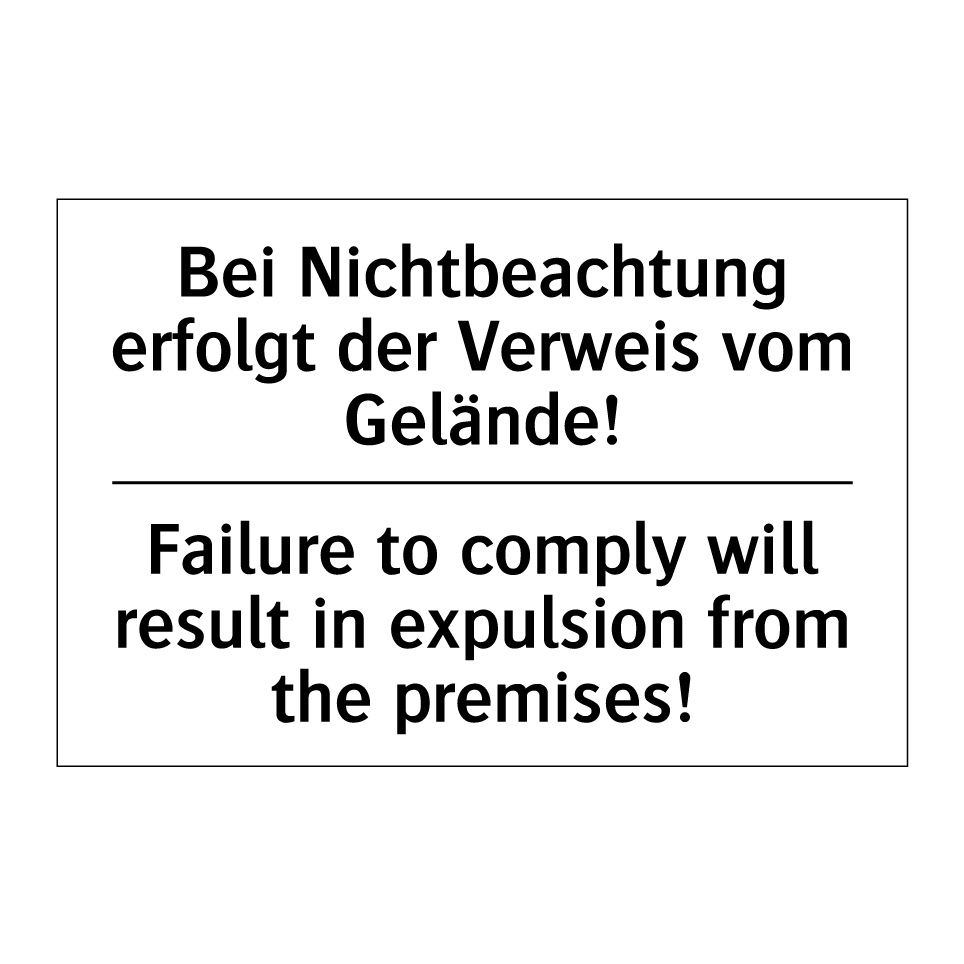 Zweisprachiges Verbotsschild mit deutschem Text Bei Nichtbeachtung erfolgt der Verweis vom Gelände! und englischem Text Failure to comply will result in expulsion from the premises!
