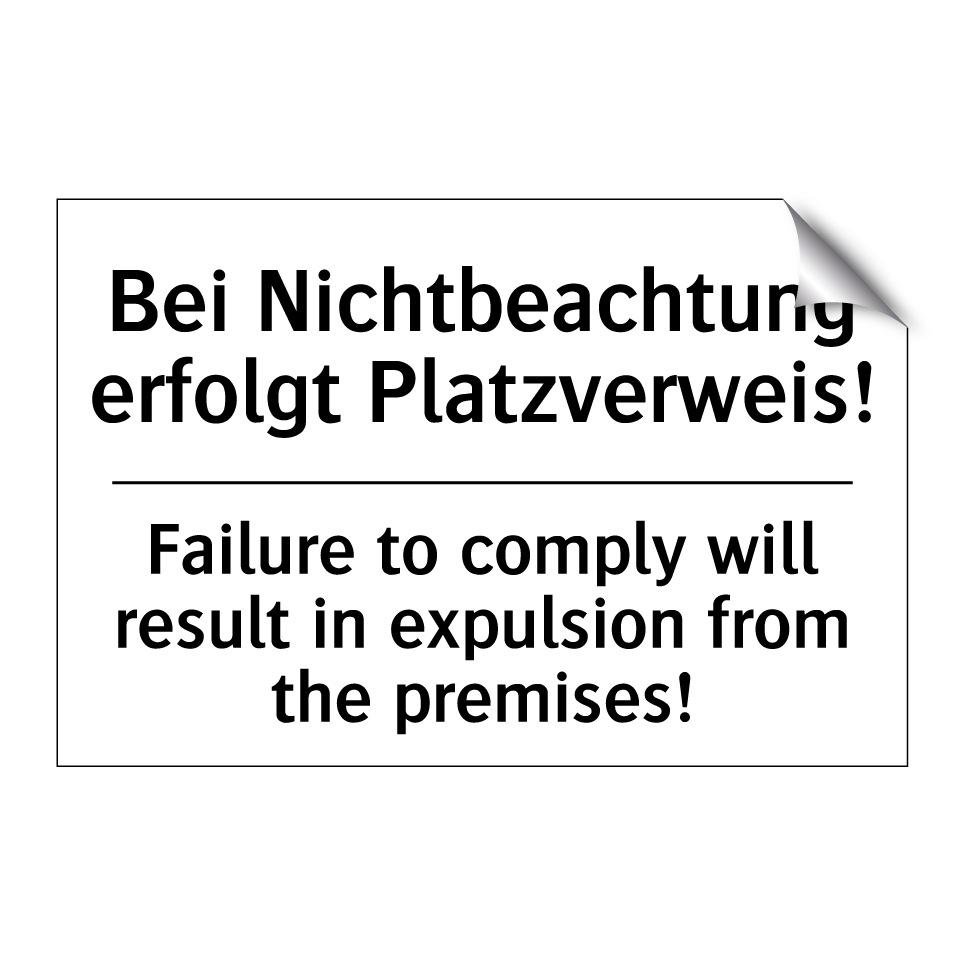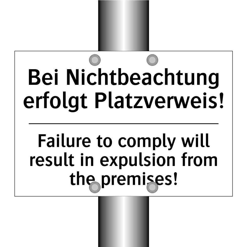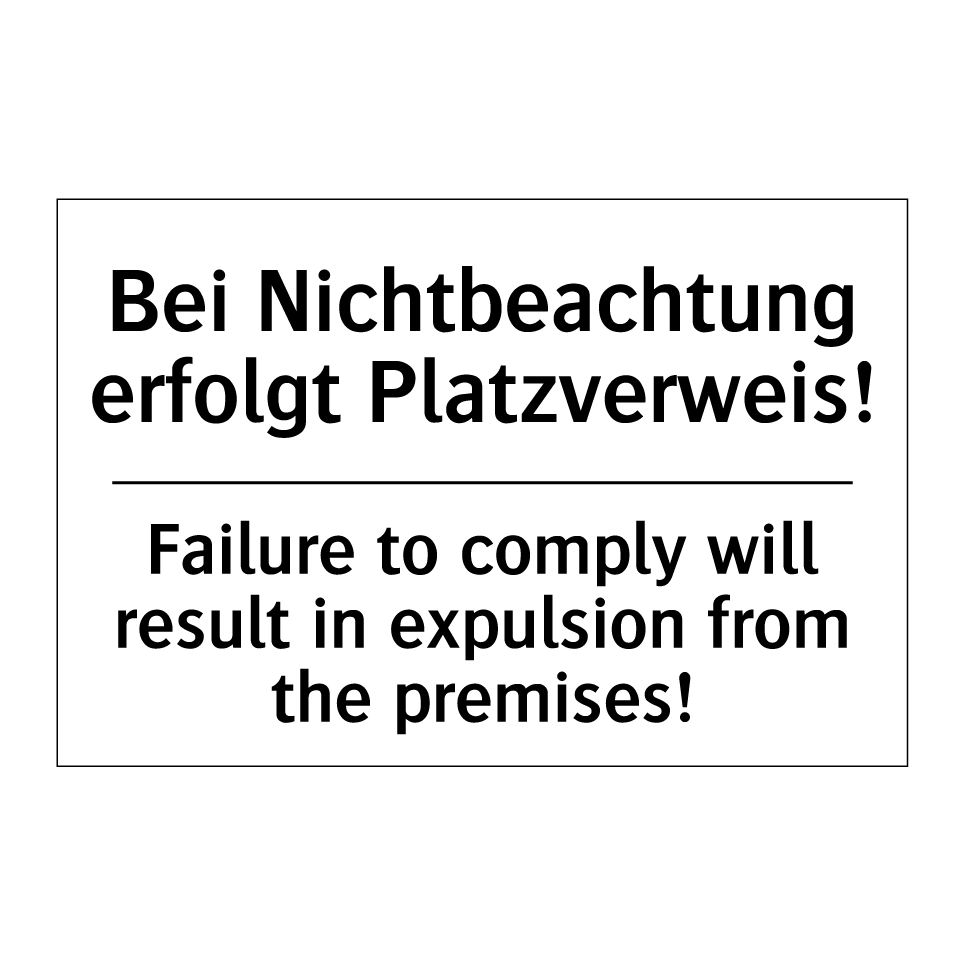 Zweisprachiges Verbotsschild mit deutschem Text Bei Nichtbeachtung erfolgt Platzverweis! und englischem Text Failure to comply will result in expulsion from the premises!