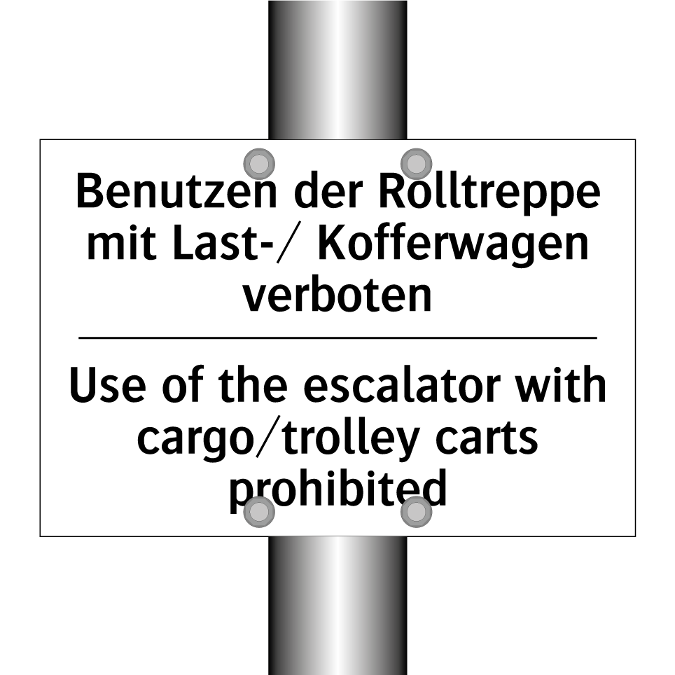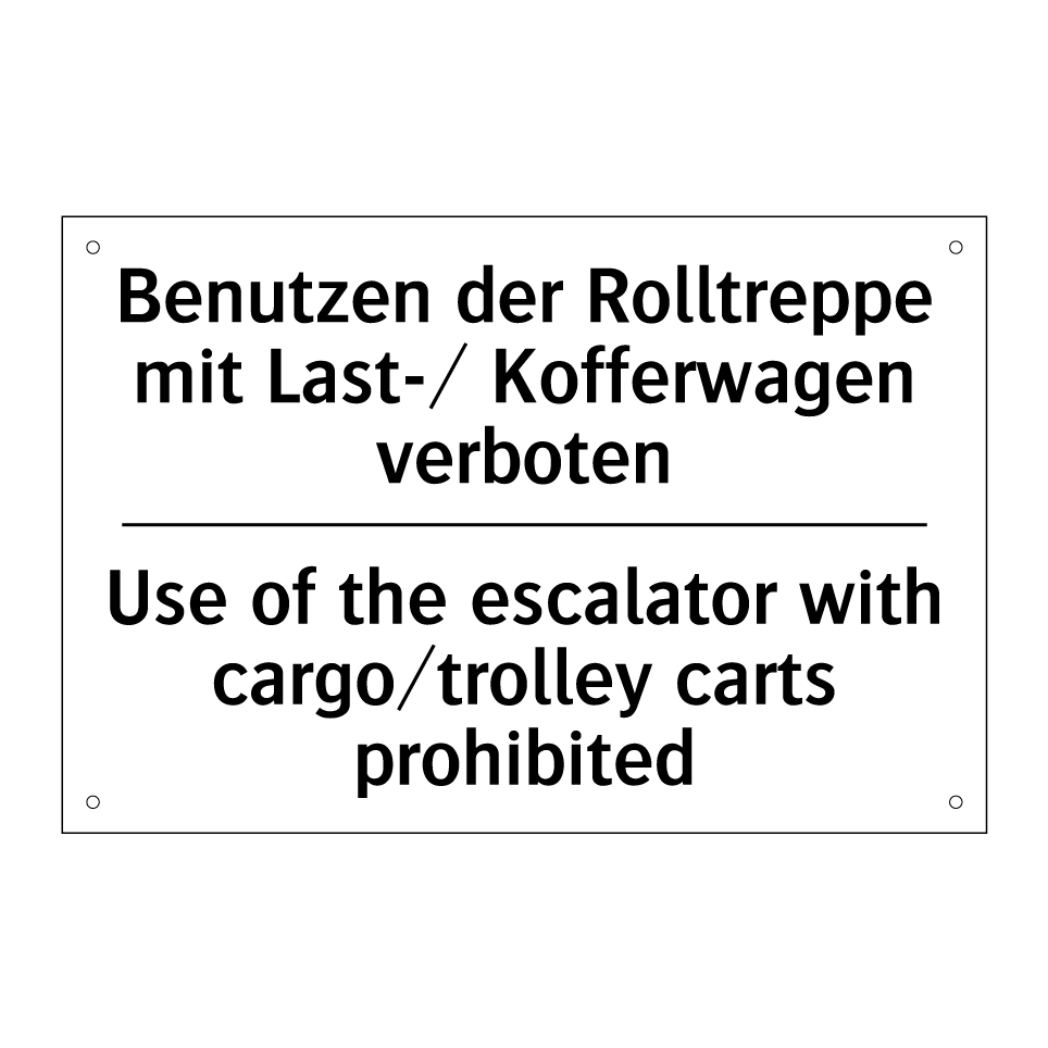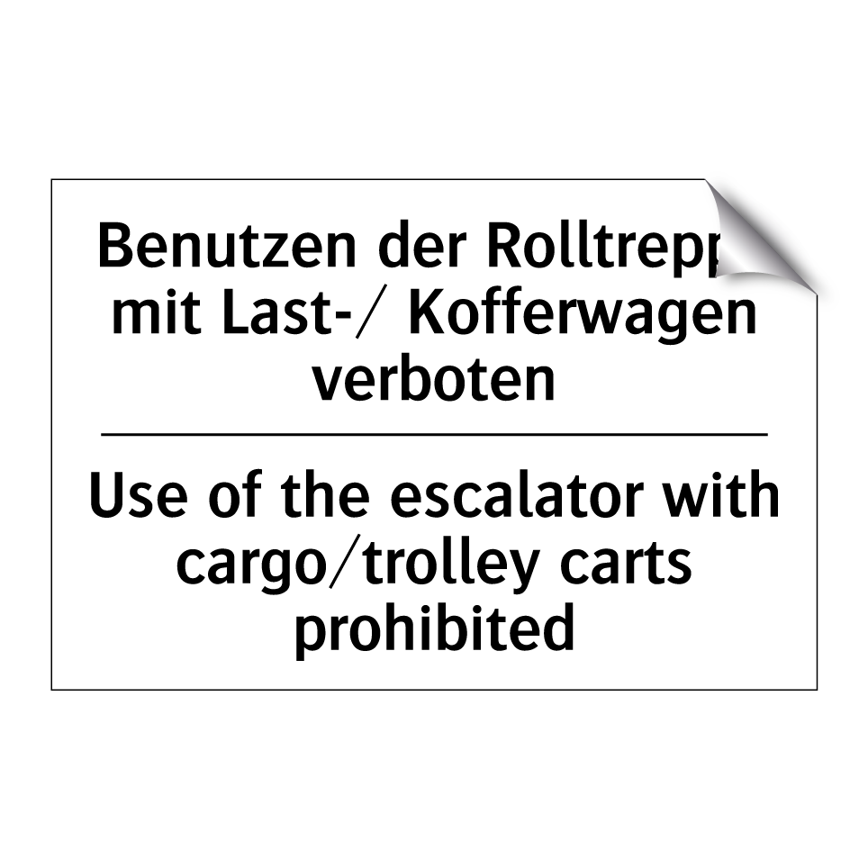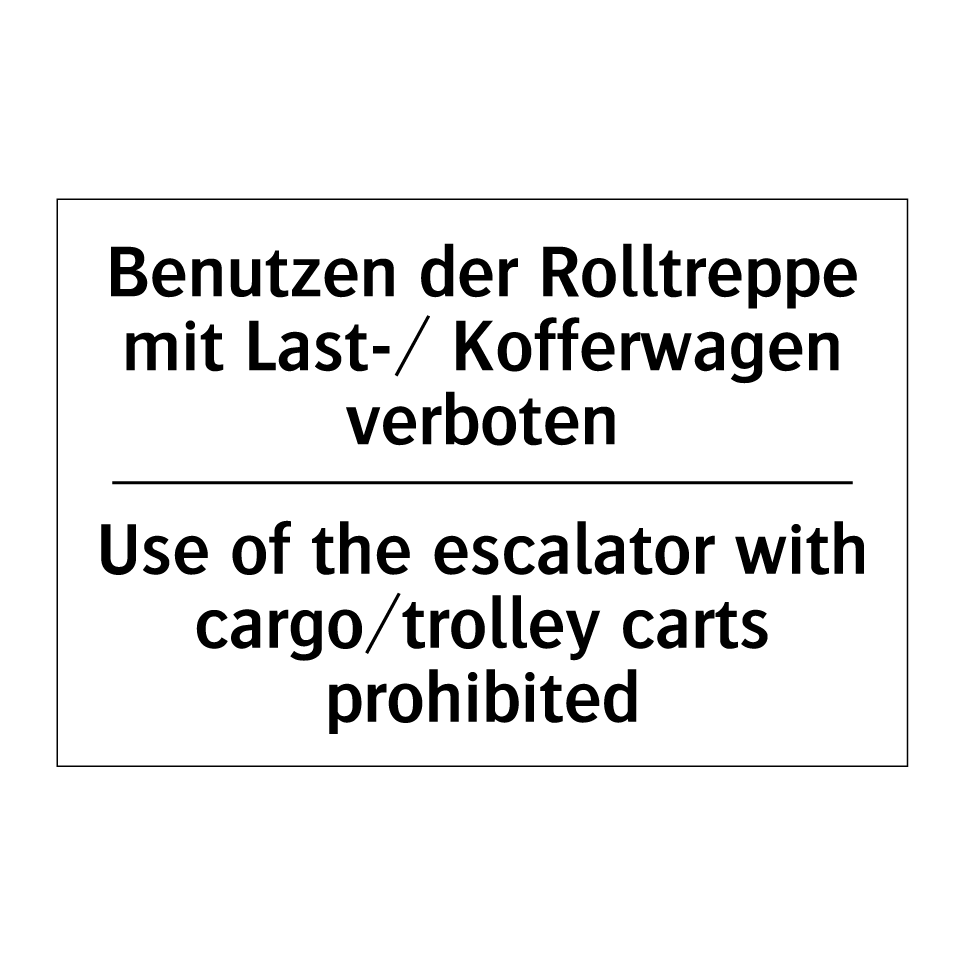 Zweisprachiges Verbotsschild mit deutschem Text Benutzen der Rolltreppe mit Last-/ Kofferwagen verboten und englischem Text Use of the escalator with cargo/trolley carts prohibited