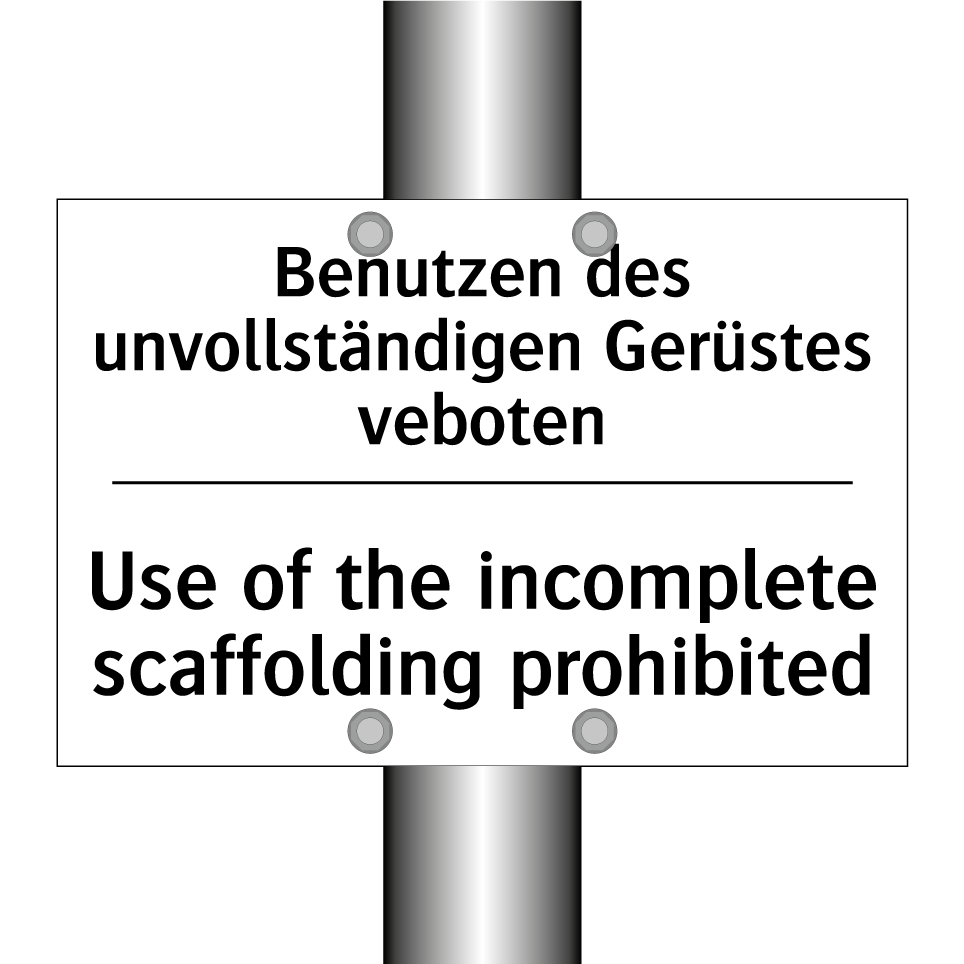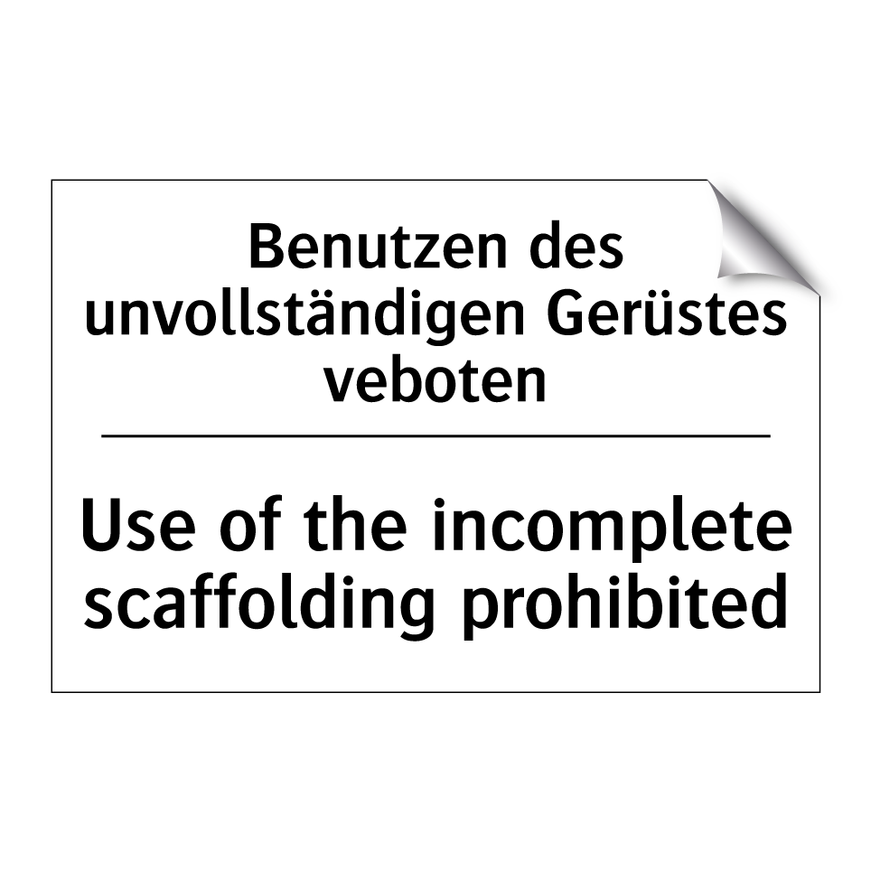 Zweisprachiges Verbotsschild mit deutschem Text Benutzen des unvollständigen Gerüstes veboten und englischem Text Use of the incomplete scaffolding prohibited