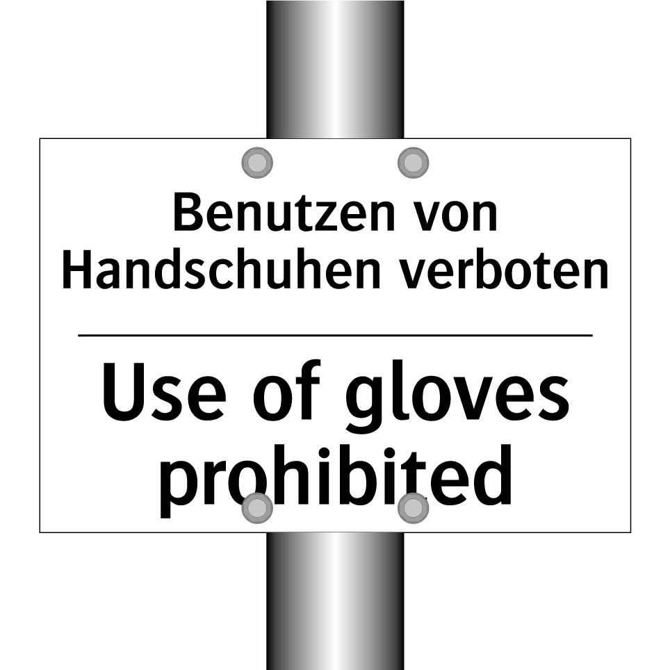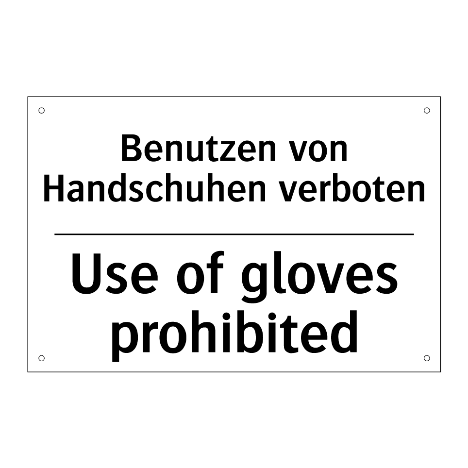 Zweisprachiges Verbotsschild mit deutschem Text Benutzen von Handschuhen verboten und englischem Text Use of gloves prohibited