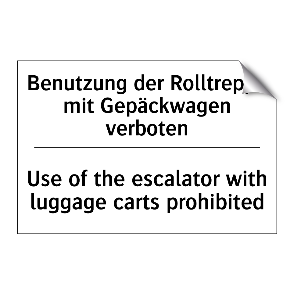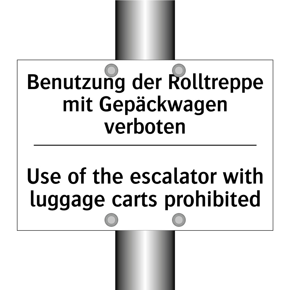 Zweisprachiges Verbotsschild mit deutschem Text Benutzung der Rolltreppe mit Gepäckwagen verboten und englischem Text Use of the escalator with luggage carts prohibited