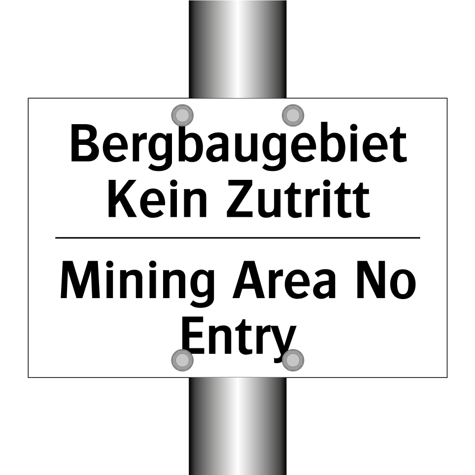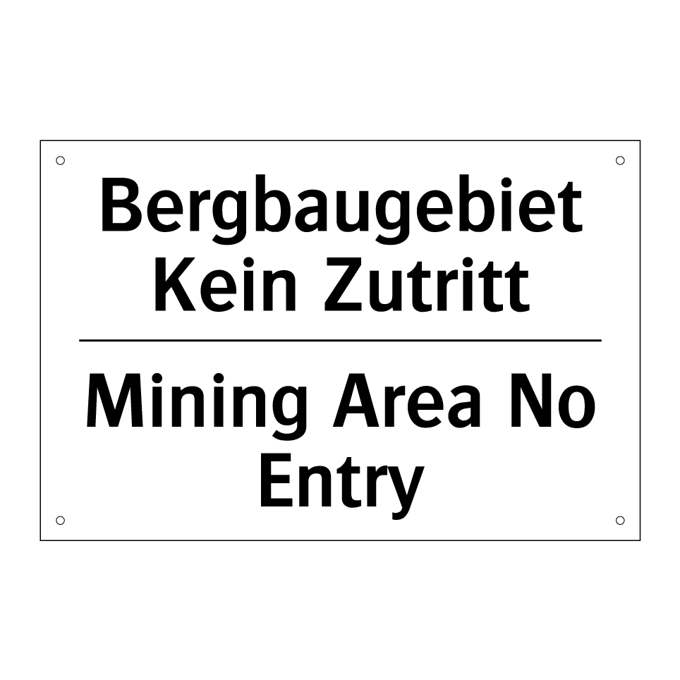 Zweisprachiges Verbotsschild mit deutschem Text Bergbaugebiet Kein Zutritt und englischem Text Mining Area No Entry