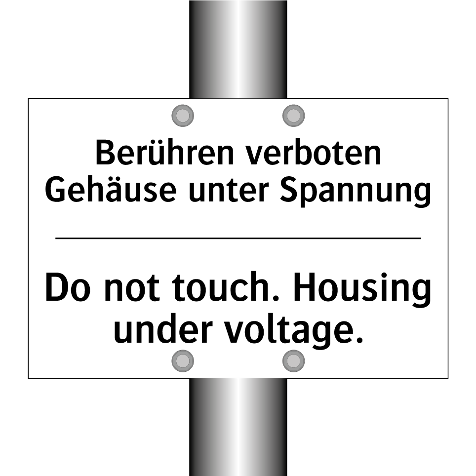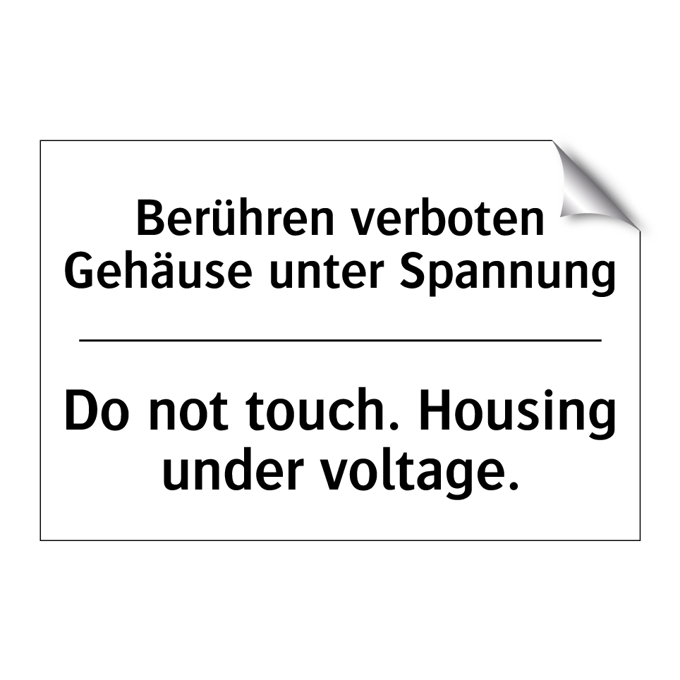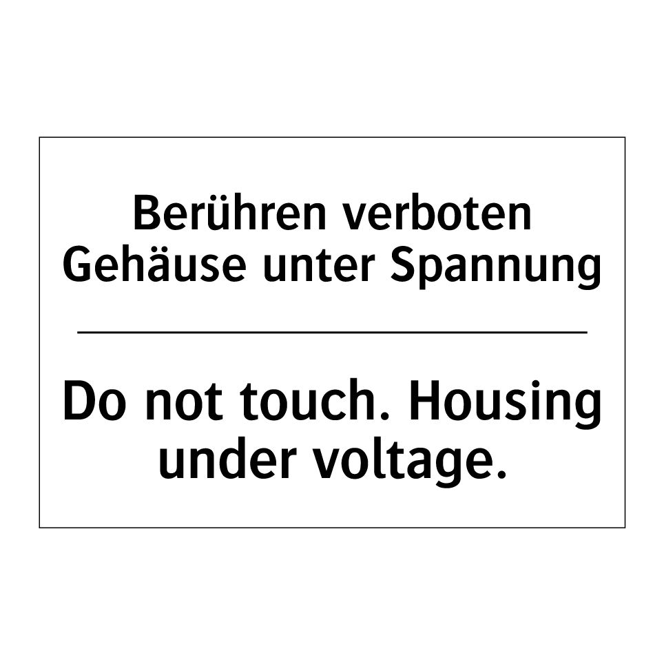 Zweisprachiges Verbotsschild mit deutschem Text Berühren verboten Gehäuse unter Spannung und englischem Text Do not touch. Housing under voltage.