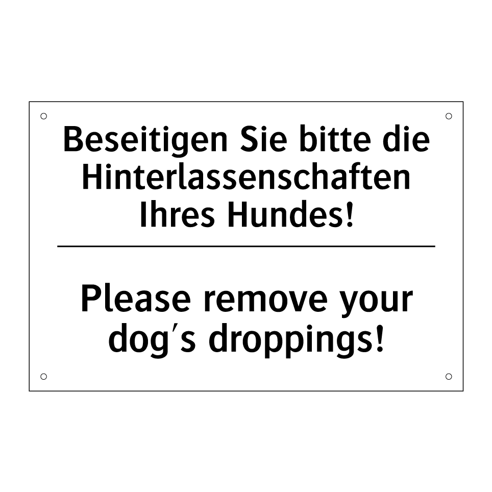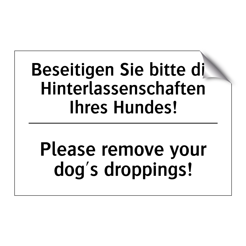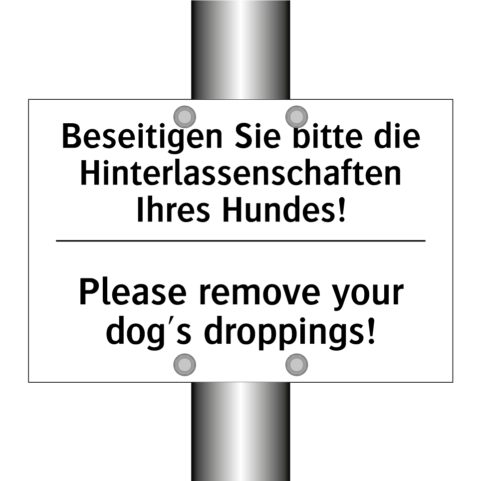 Zweisprachiges Verbotsschild mit deutschem Text Beseitigen Sie bitte die Hinterlassenschaften Ihres Hundes! und englischem Text Please remove your dog's droppings!
