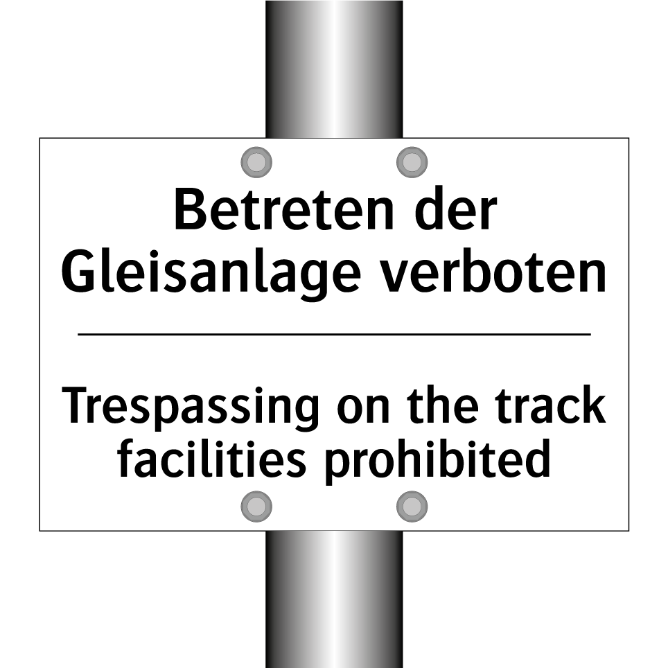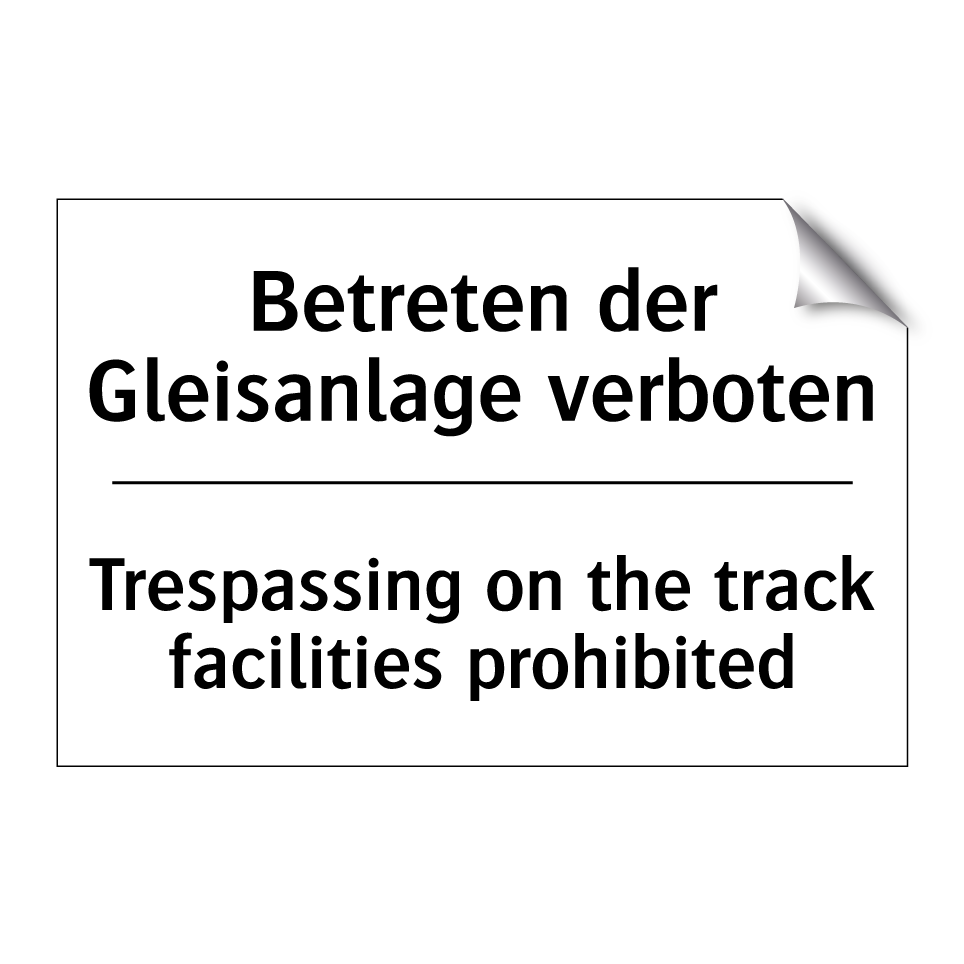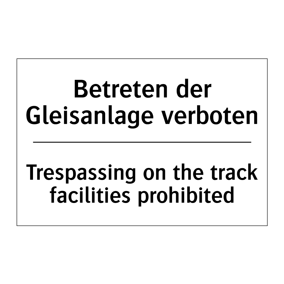 Zweisprachiges Verbotsschild mit deutschem Text Betreten der Gleisanlage verboten und englischem Text Trespassing on the track facilities prohibited