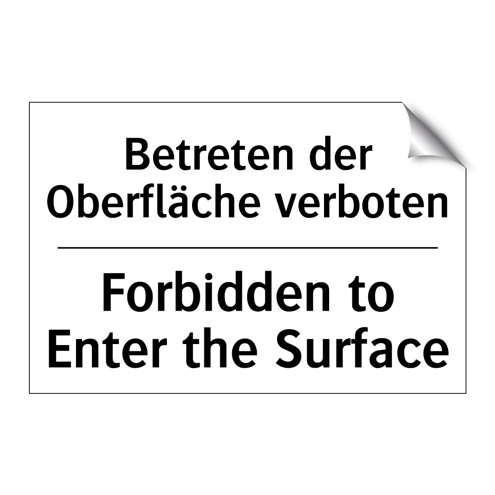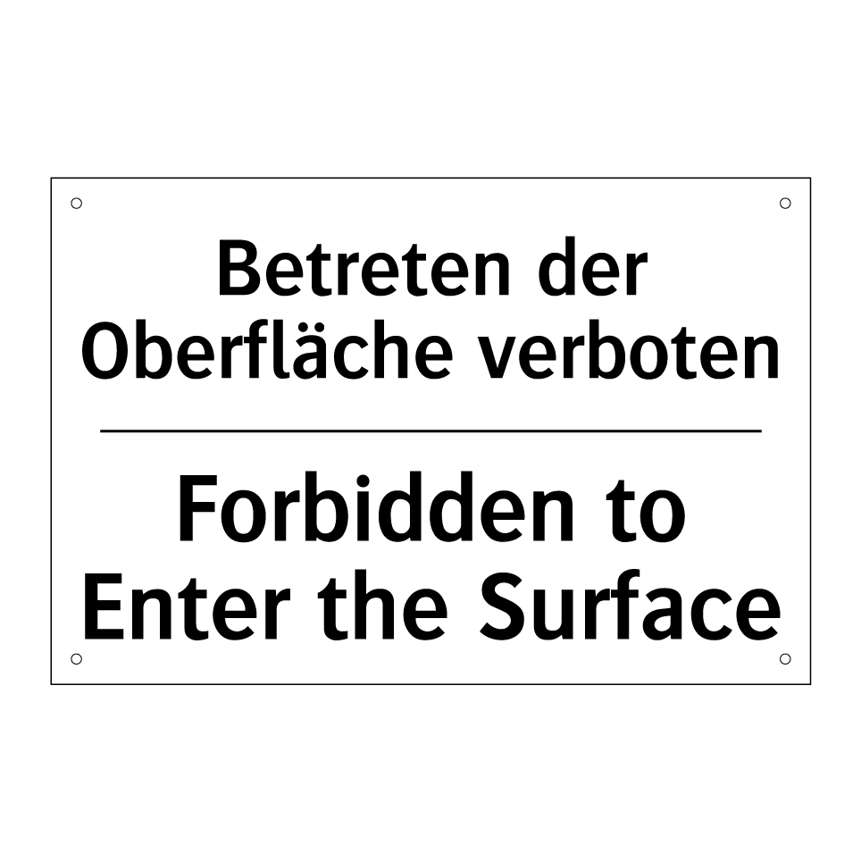 Zweisprachiges Verbotsschild mit deutschem Text Betreten der Oberfläche verboten und englischem Text Forbidden to Enter the Surface