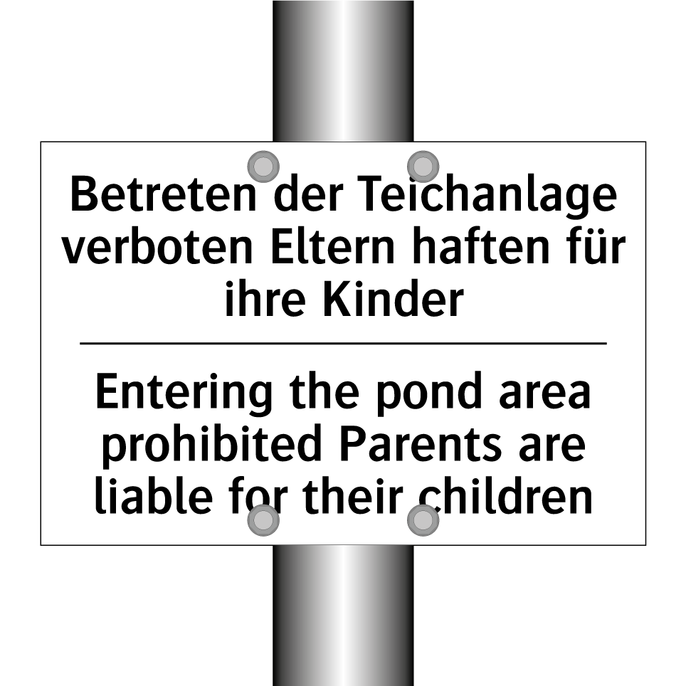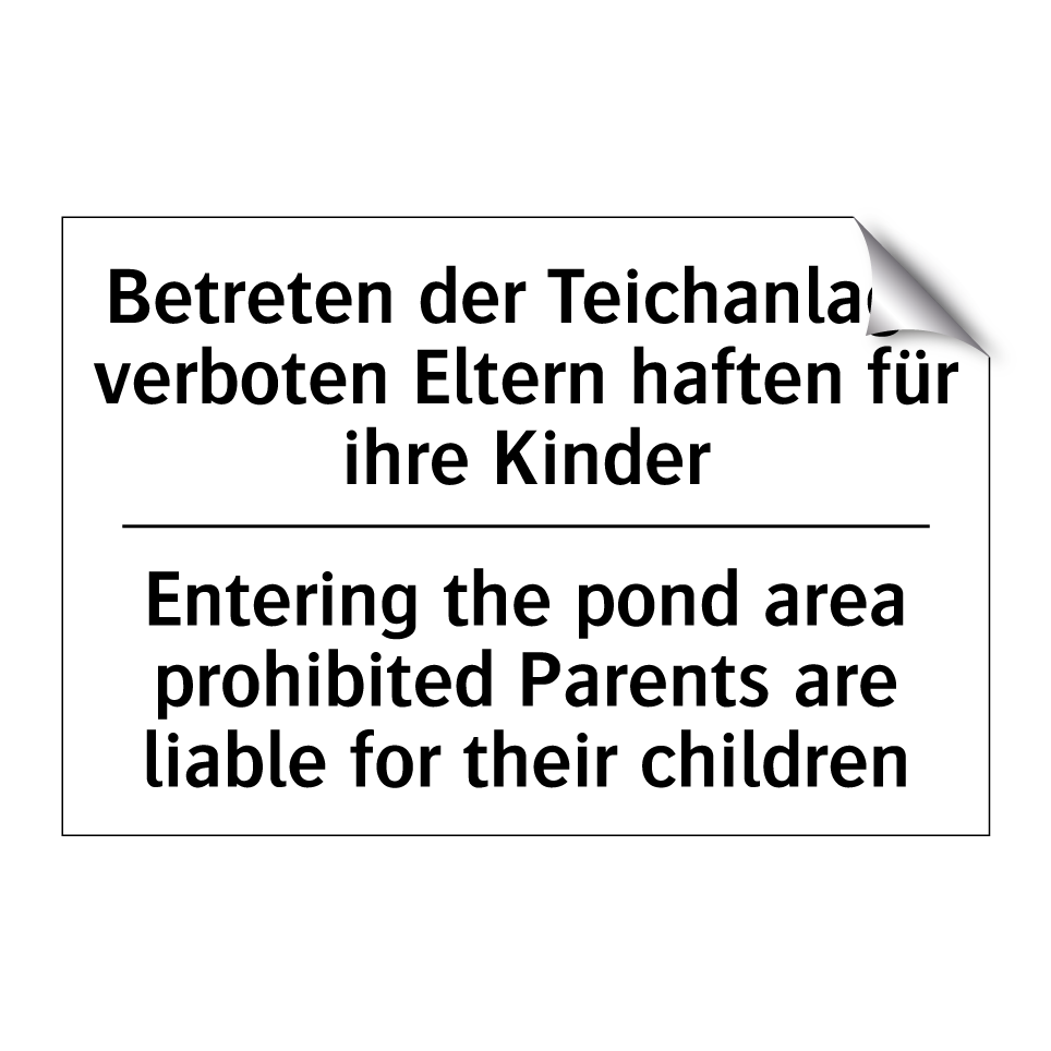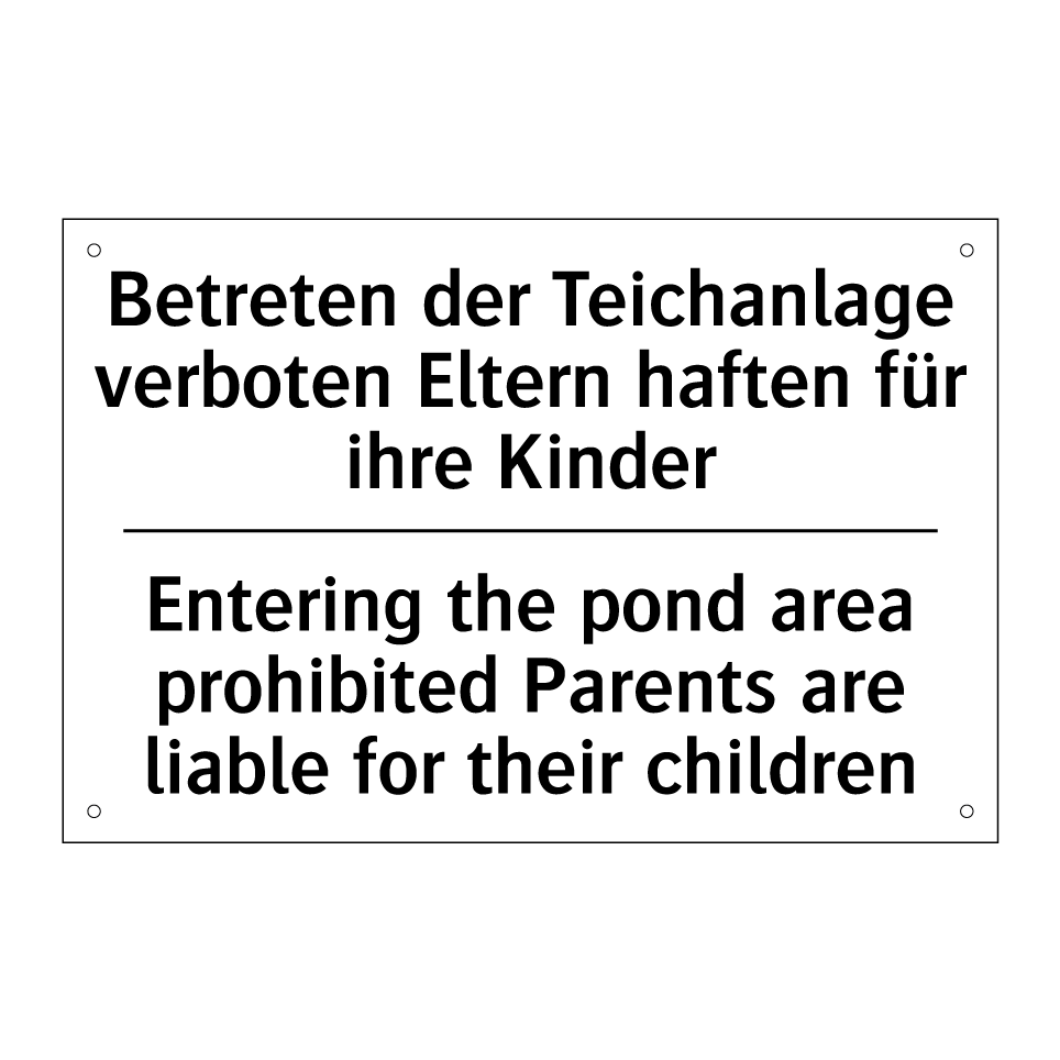 Zweisprachiges Verbotsschild mit deutschem Text Betreten der Teichanlage verboten Eltern haften für ihre Kinder und englischem Text Entering the pond area prohibited Parents are liable for their children