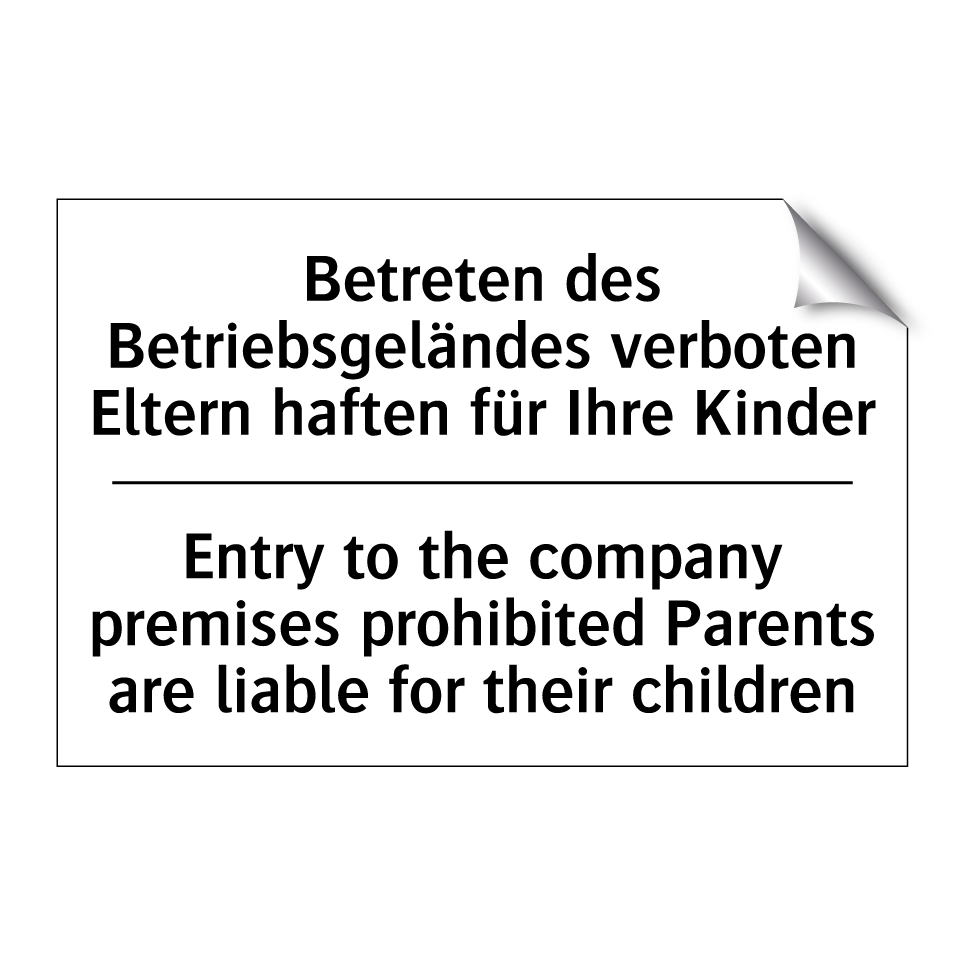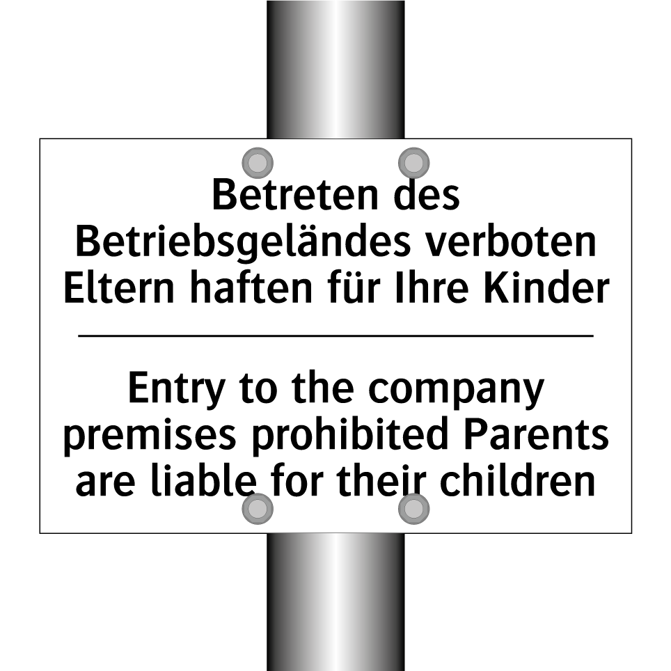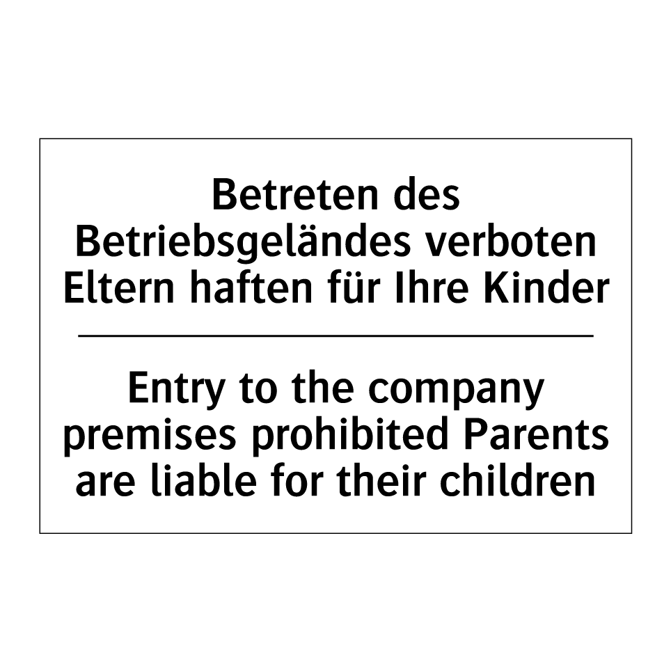 Zweisprachiges Verbotsschild mit deutschem Text Betreten des Betriebsgeländes verboten Eltern haften für Ihre Kinder und englischem Text Entry to the company premises prohibited Parents are liable for their children