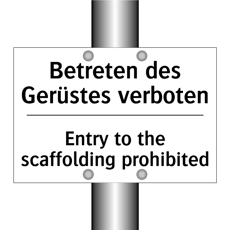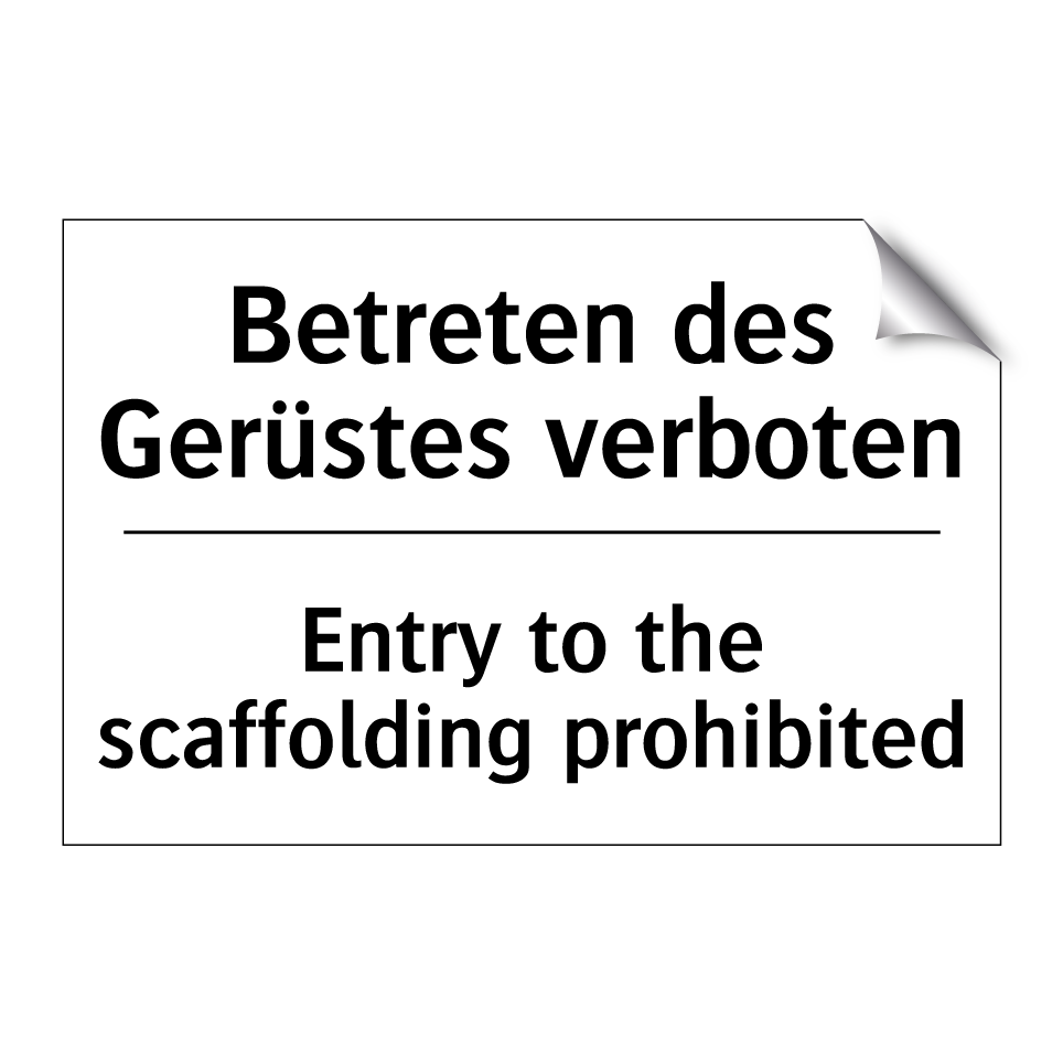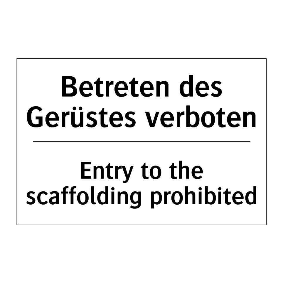 Zweisprachiges Verbotsschild mit deutschem Text Betreten des Gerüstes verboten und englischem Text Entry to the scaffolding prohibited