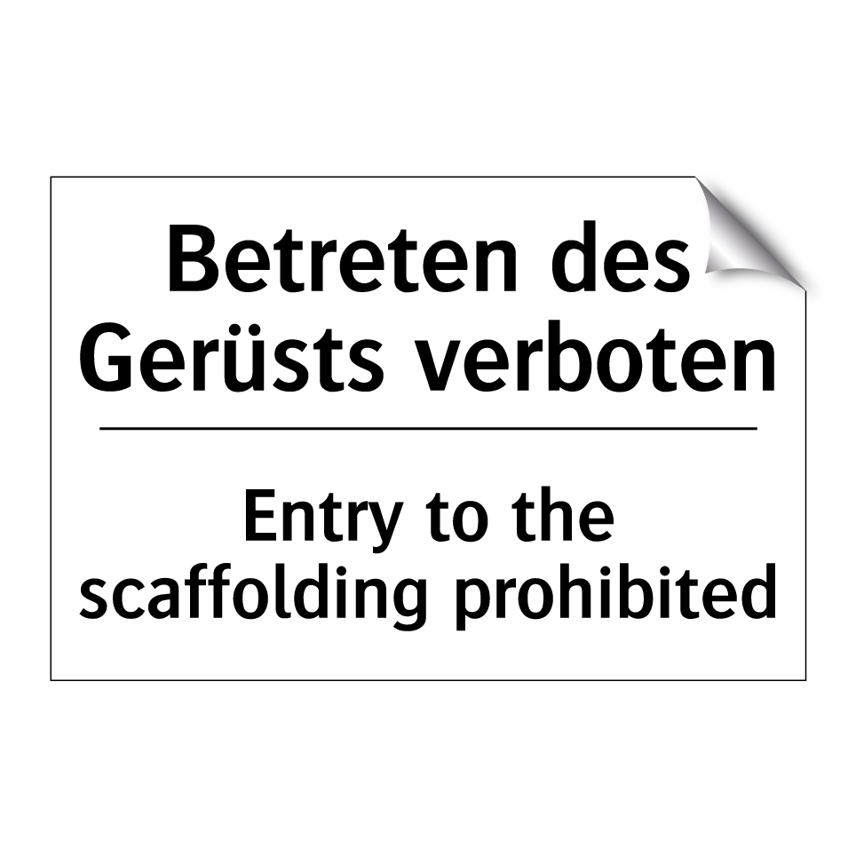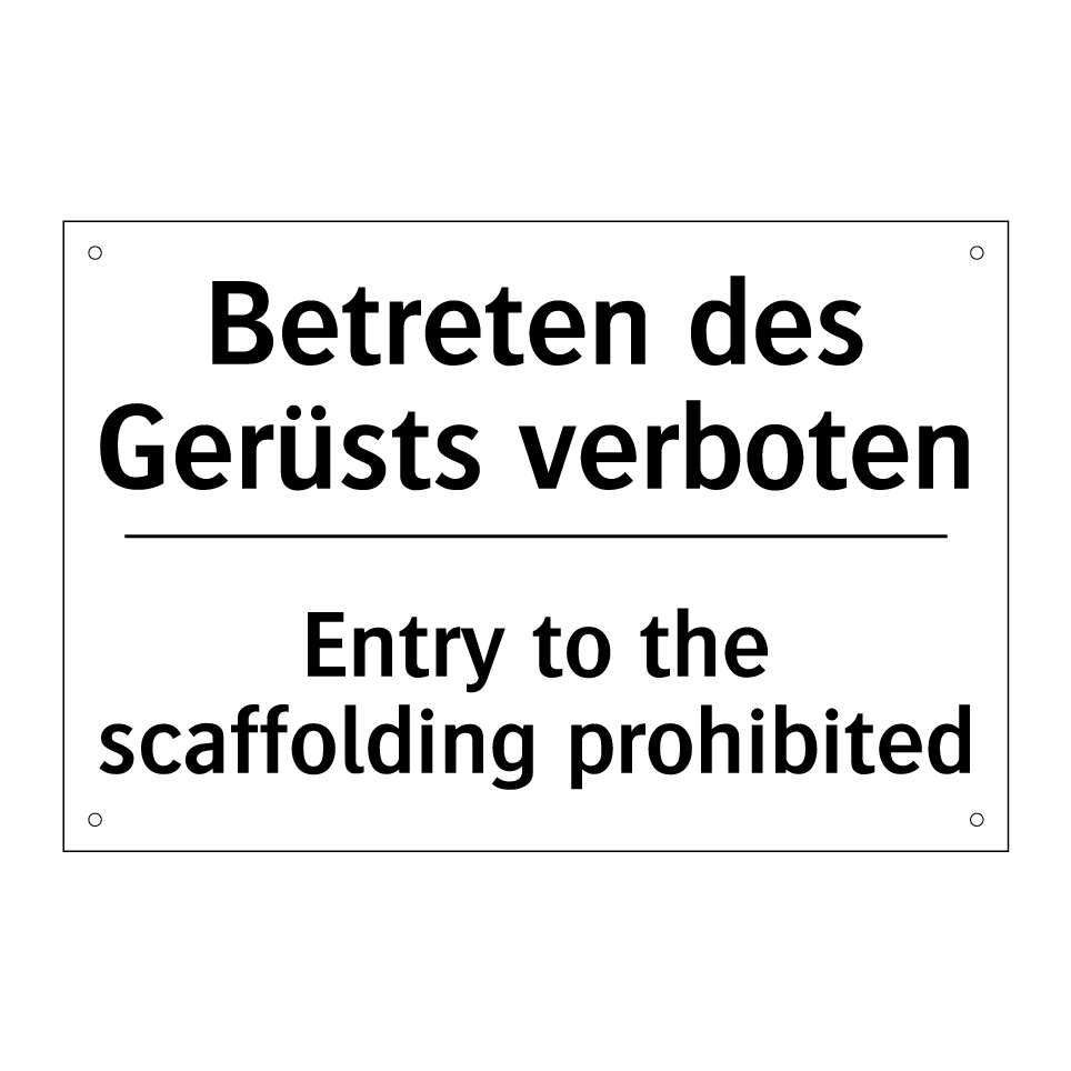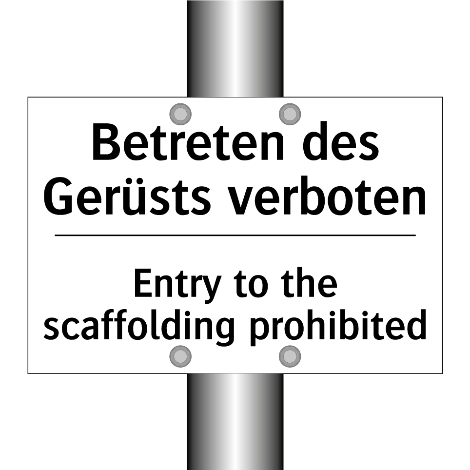 Zweisprachiges Verbotsschild mit deutschem Text Betreten des Gerüsts verboten und englischem Text Entry to the scaffolding prohibited
