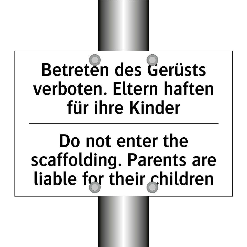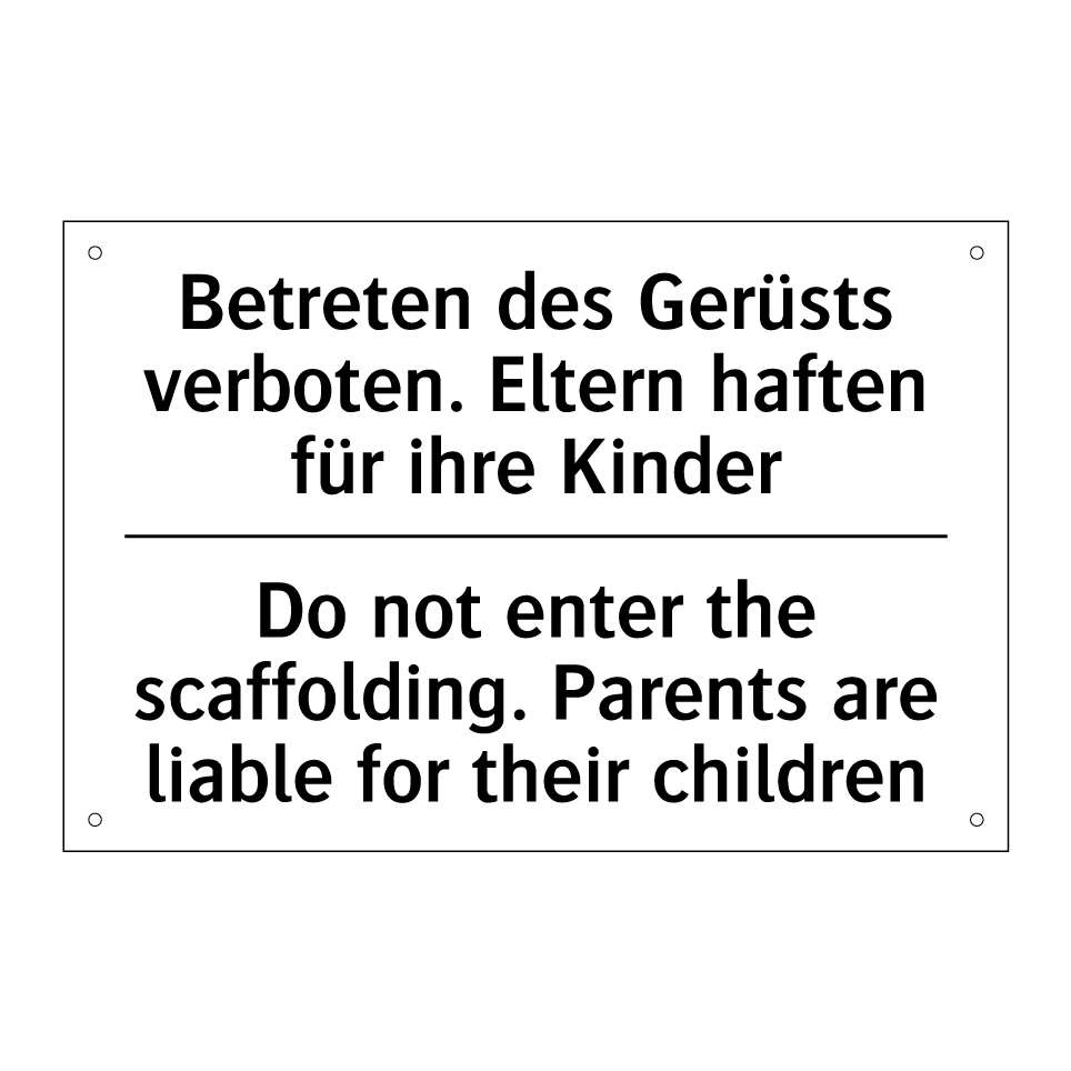 Zweisprachiges Verbotsschild mit deutschem Text Betreten des Gerüsts verboten. Eltern haften für ihre Kinder und englischem Text Do not enter the scaffolding. Parents are liable for their children