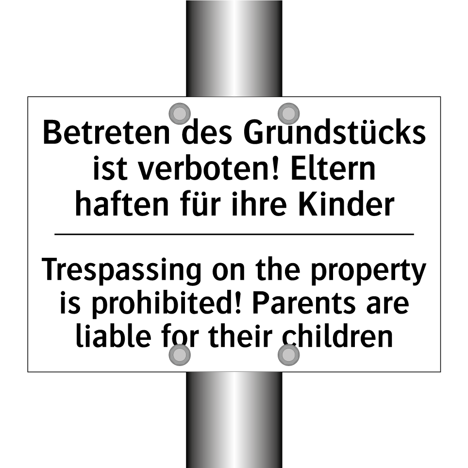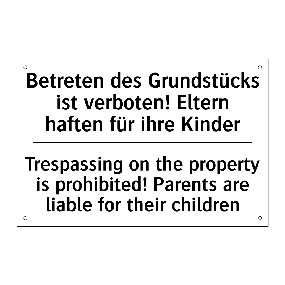 Zweisprachiges Verbotsschild mit deutschem Text Betreten des Grundstücks ist verboten! Eltern haften für ihre Kinder und englischem Text Trespassing on the property is prohibited! Parents are liable for their children