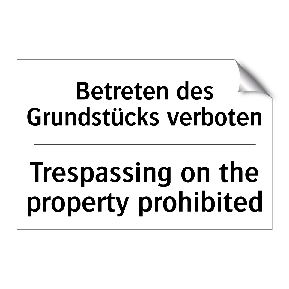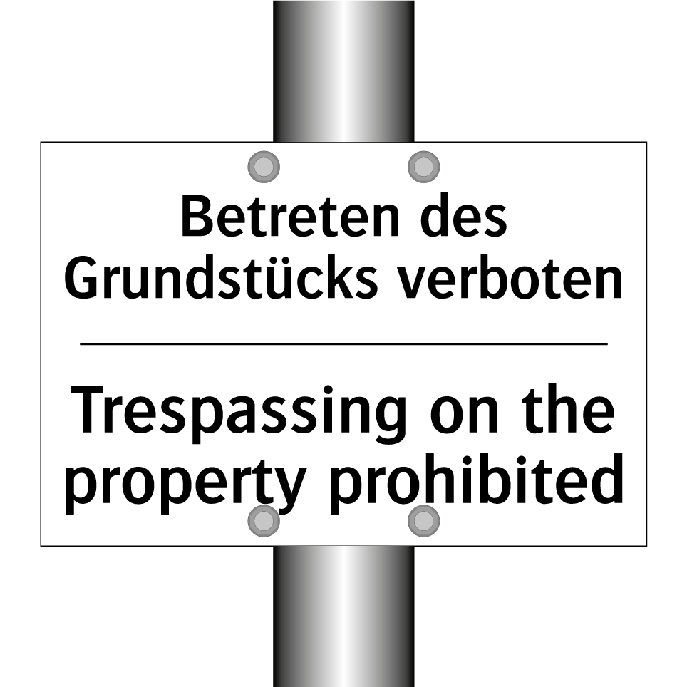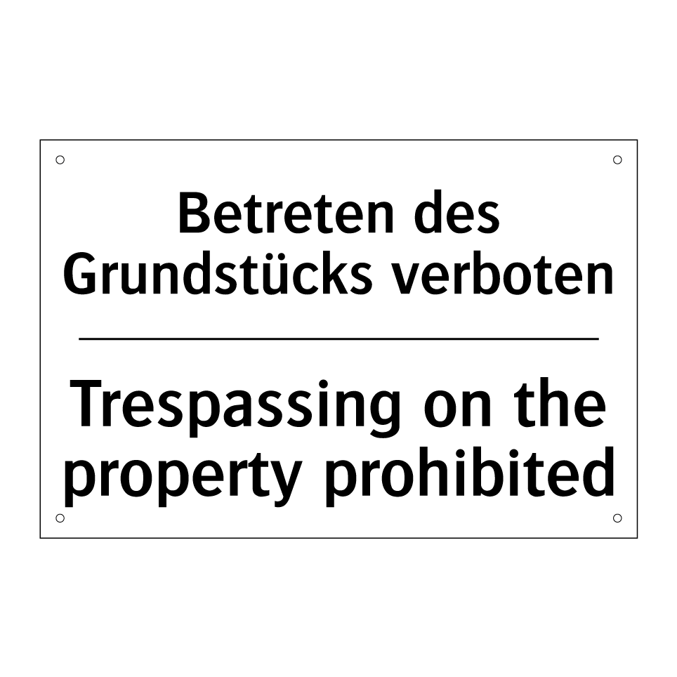 Zweisprachiges Verbotsschild mit deutschem Text Betreten des Grundstücks verboten und englischem Text Trespassing on the property prohibited
