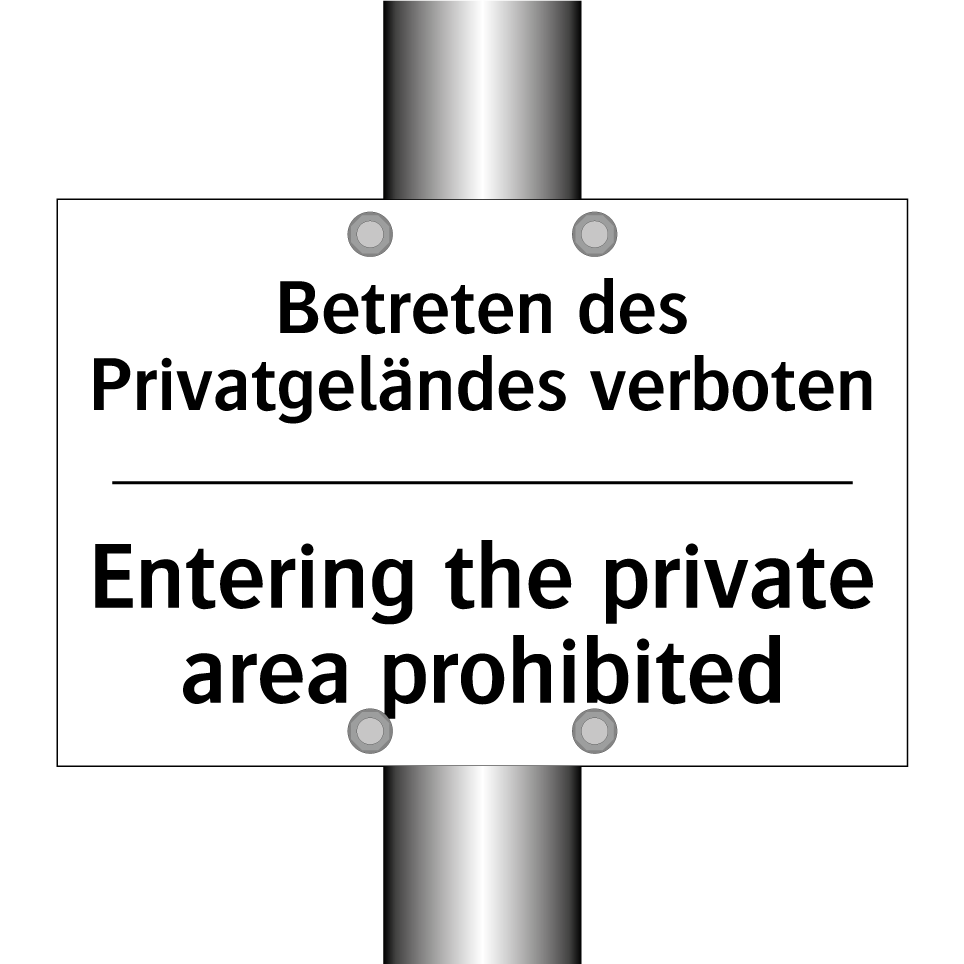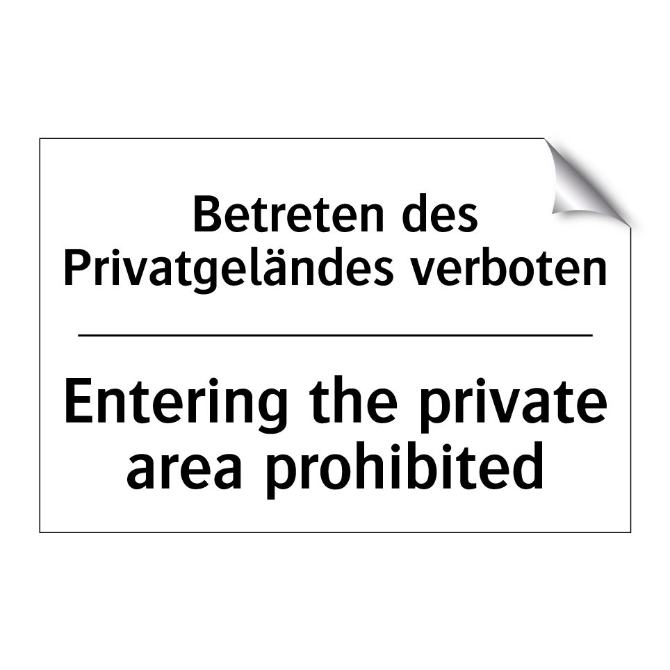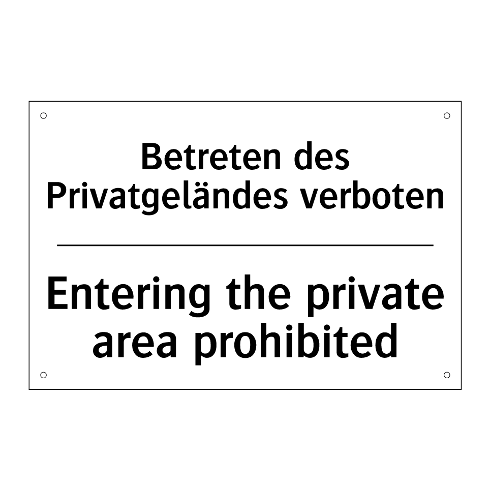 Zweisprachiges Verbotsschild mit deutschem Text Betreten des Privatgeländes verboten und englischem Text Entering the private area prohibited