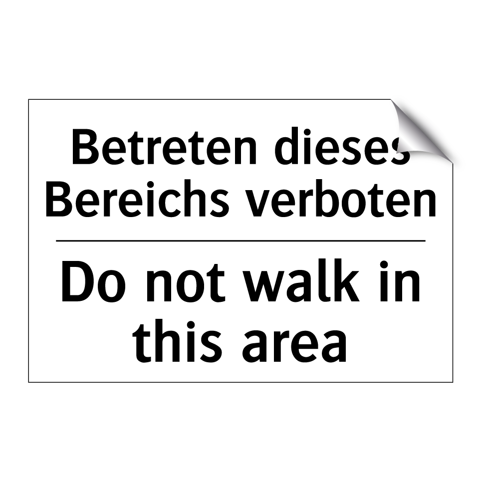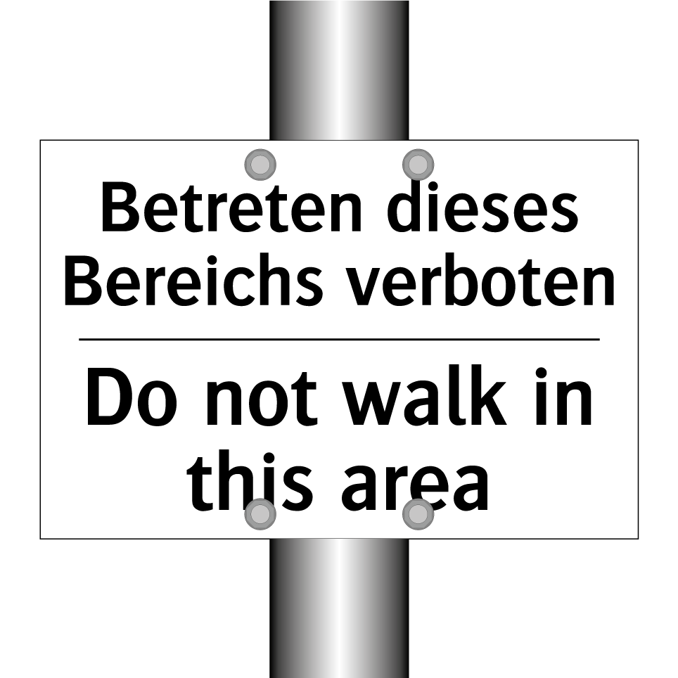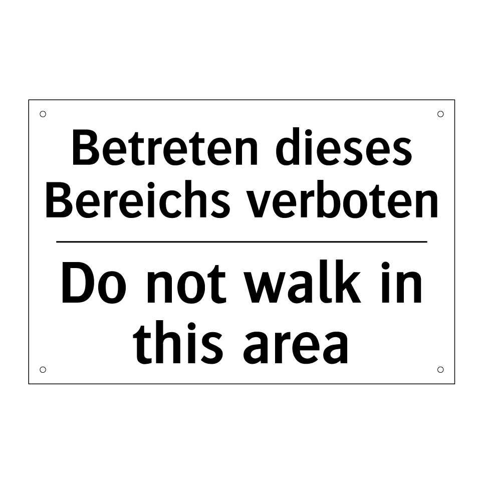 Zweisprachiges Verbotsschild mit deutschem Text Betreten dieses Bereichs verboten und englischem Text Do not walk in this area
