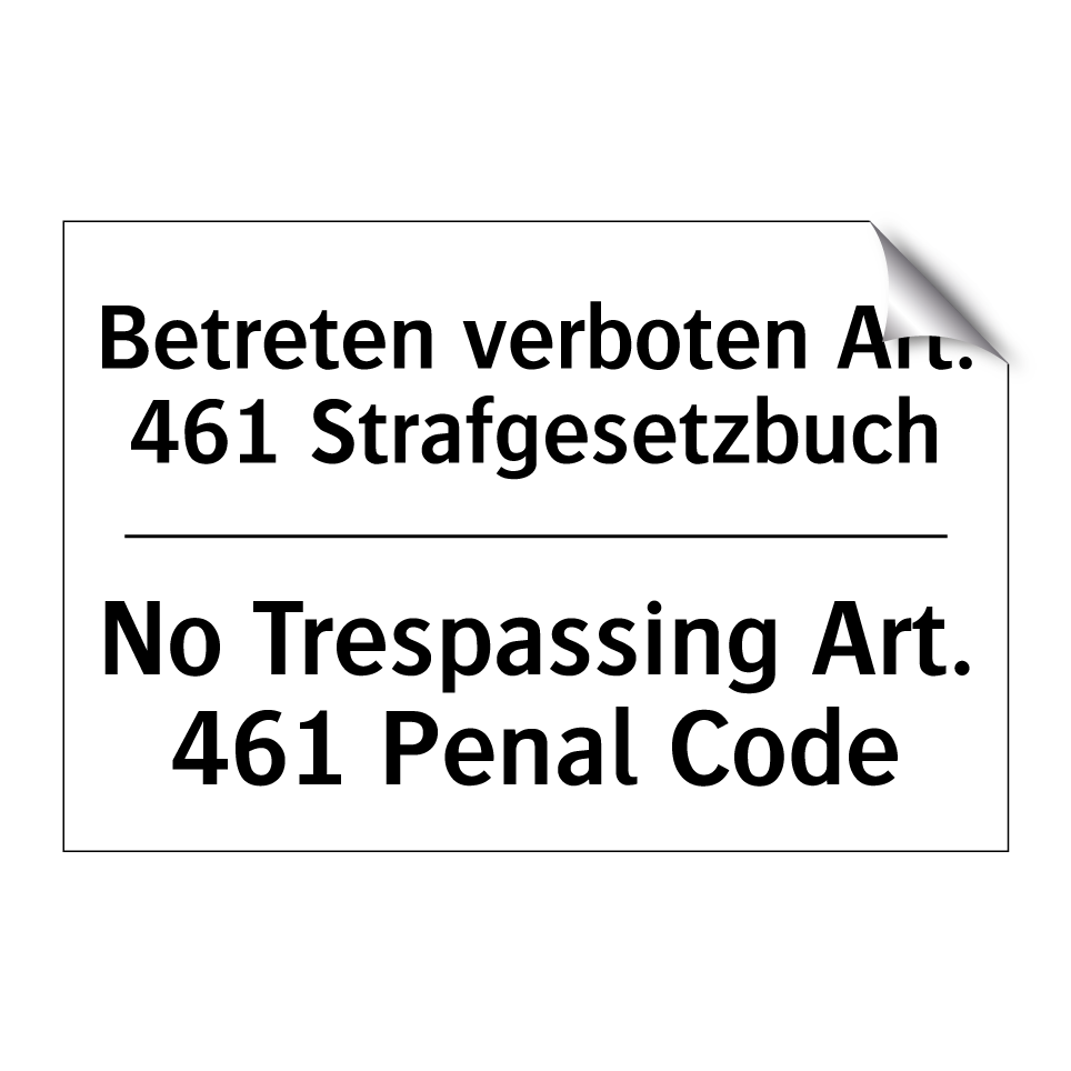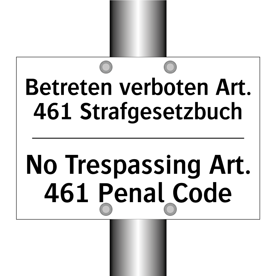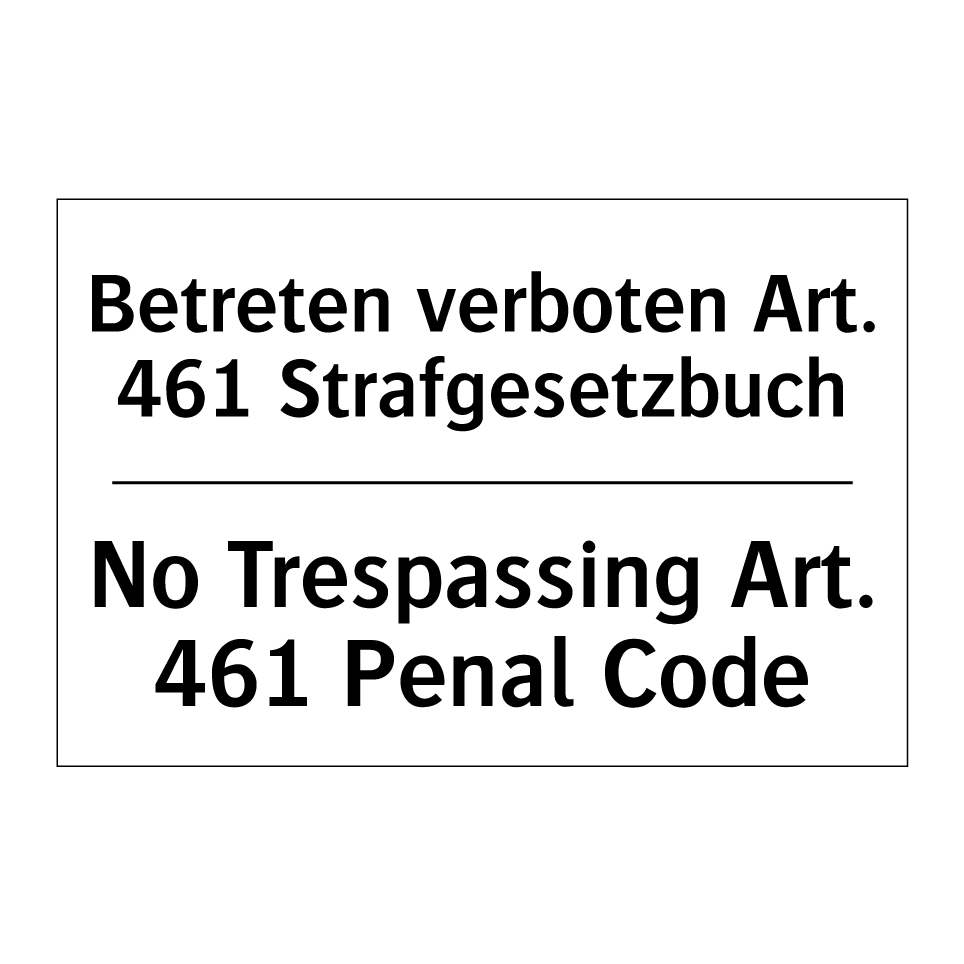 Zweisprachiges Verbotsschild mit deutschem Text Betreten verboten Art. 461 Strafgesetzbuch und englischem Text No Trespassing Art. 461 Penal Code