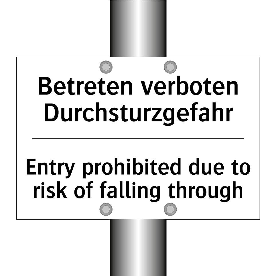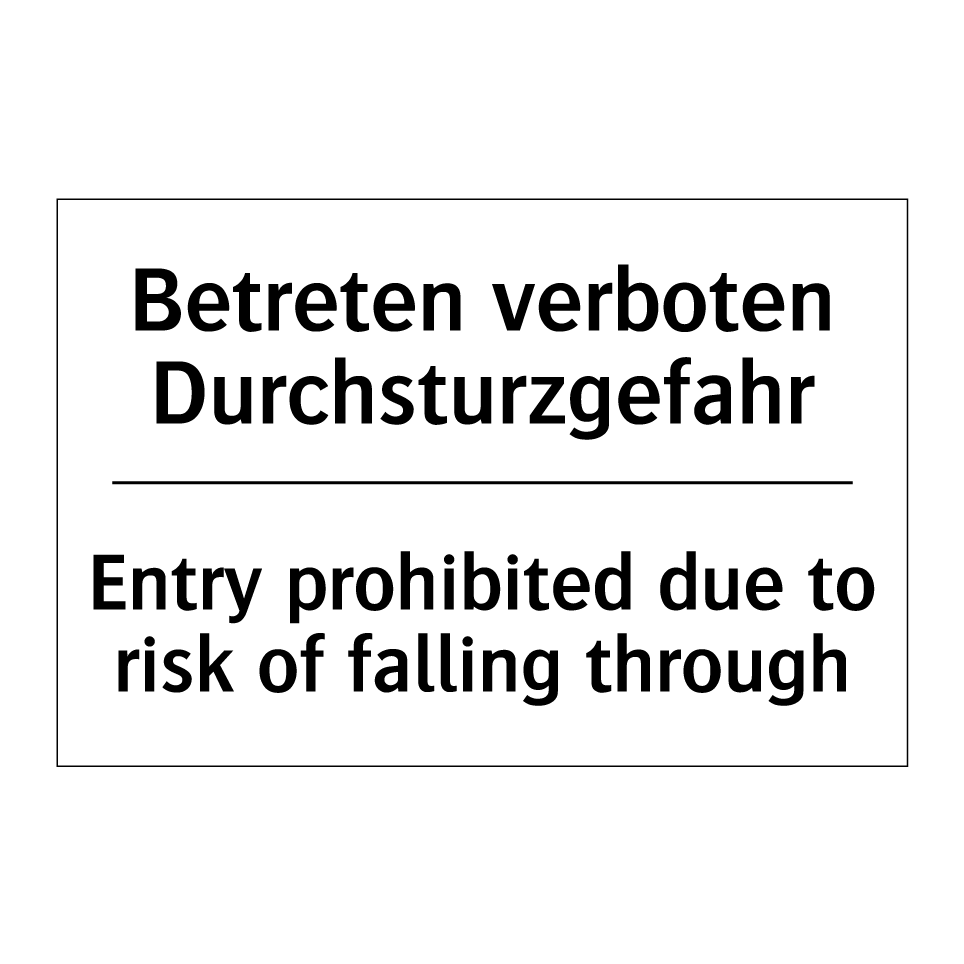 Zweisprachiges Verbotsschild mit deutschem Text Betreten verboten Durchsturzgefahr und englischem Text Entry prohibited due to risk of falling through