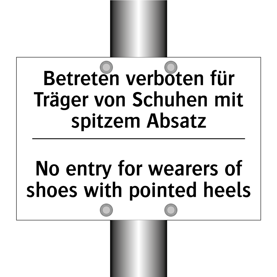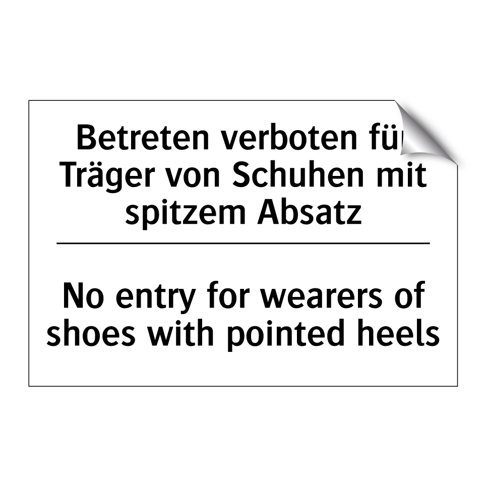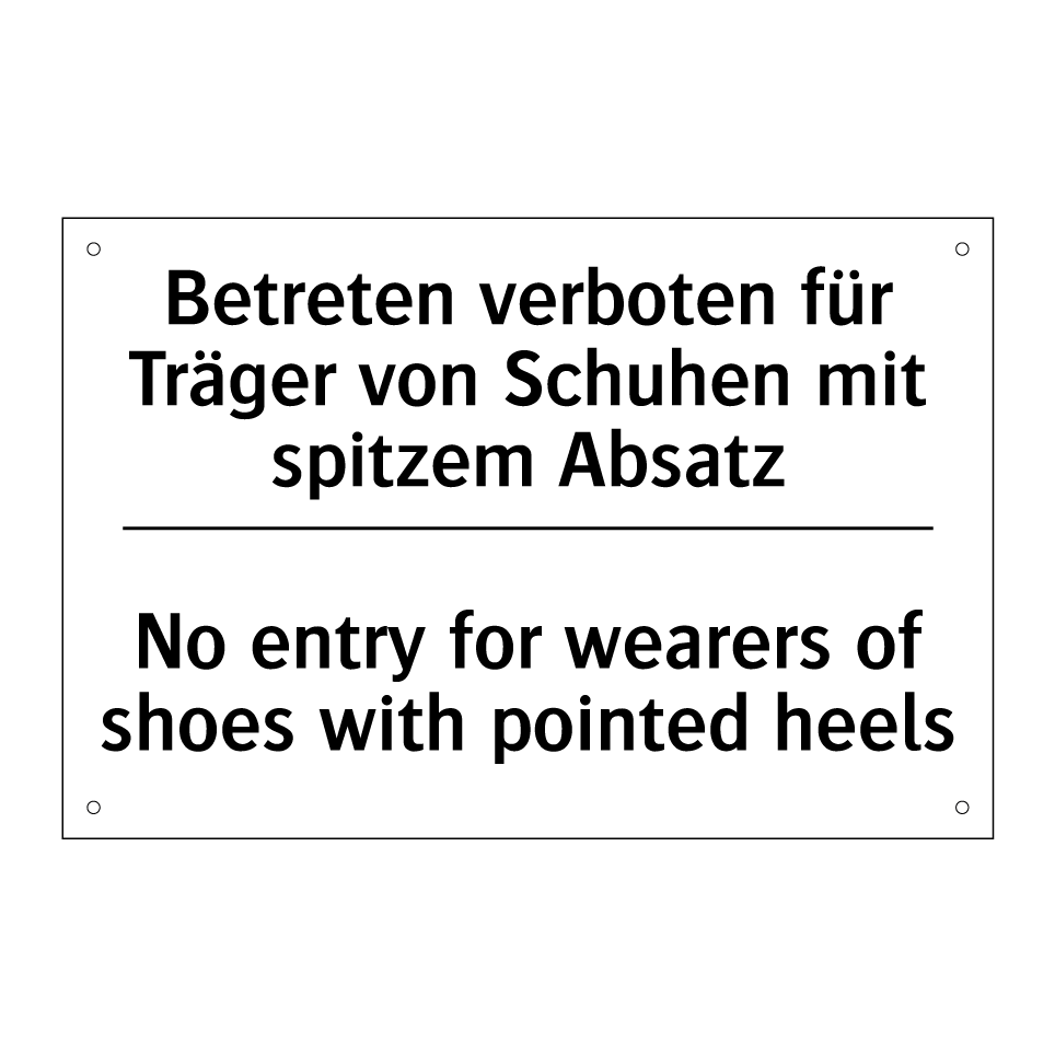 Zweisprachiges Verbotsschild mit deutschem Text Betreten verboten für Träger von Schuhen mit spitzem Absatz und englischem Text No entry for wearers of shoes with pointed heels