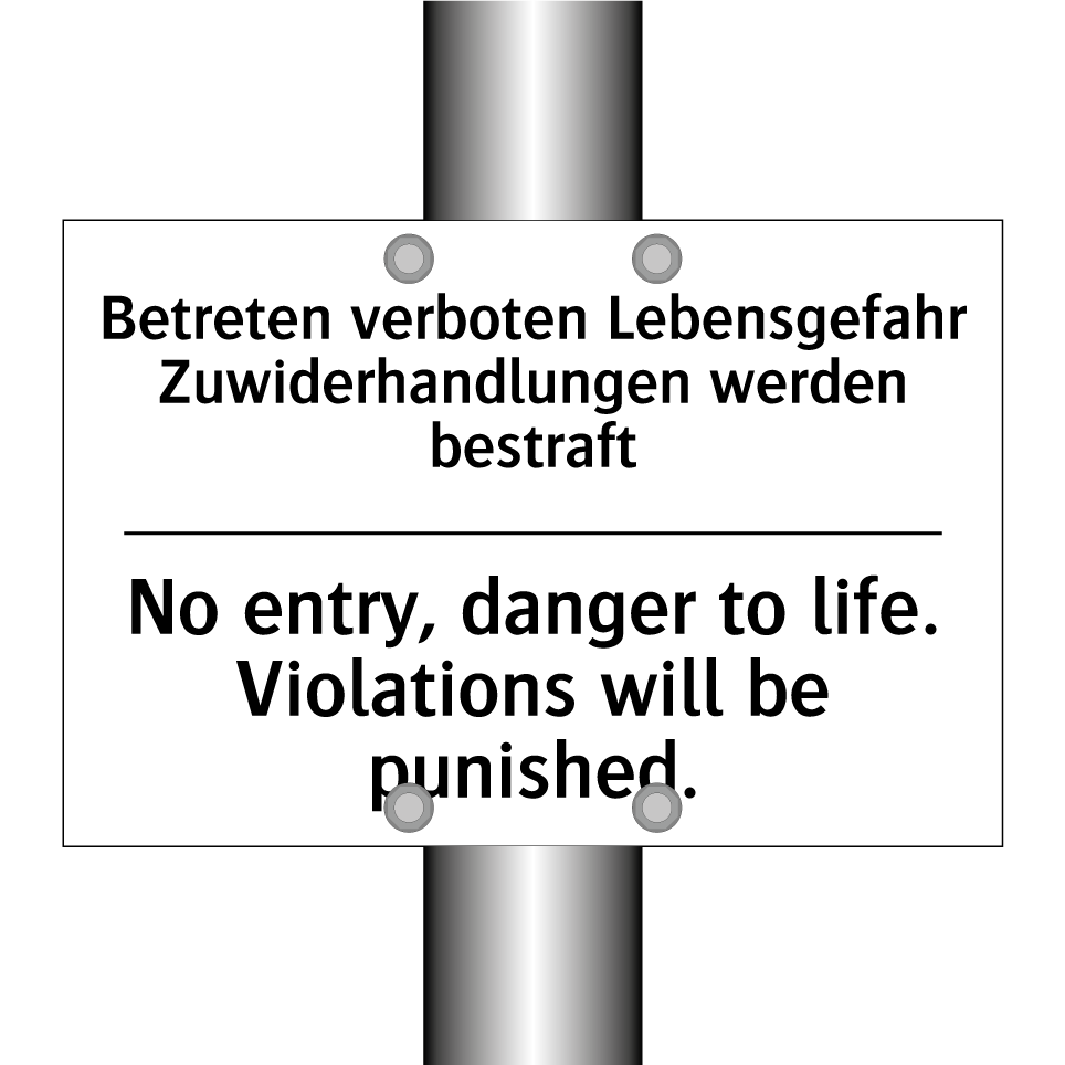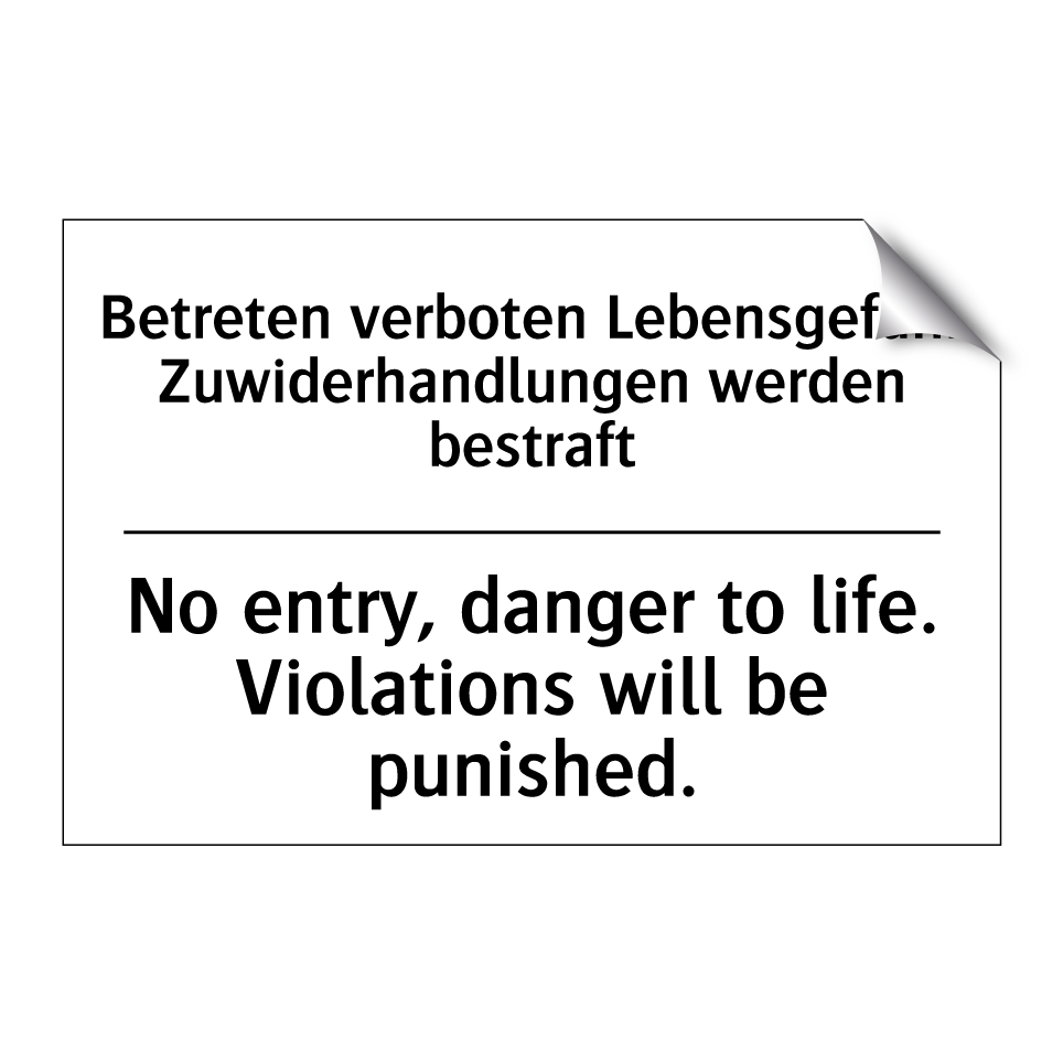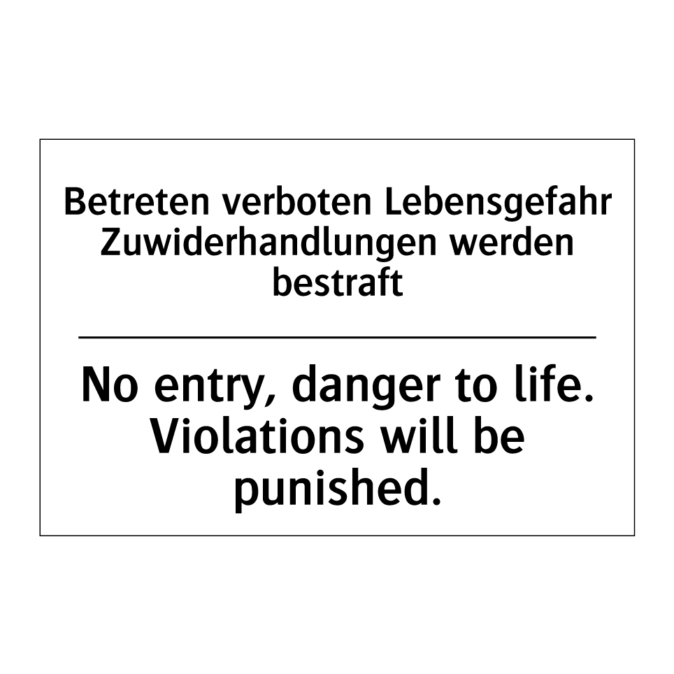 Zweisprachiges Verbotsschild mit deutschem Text Betreten verboten Lebensgefahr Zuwiderhandlungen werden bestraft und englischem Text No entry, danger to life. Violations will be punished.