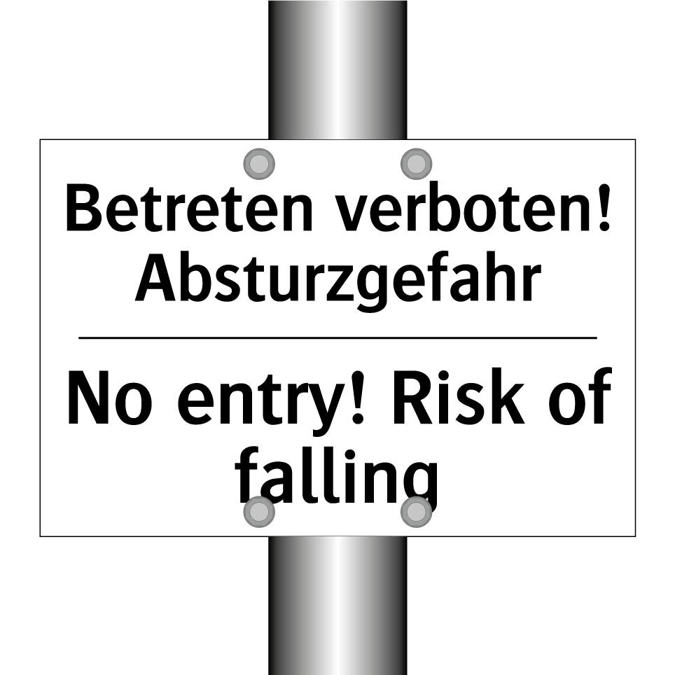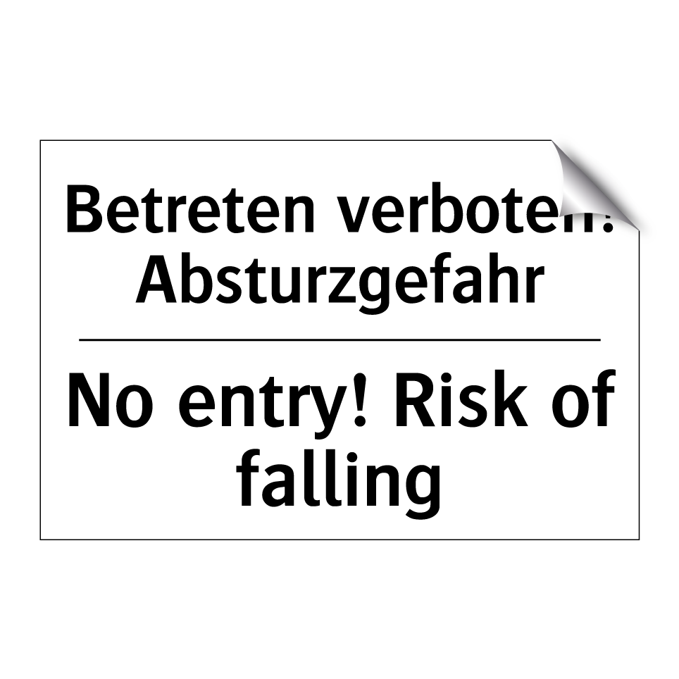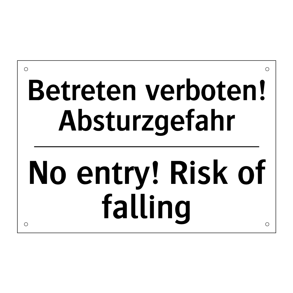 Zweisprachiges Verbotsschild mit deutschem Text Betreten verboten! Absturzgefahr und englischem Text No entry! Risk of falling