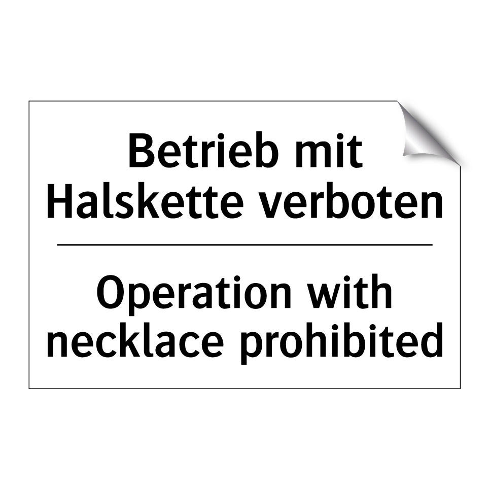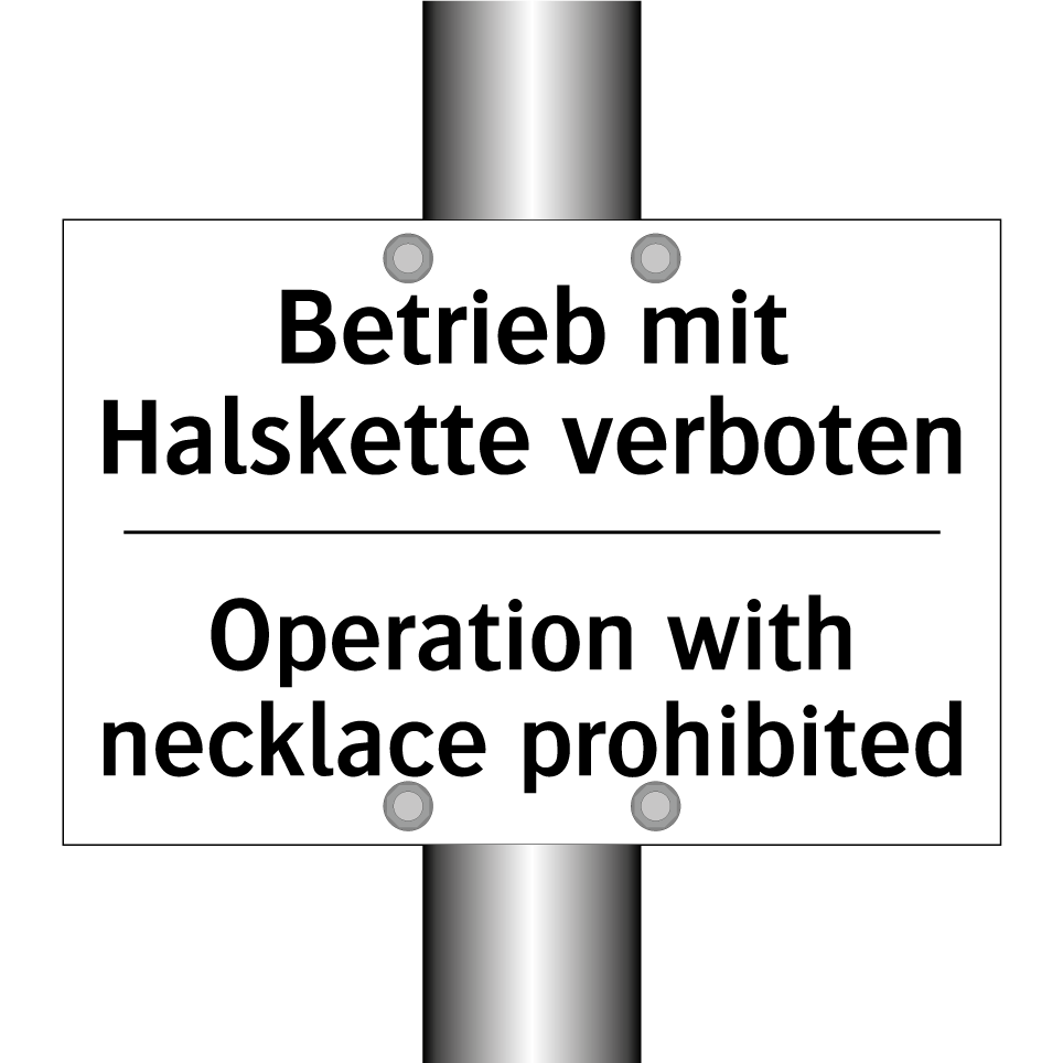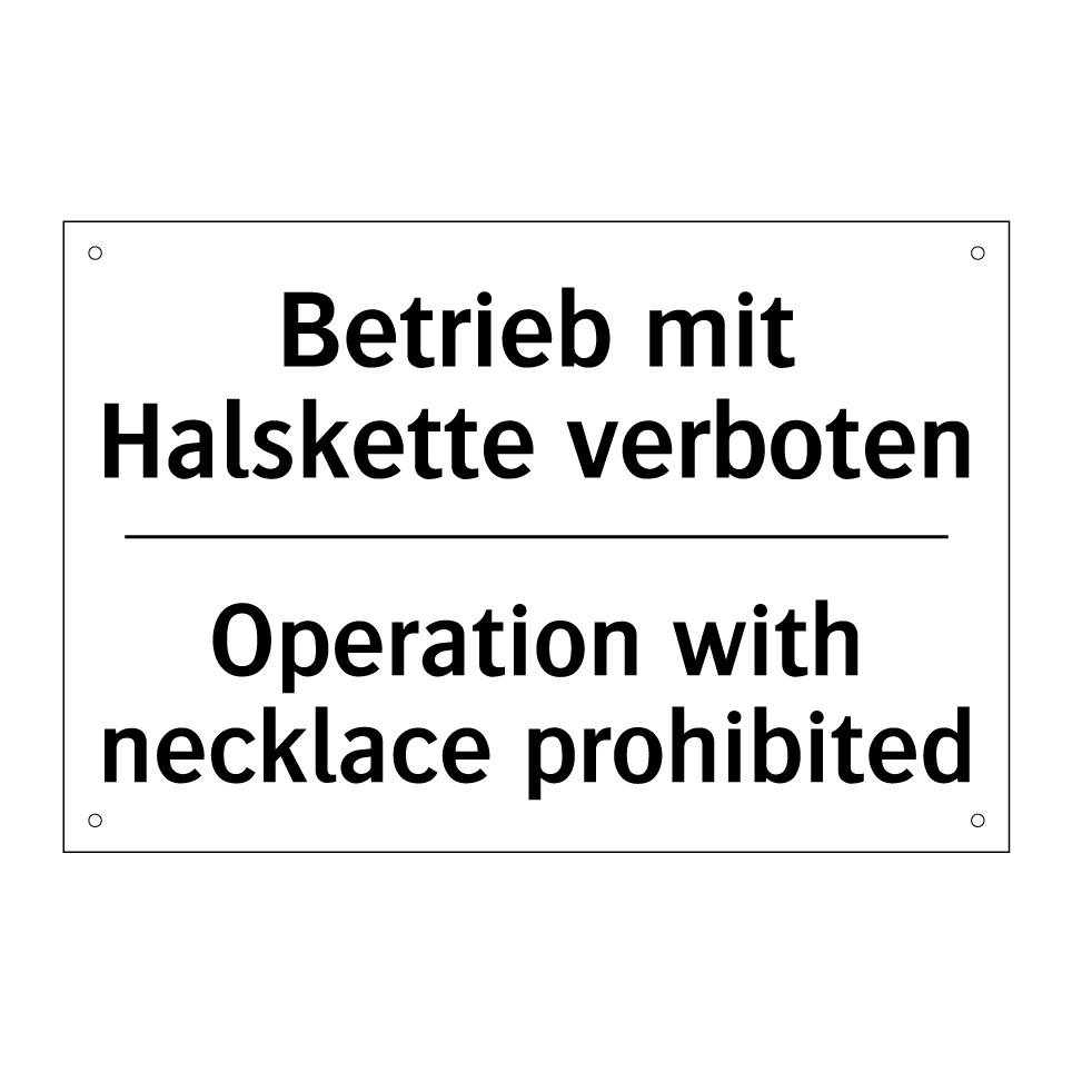 Zweisprachiges Verbotsschild mit deutschem Text Betrieb mit Halskette verboten und englischem Text Operation with necklace prohibited