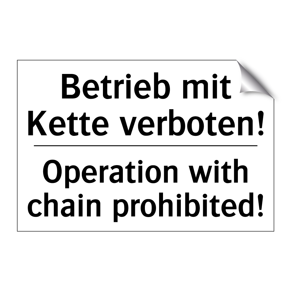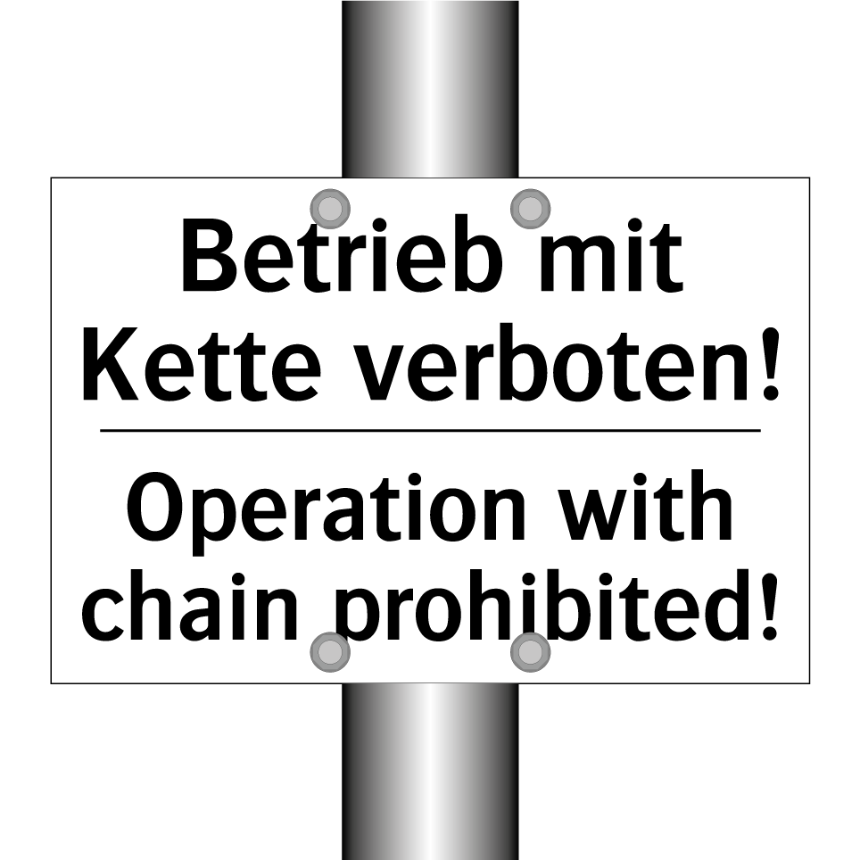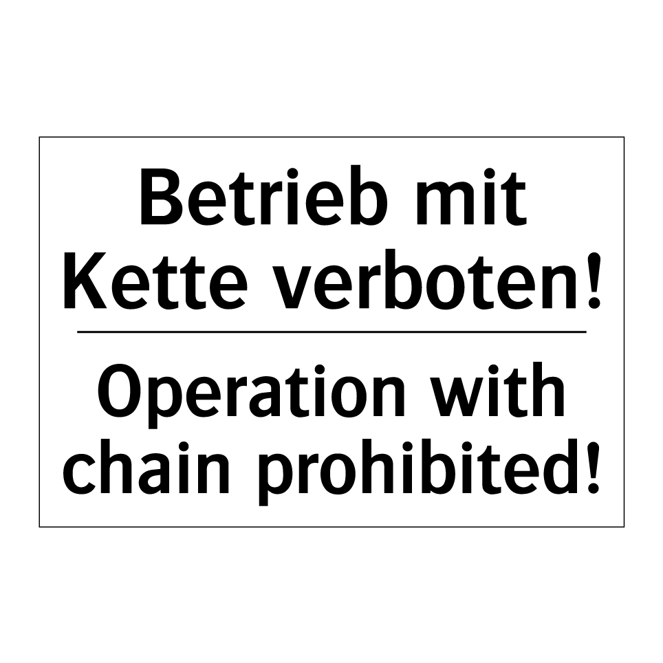 Zweisprachiges Verbotsschild mit deutschem Text Betrieb mit Kette verboten! und englischem Text Operation with chain prohibited!