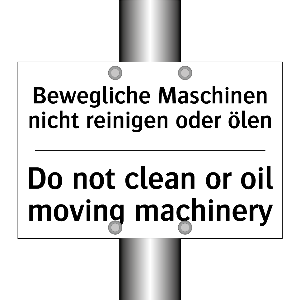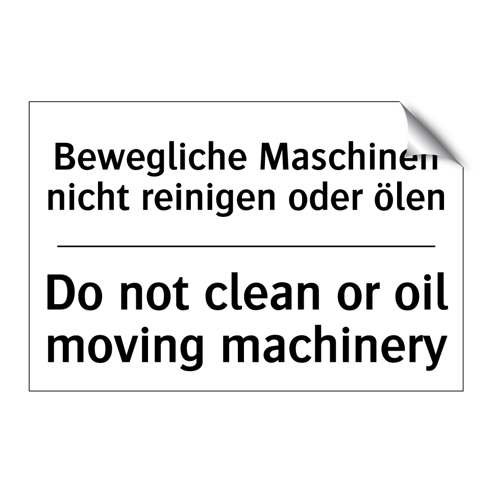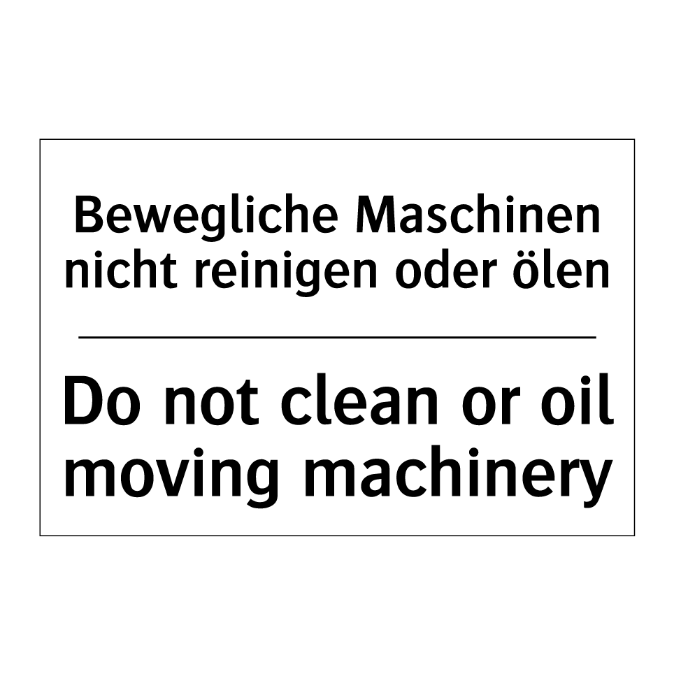 Zweisprachiges Verbotsschild mit deutschem Text Bewegliche Maschinen nicht reinigen oder ölen und englischem Text Do not clean or oil moving machinery
