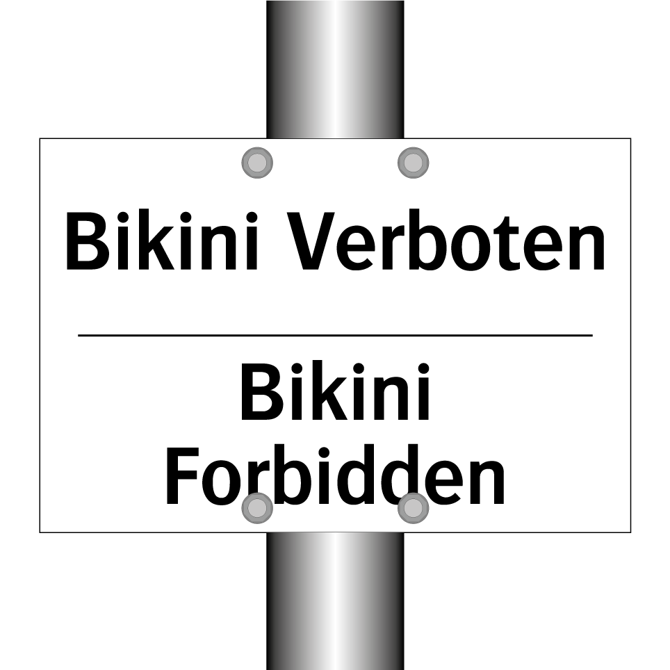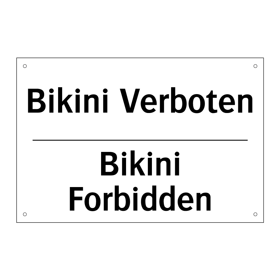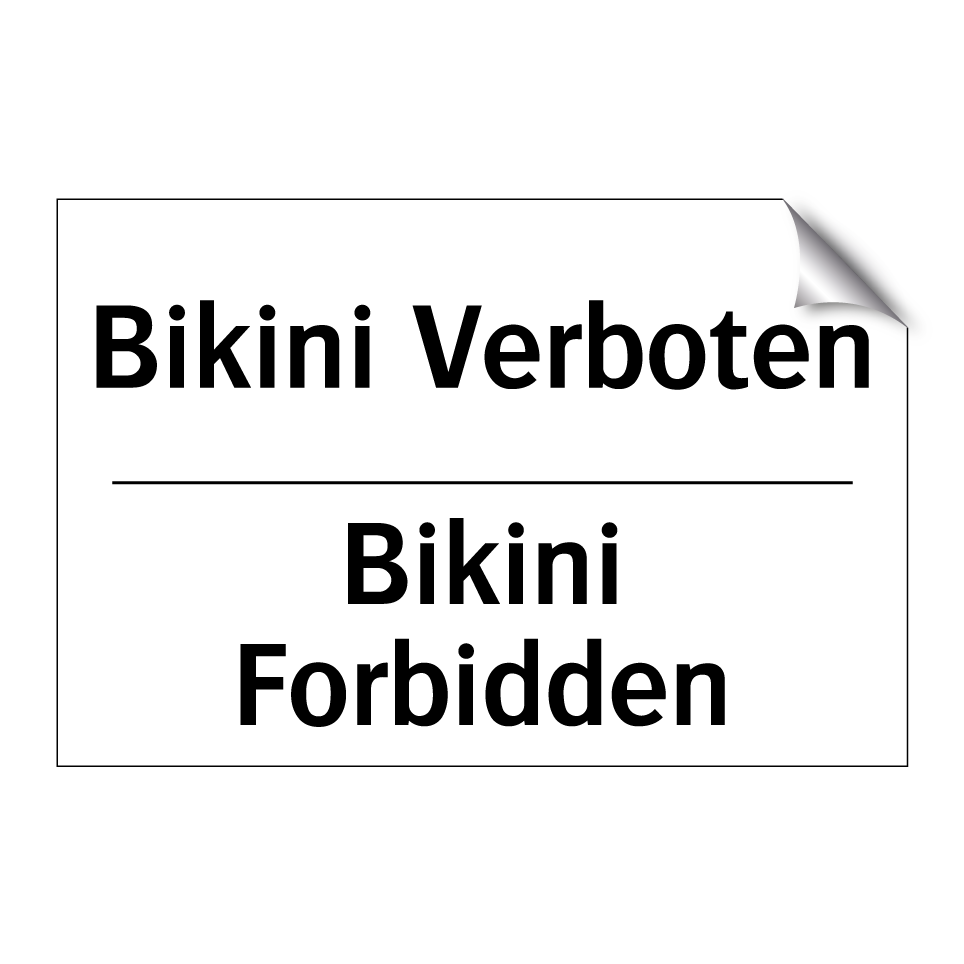 Zweisprachiges Verbotsschild mit deutschem Text Bikini Verboten und englischem Text Bikini Forbidden
