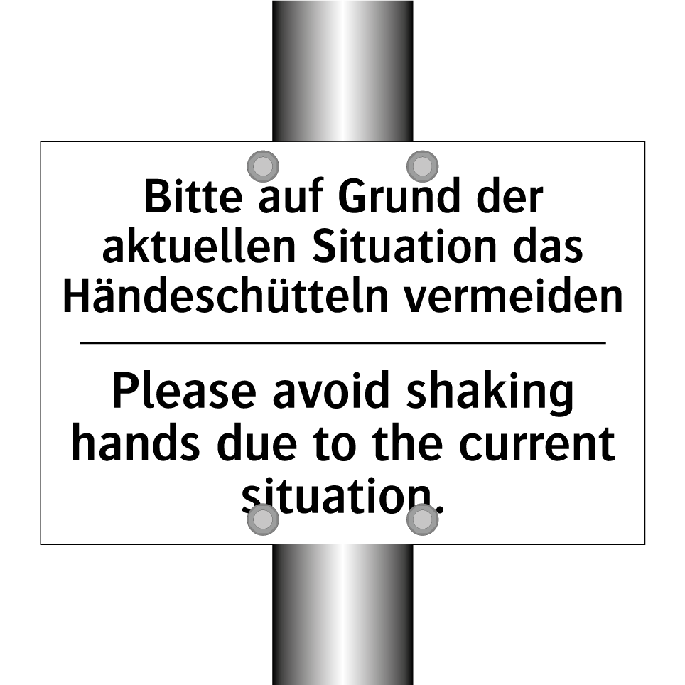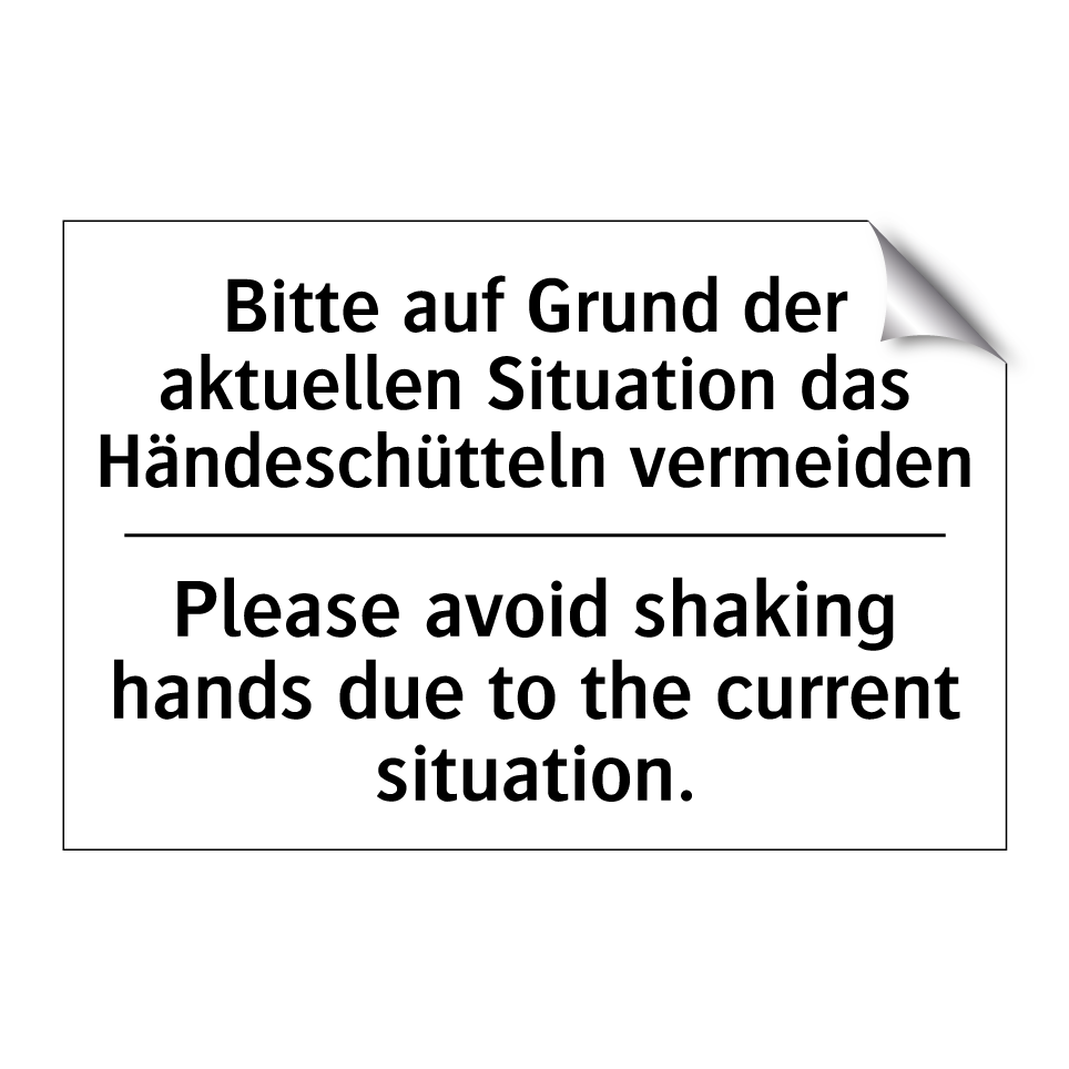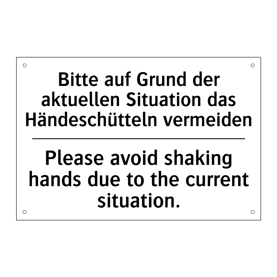 Zweisprachiges Verbotsschild mit deutschem Text Bitte auf Grund der aktuellen Situation das Händeschütteln vermeiden und englischem Text Please avoid shaking hands due to the current situation.