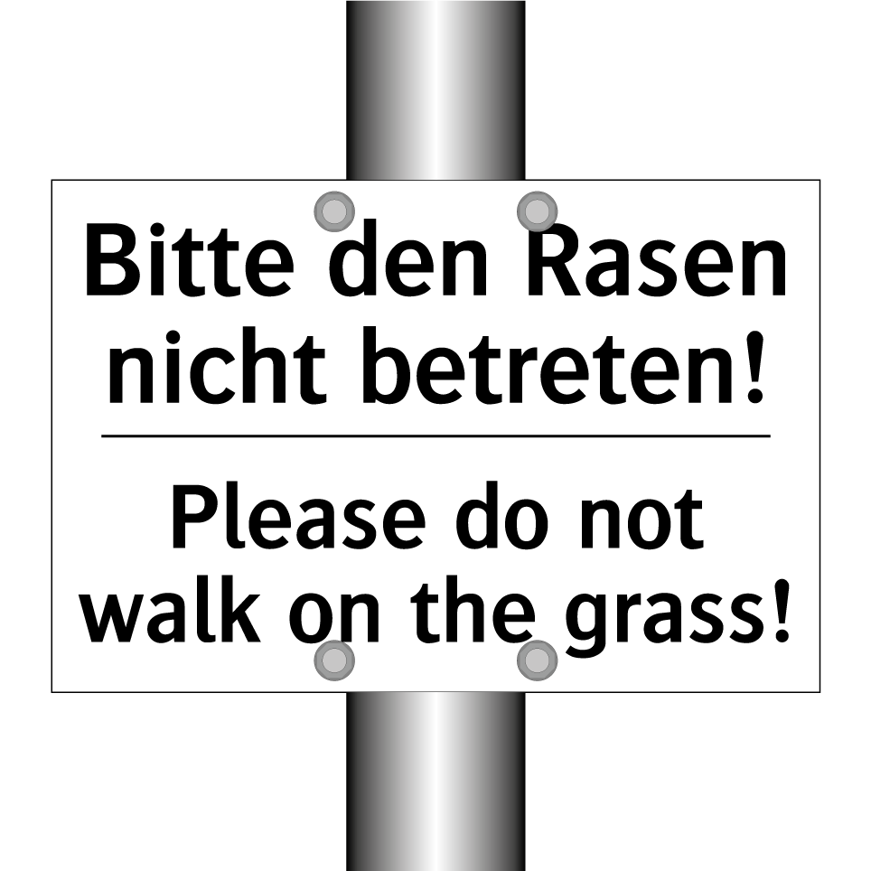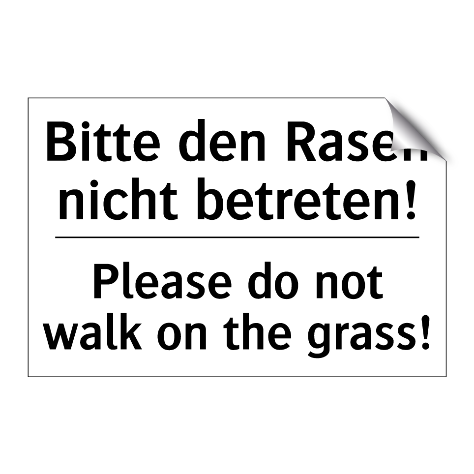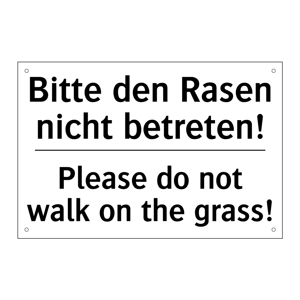 Zweisprachiges Verbotsschild mit deutschem Text Bitte den Rasen nicht betreten! und englischem Text Please do not walk on the grass!