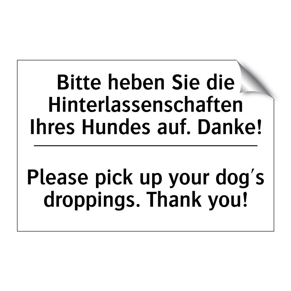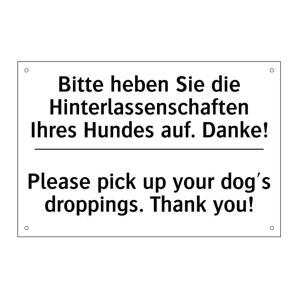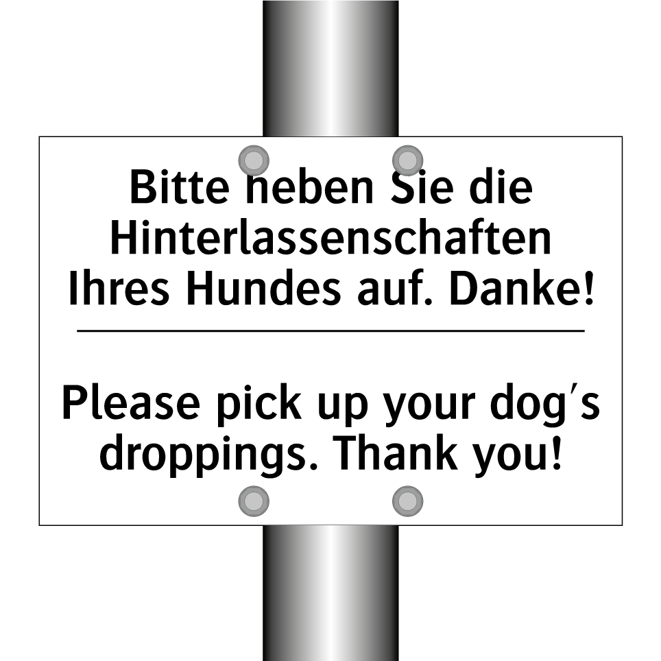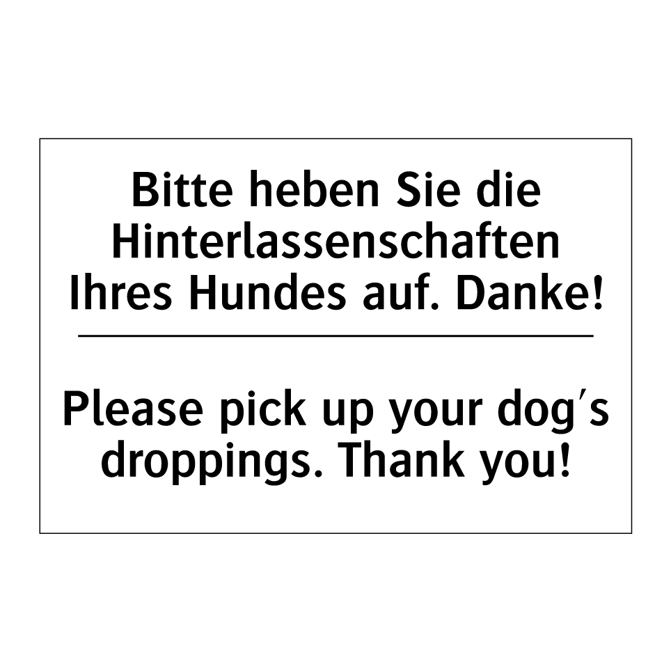 Zweisprachiges Verbotsschild mit deutschem Text Bitte heben Sie die Hinterlassenschaften Ihres Hundes auf. Danke! und englischem Text Please pick up your dog's droppings. Thank you!