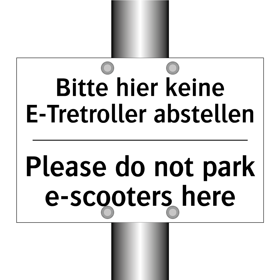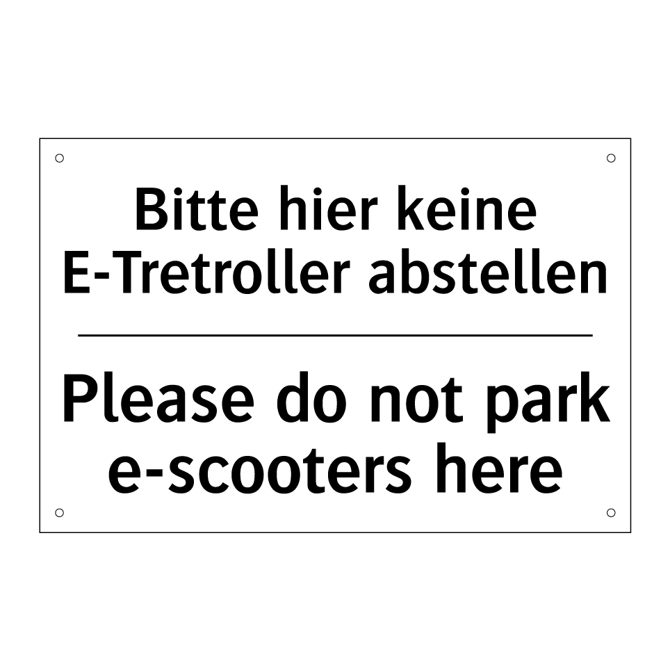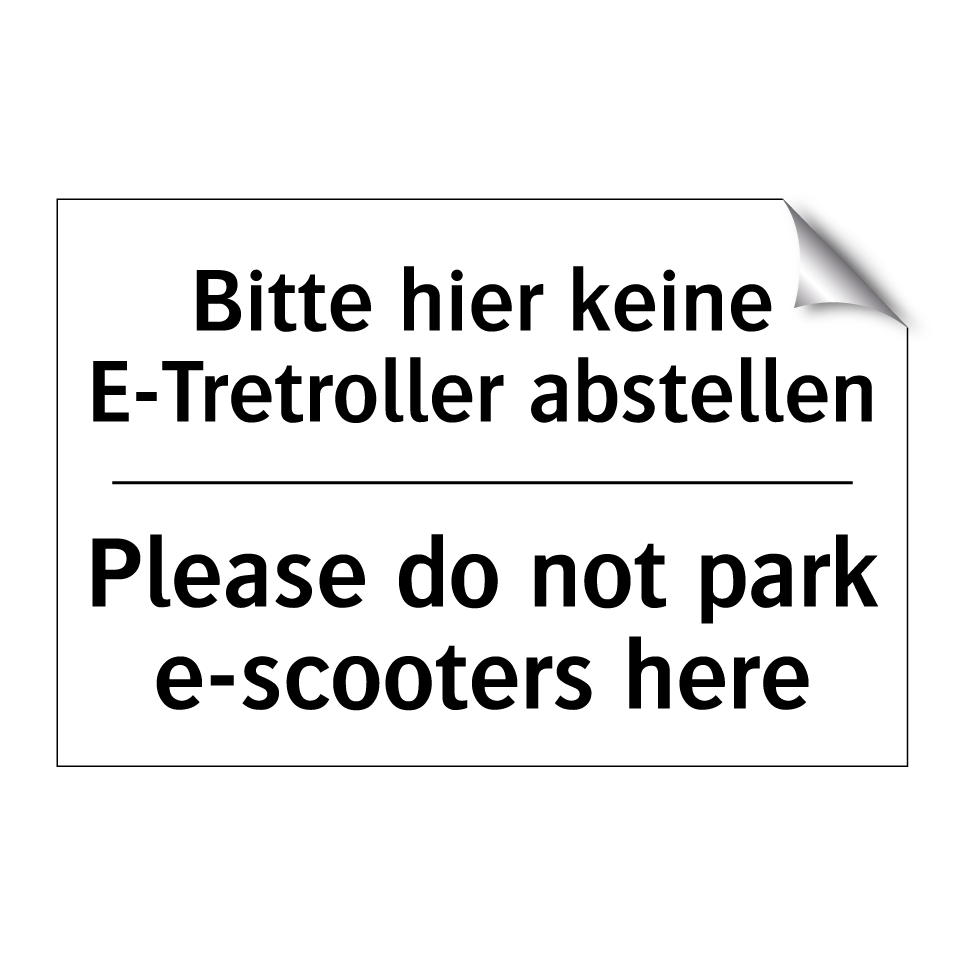 Zweisprachiges Verbotsschild mit deutschem Text Bitte hier keine E-Tretroller abstellen und englischem Text Please do not park e-scooters here
