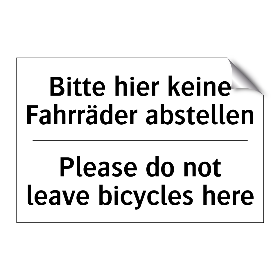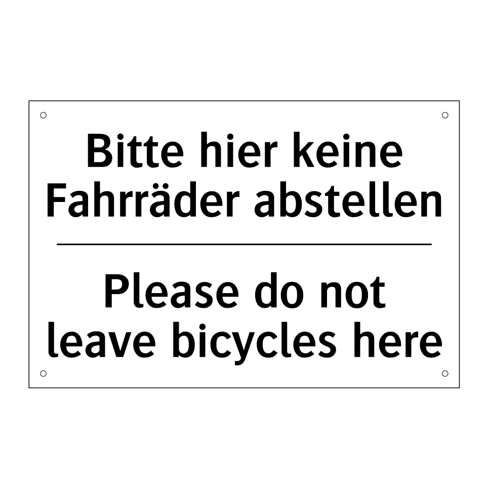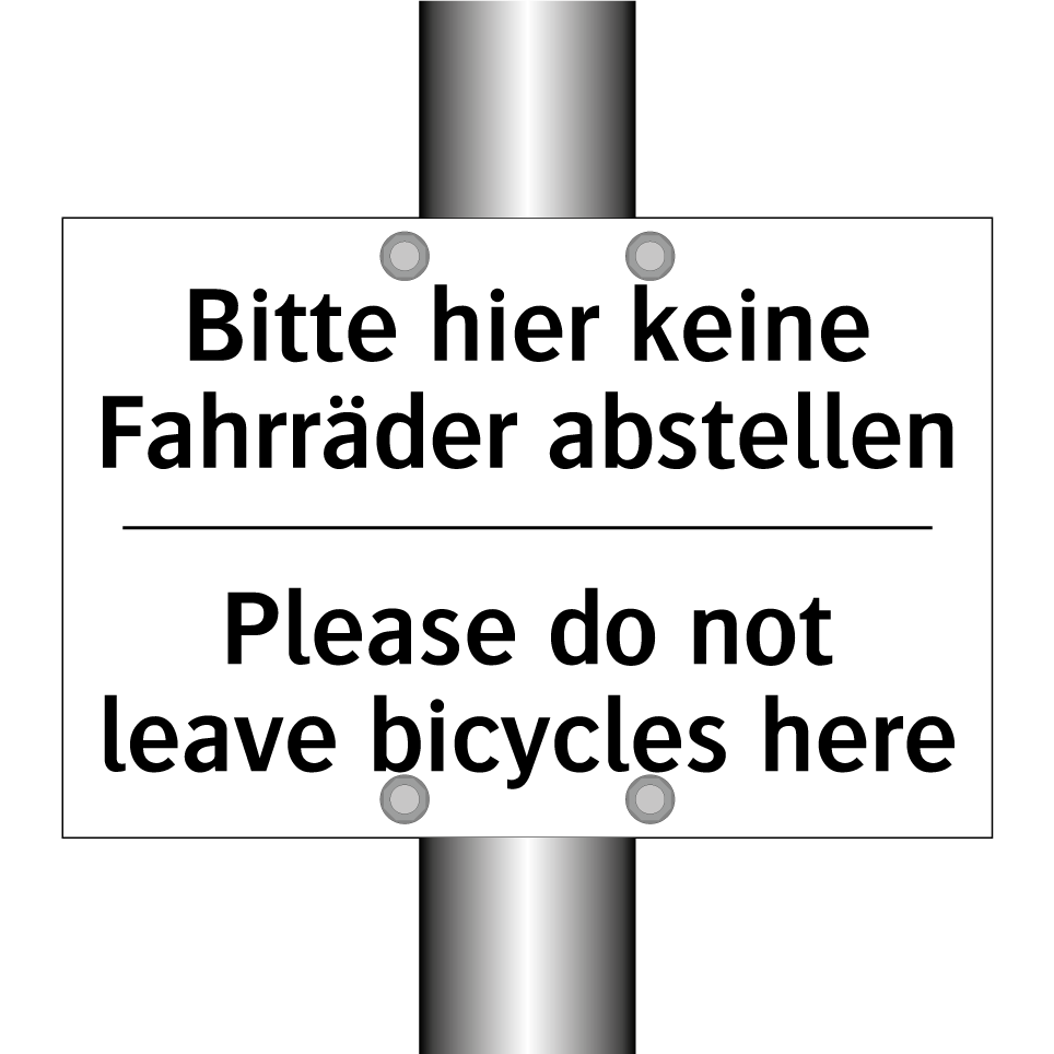 Zweisprachiges Verbotsschild mit deutschem Text Bitte hier keine Fahrräder abstellen und englischem Text Please do not leave bicycles here