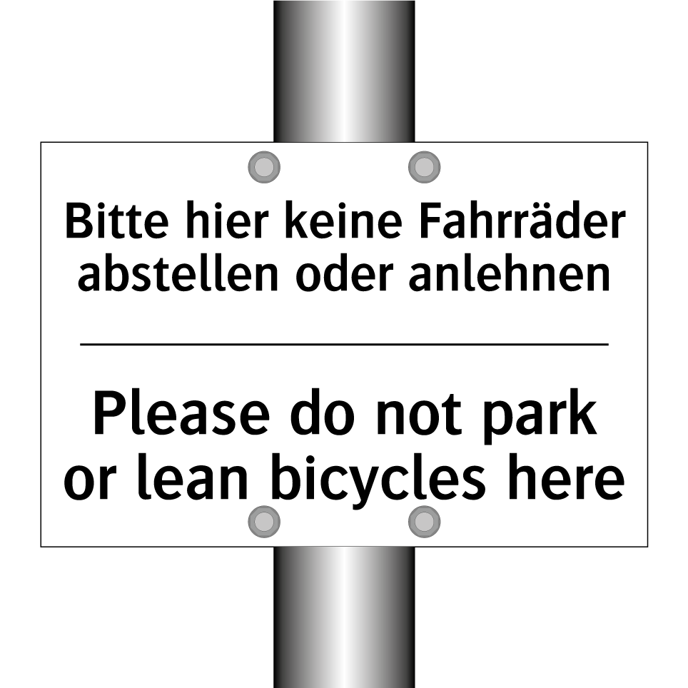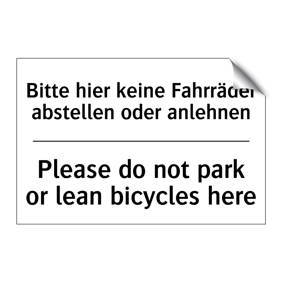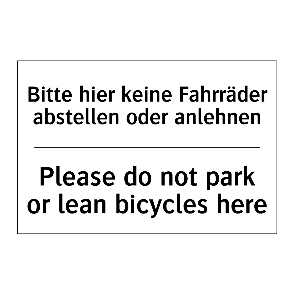 Zweisprachiges Verbotsschild mit deutschem Text Bitte hier keine Fahrräder abstellen oder anlehnen und englischem Text Please do not park or lean bicycles here