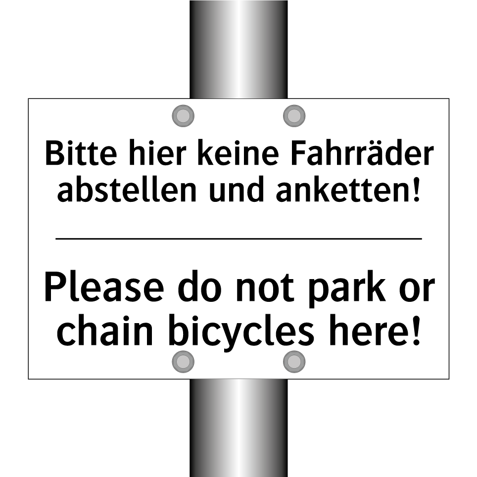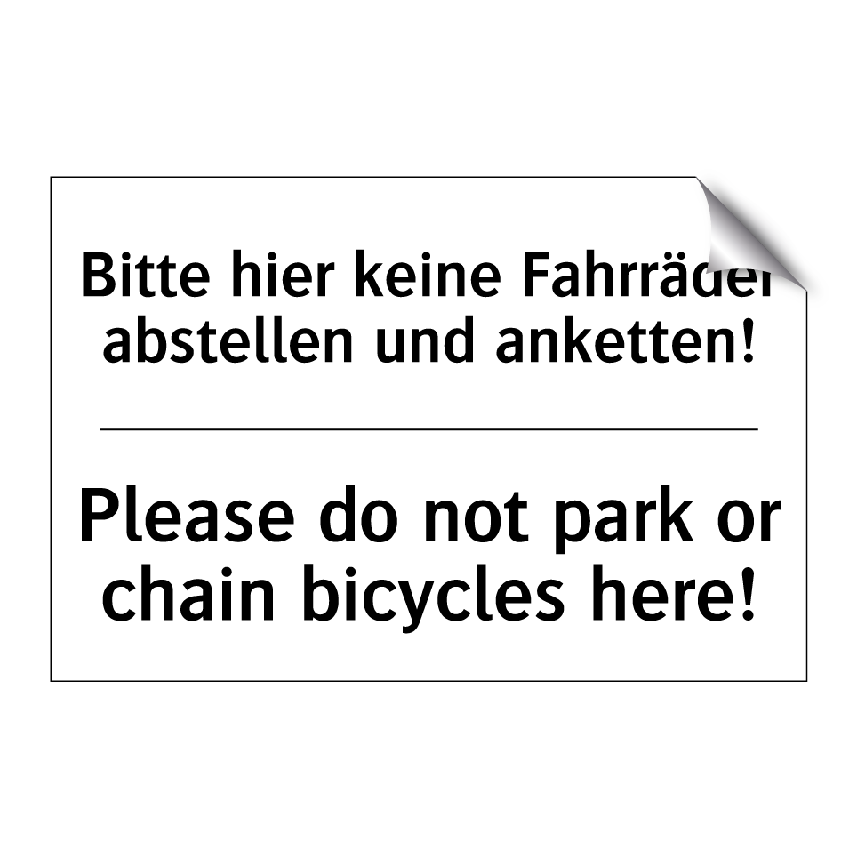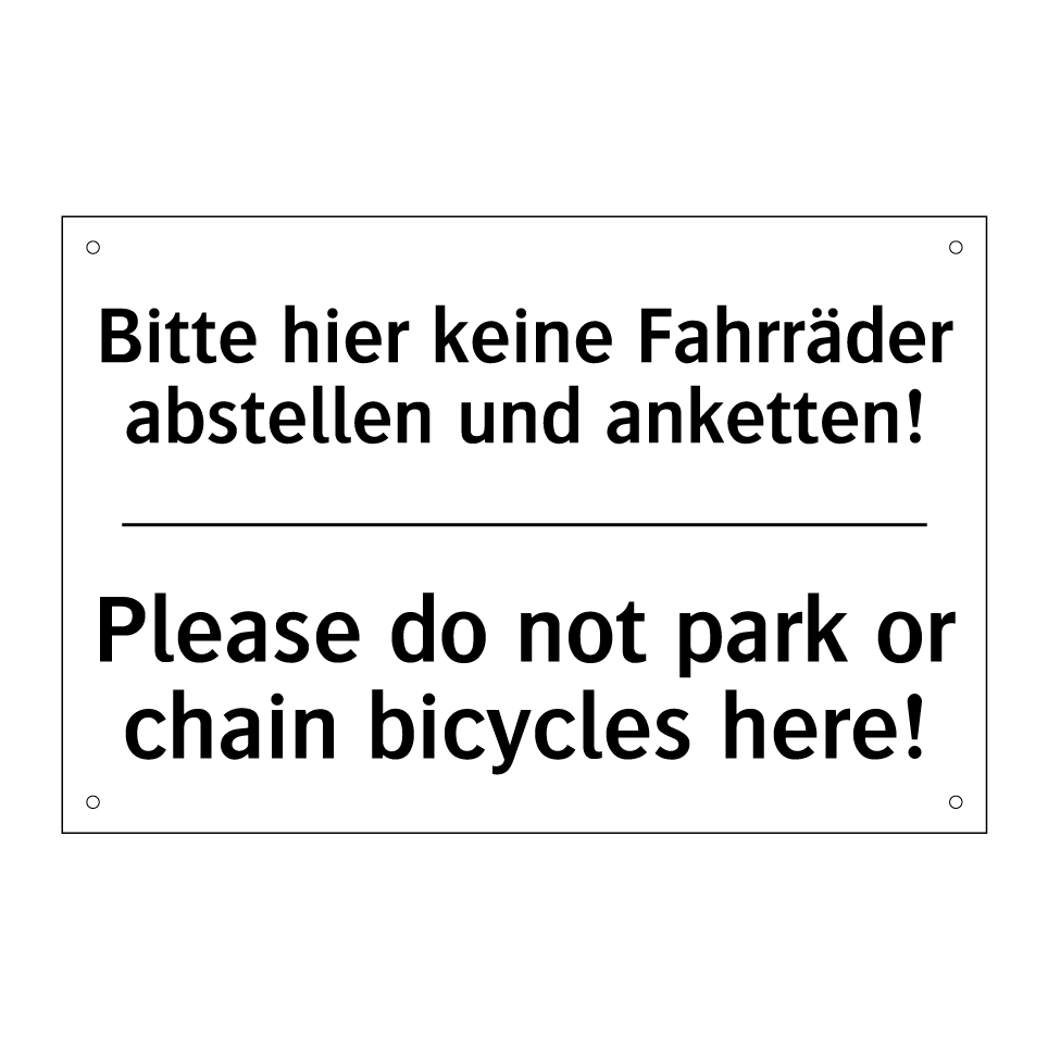 Zweisprachiges Verbotsschild mit deutschem Text Bitte hier keine Fahrräder abstellen und anketten! und englischem Text Please do not park or chain bicycles here!