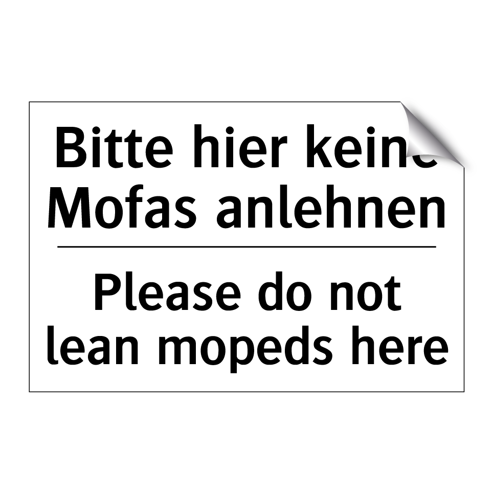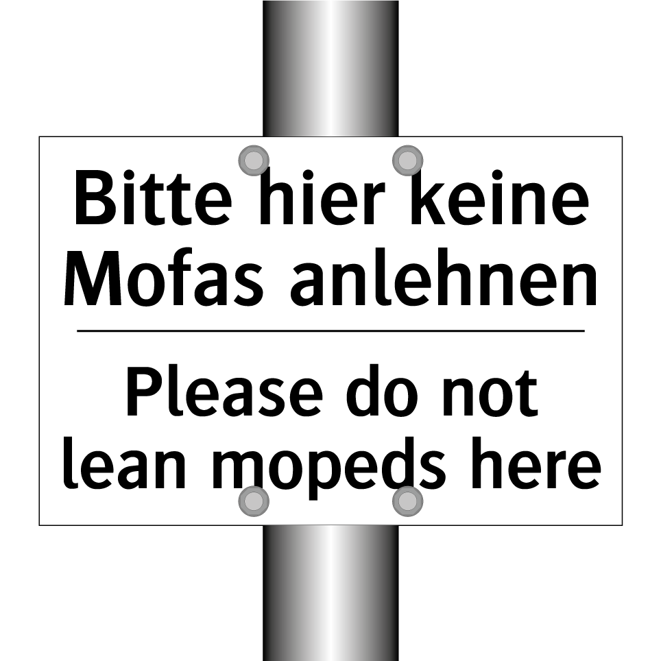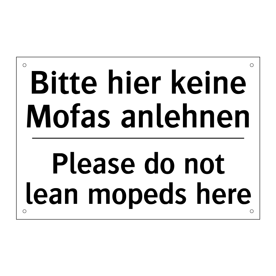 Zweisprachiges Verbotsschild mit deutschem Text Bitte hier keine Mofas anlehnen und englischem Text Please do not lean mopeds here