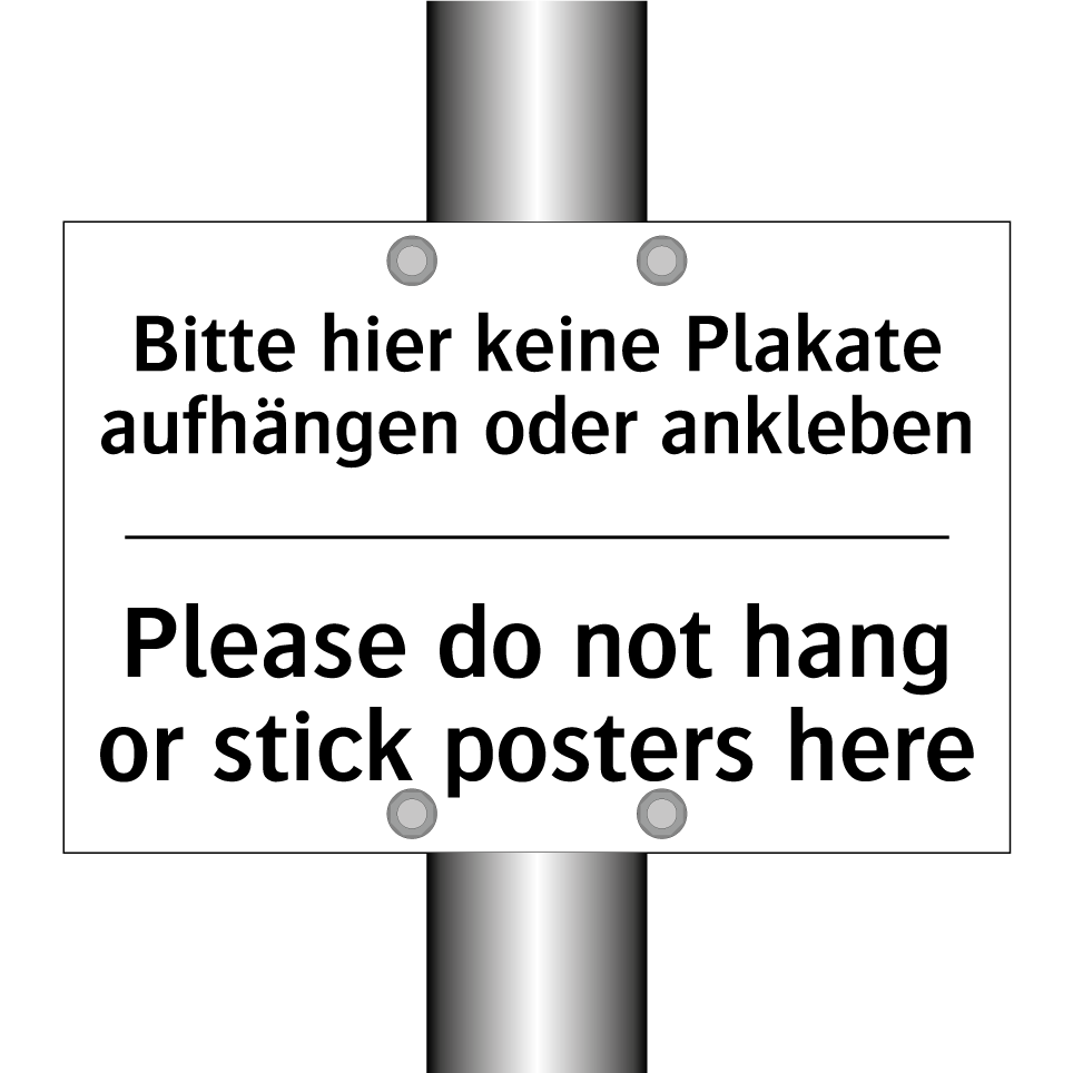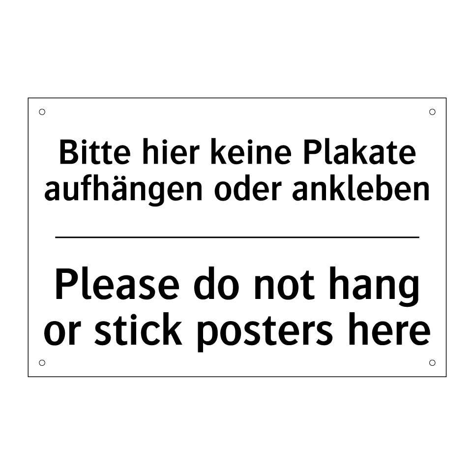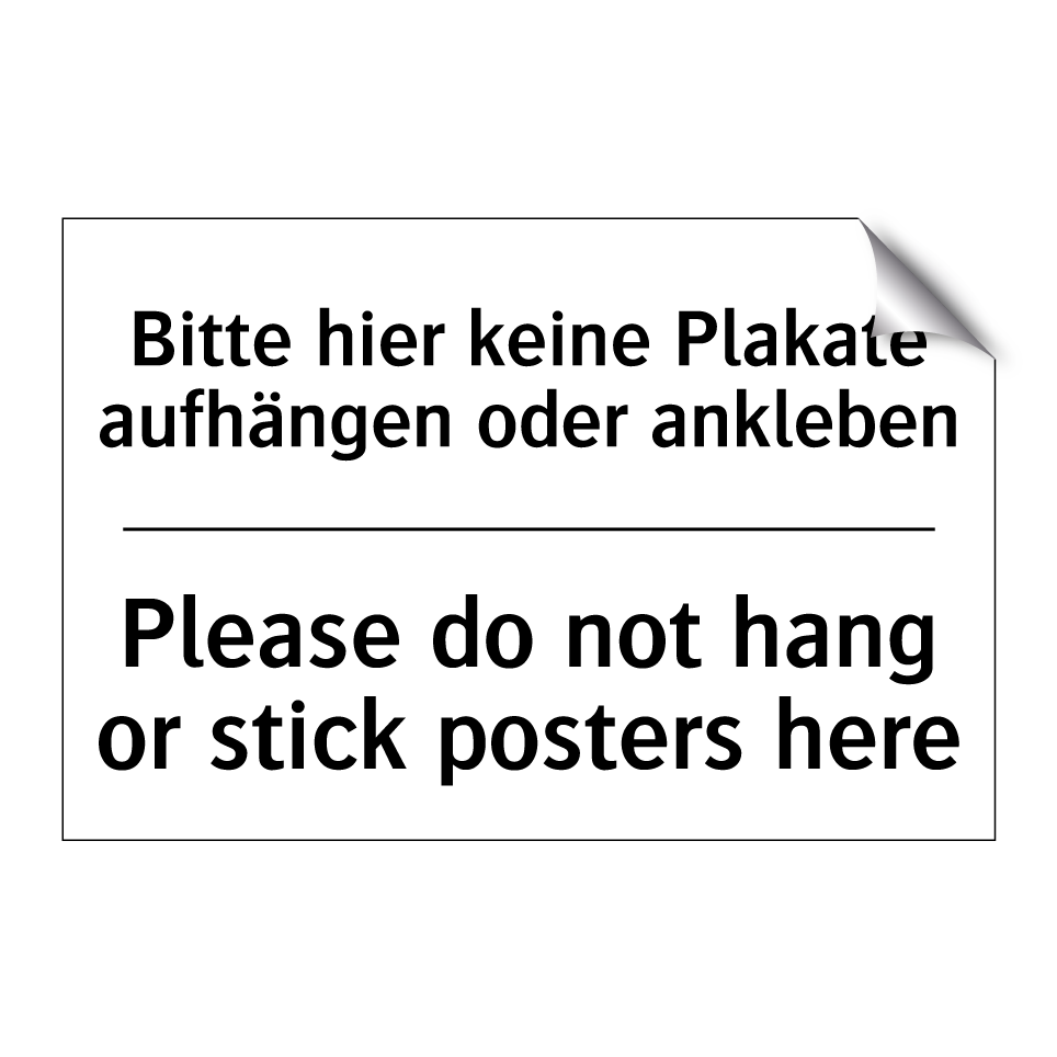 Zweisprachiges Verbotsschild mit deutschem Text Bitte hier keine Plakate aufhängen oder ankleben und englischem Text Please do not hang or stick posters here