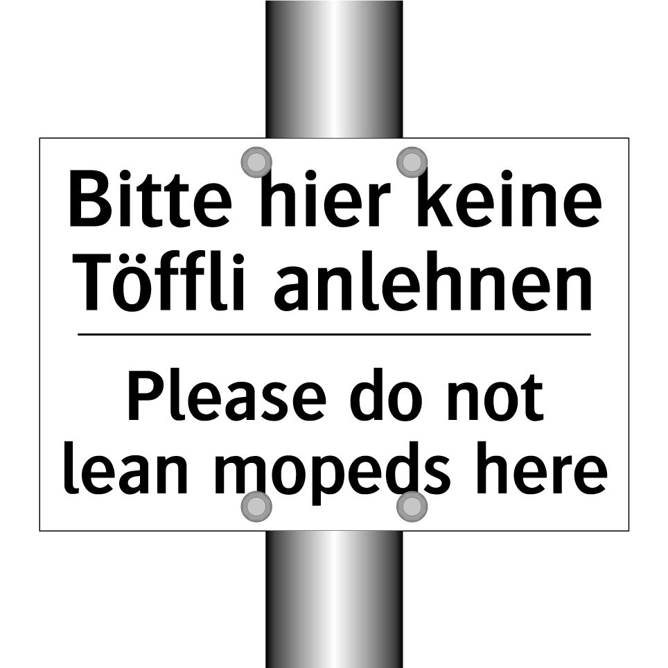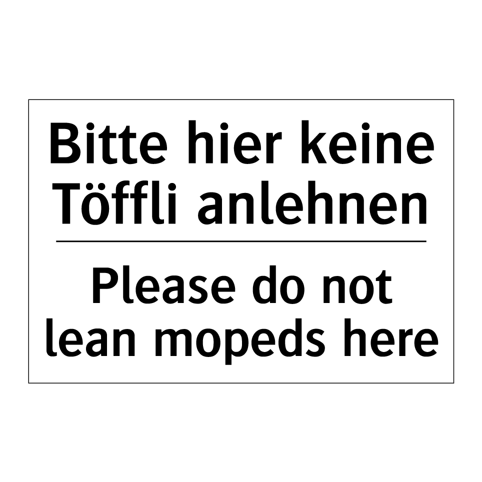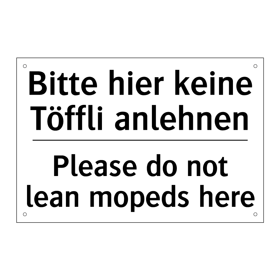 Zweisprachiges Verbotsschild mit deutschem Text Bitte hier keine Töffli anlehnen und englischem Text Please do not lean mopeds here
