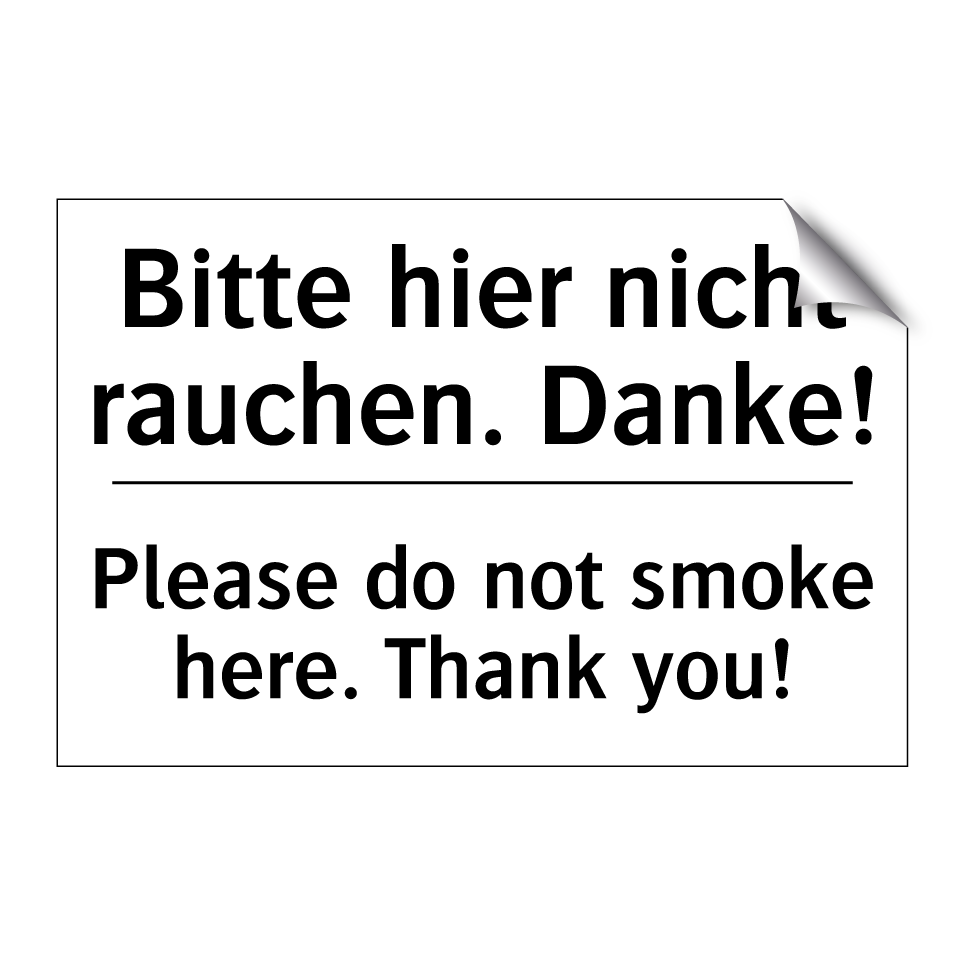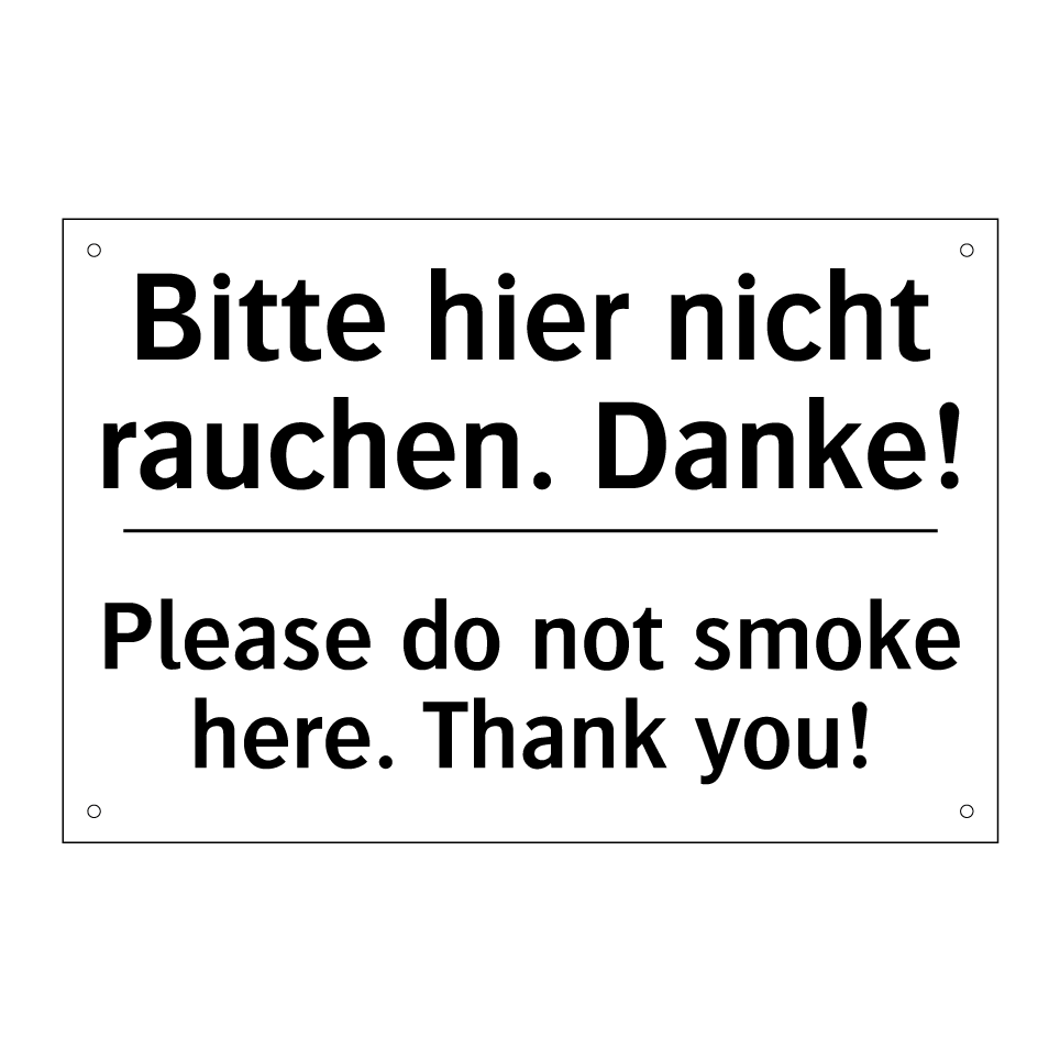 Zweisprachiges Verbotsschild mit deutschem Text Bitte hier nicht rauchen. Danke! und englischem Text Please do not smoke here. Thank you!