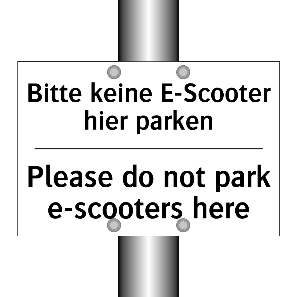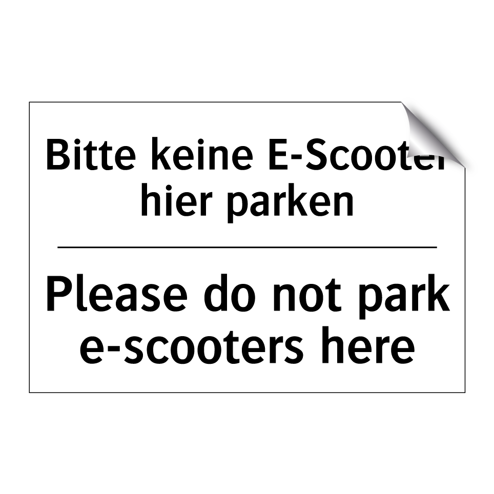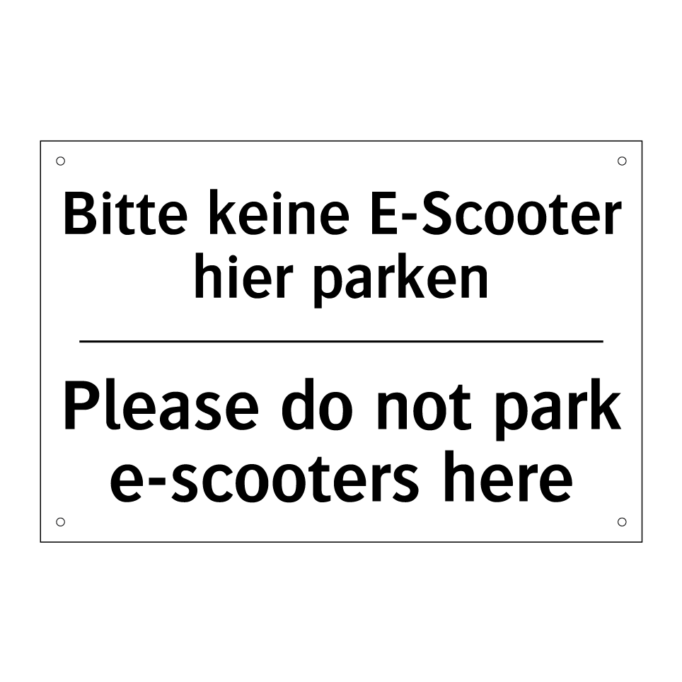 Zweisprachiges Verbotsschild mit deutschem Text Bitte keine E-Scooter hier parken und englischem Text Please do not park e-scooters here