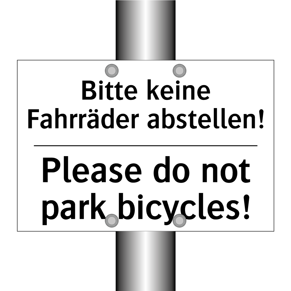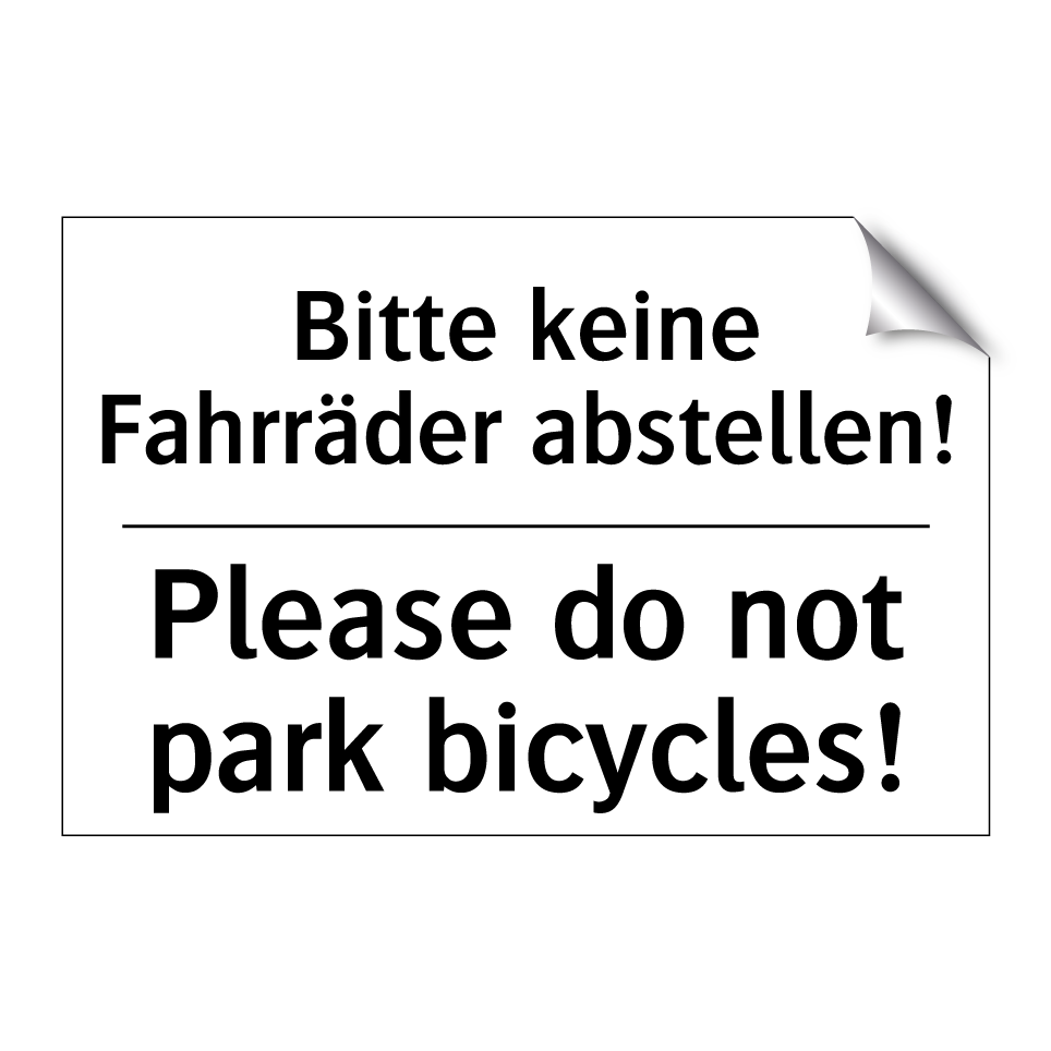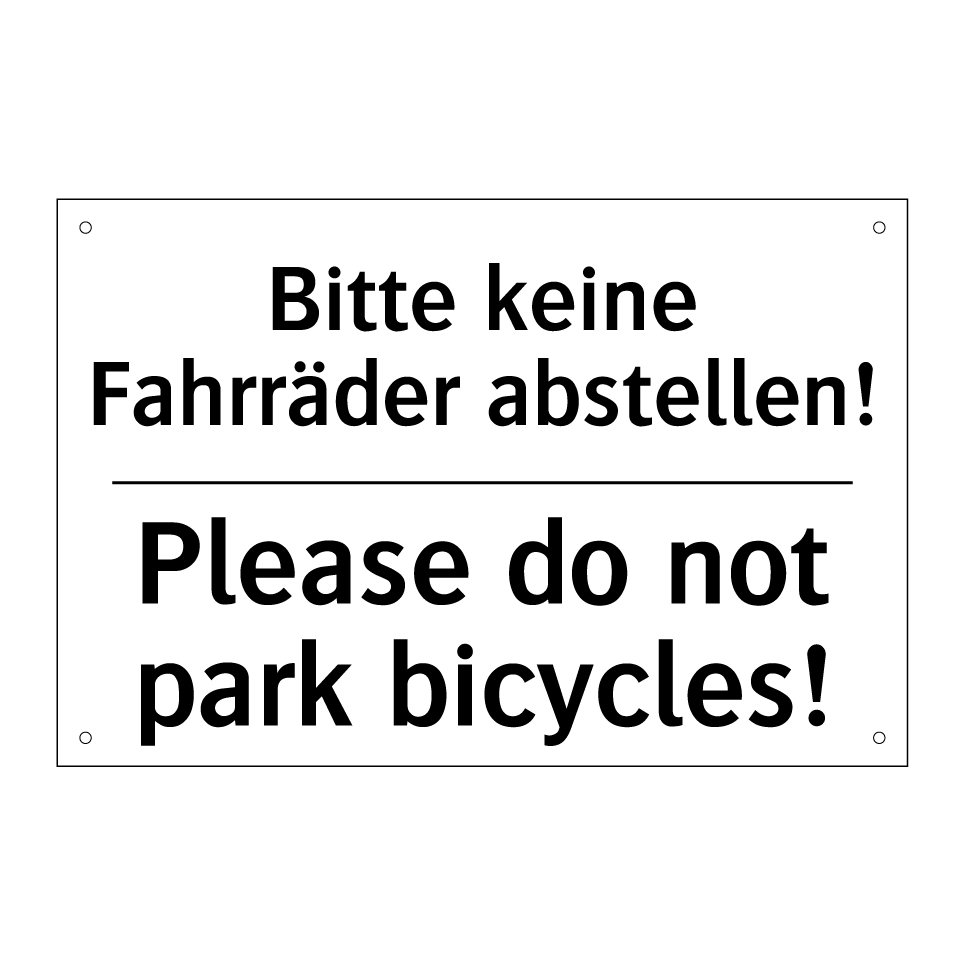 Zweisprachiges Verbotsschild mit deutschem Text Bitte keine Fahrräder abstellen! und englischem Text Please do not park bicycles!
