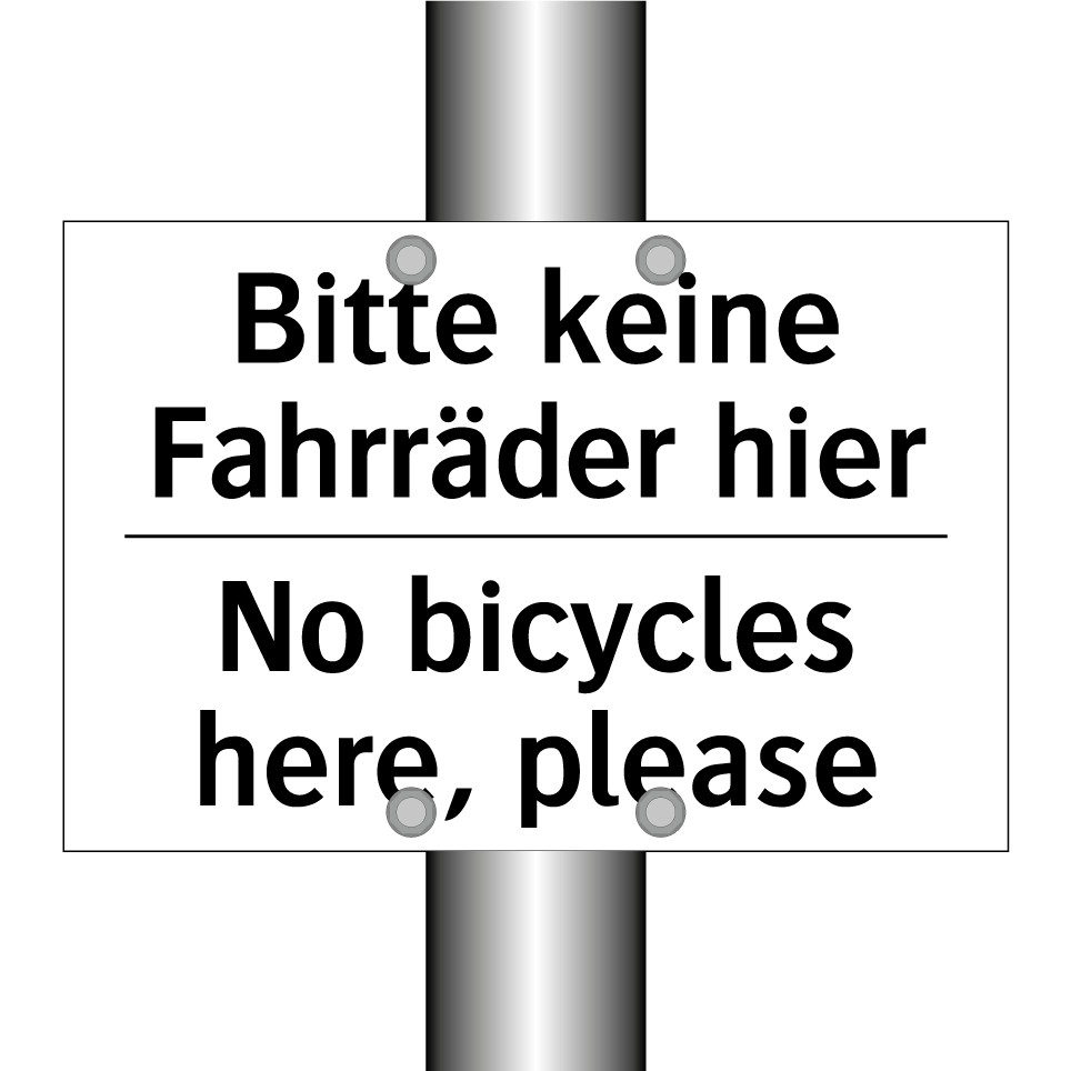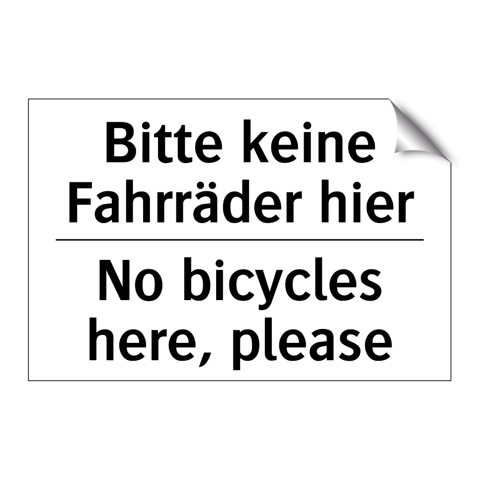 Zweisprachiges Verbotsschild mit deutschem Text Bitte keine Fahrräder hier und englischem Text No bicycles here, please