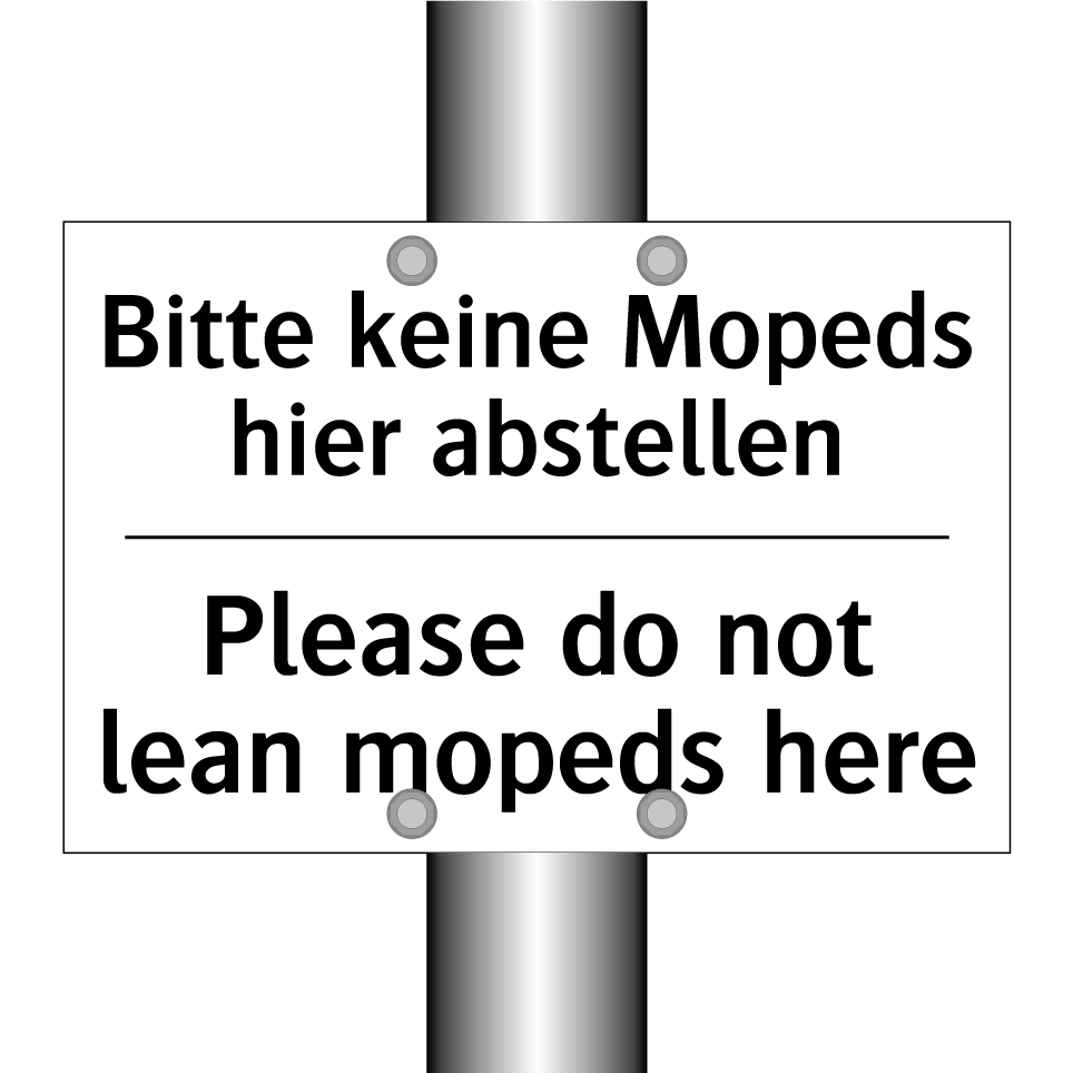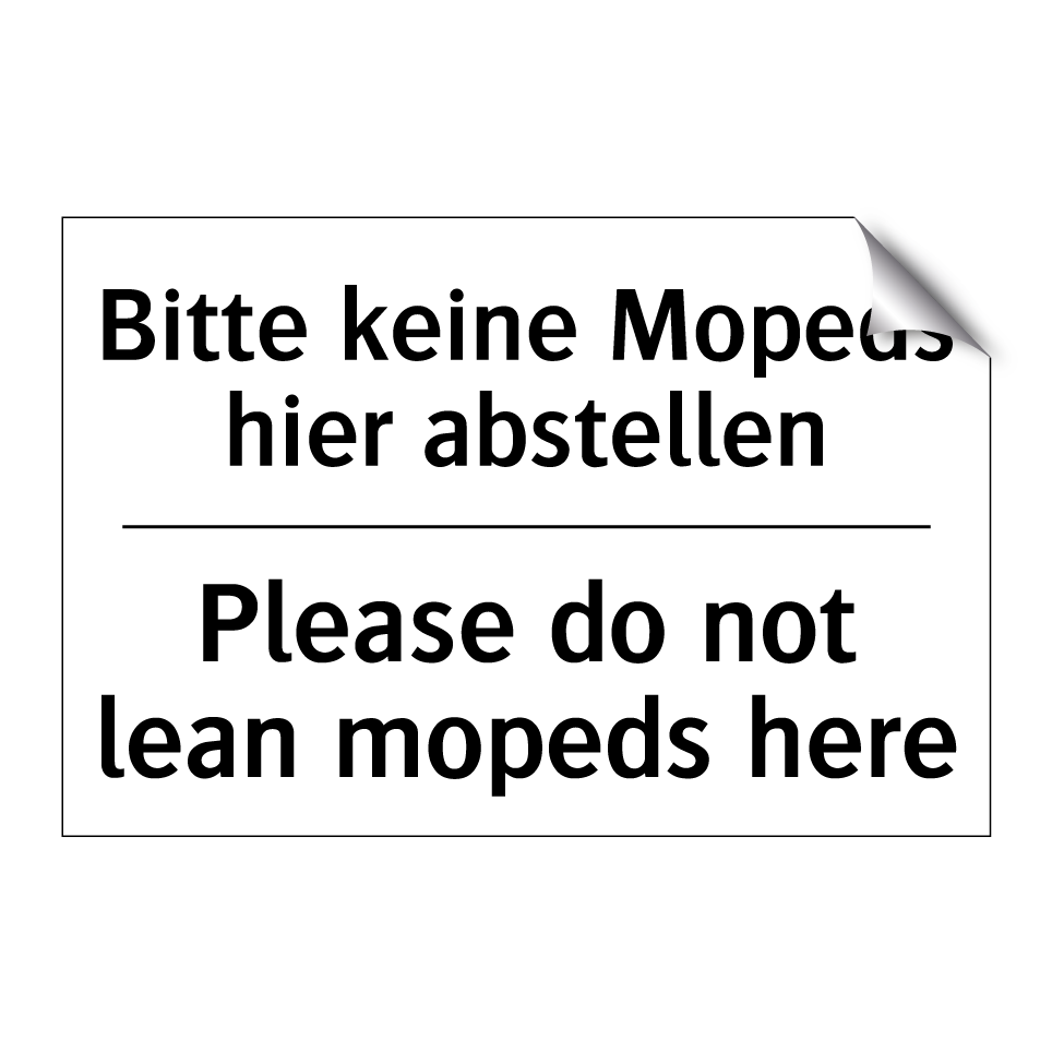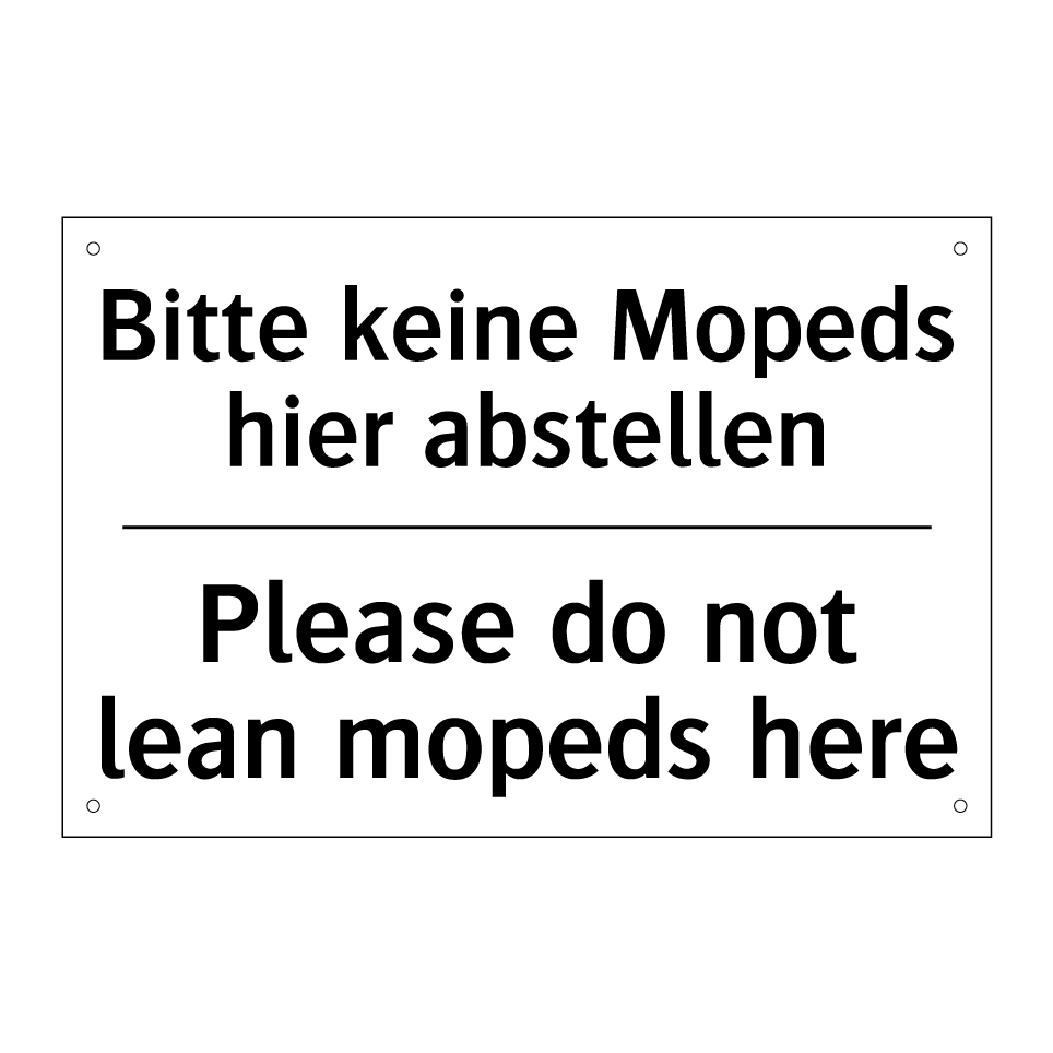 Zweisprachiges Verbotsschild mit deutschem Text Bitte keine Mopeds hier abstellen und englischem Text Please do not lean mopeds here