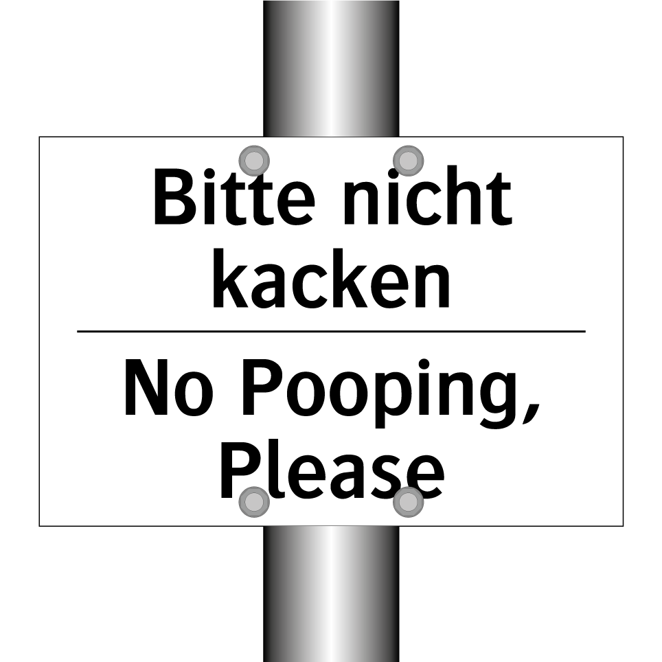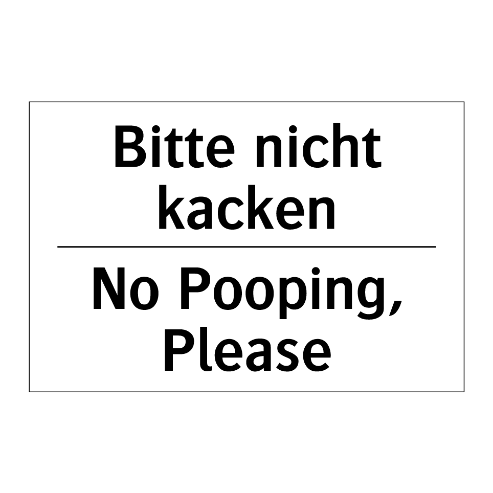 Zweisprachiges Verbotsschild mit deutschem Text Bitte nicht kacken und englischem Text No Pooping, Please