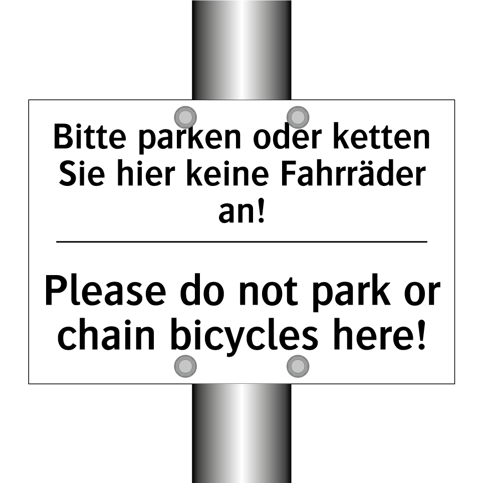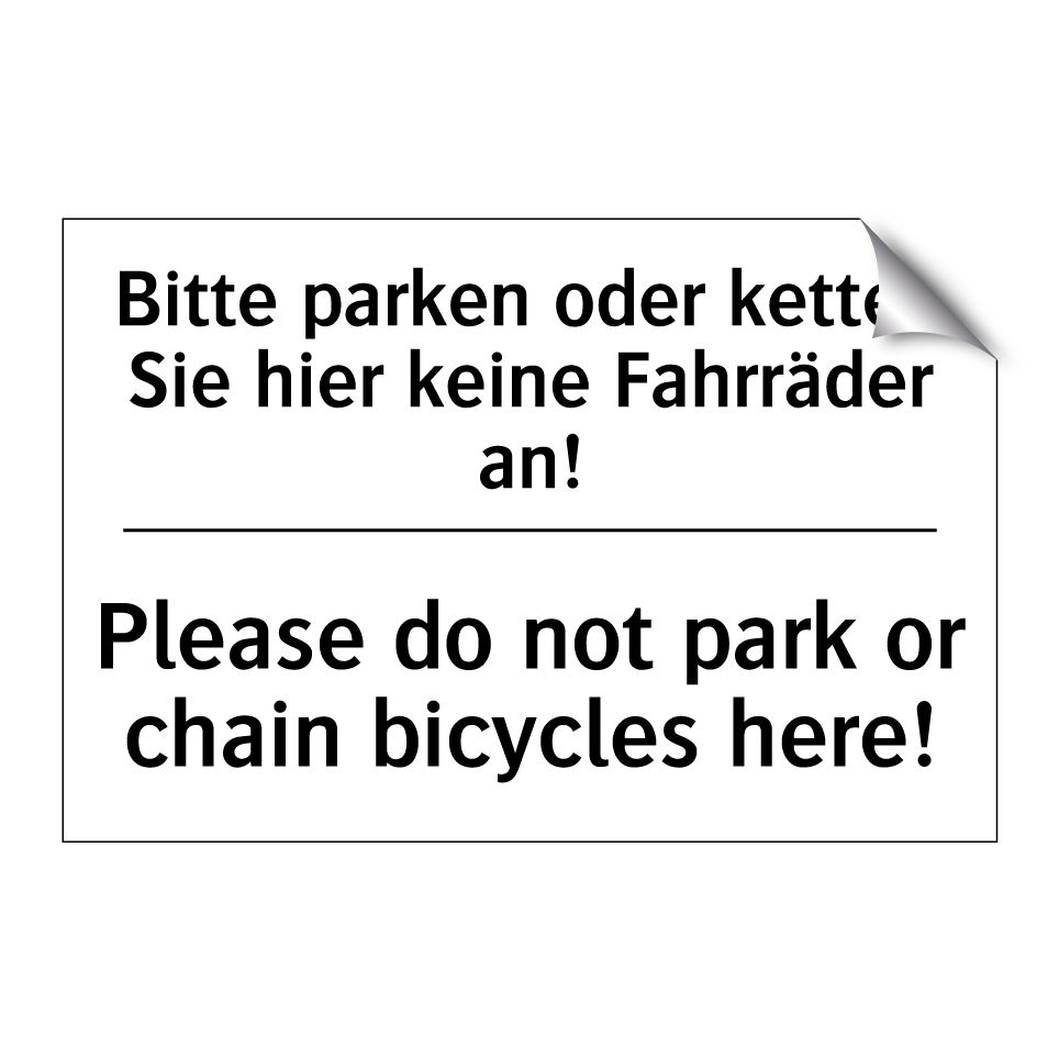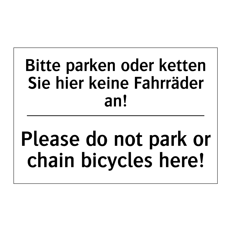 Zweisprachiges Verbotsschild mit deutschem Text Bitte parken oder ketten Sie hier keine Fahrräder an! und englischem Text Please do not park or chain bicycles here!