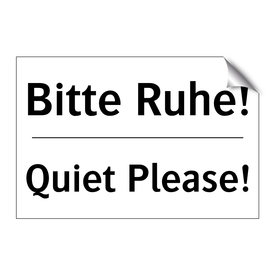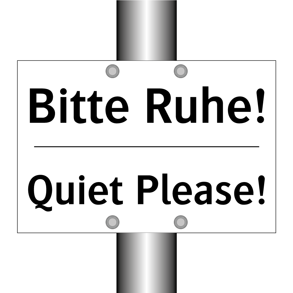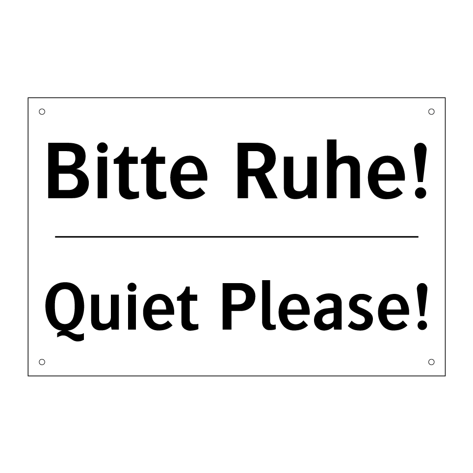 Zweisprachiges Verbotsschild mit deutschem Text Bitte Ruhe! und englischem Text Quiet Please!