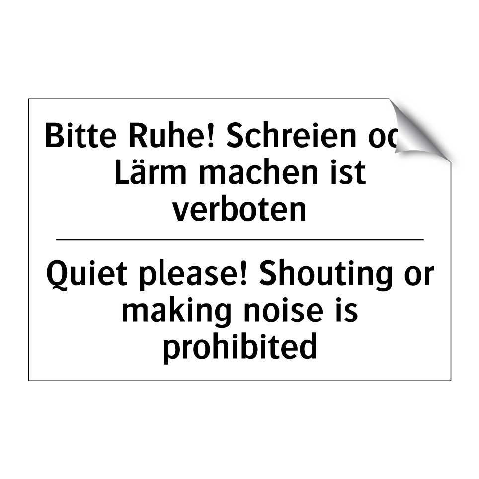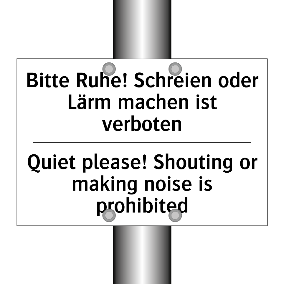 Zweisprachiges Verbotsschild mit deutschem Text Bitte Ruhe! Schreien oder Lärm machen ist verboten und englischem Text Quiet please! Shouting or making noise is prohibited